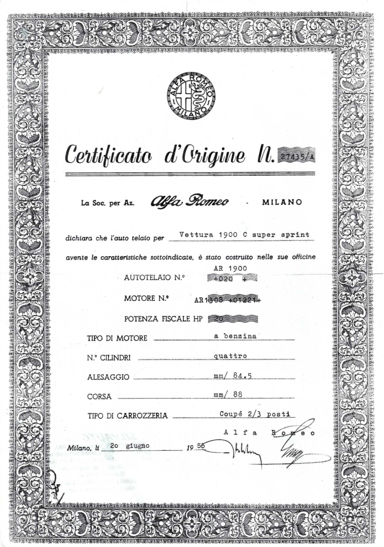 - DISPONIBILE SCHEDA DI PRODUZIONE RILASCIATA DA CENTRO DOCUMENTAZIONE ALFA ROMEO CHE DICHIARA L’ORIGINALITA’ DELLA VETTURA, ANCORA CORRISPONDENTE ALLA CONFIGURAZIONE DA NUOVA, PRODOTTA NELL’APRILE DEL 1955 E VENDUTA IN DATA 16 GIUGNO 1955 – UNA DI SOLI 299 ESEMPLARI REALIZZATI DAL 1954 AL 1955 – PRESENTE ANCHE CERTIFICATO D’ORIGINE DEGLI ARCHIVI STORICI ALFA ROMEO