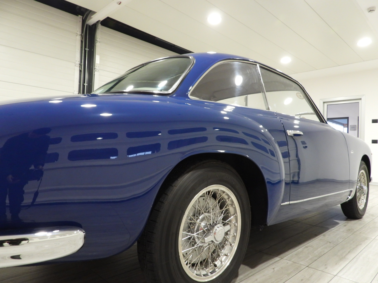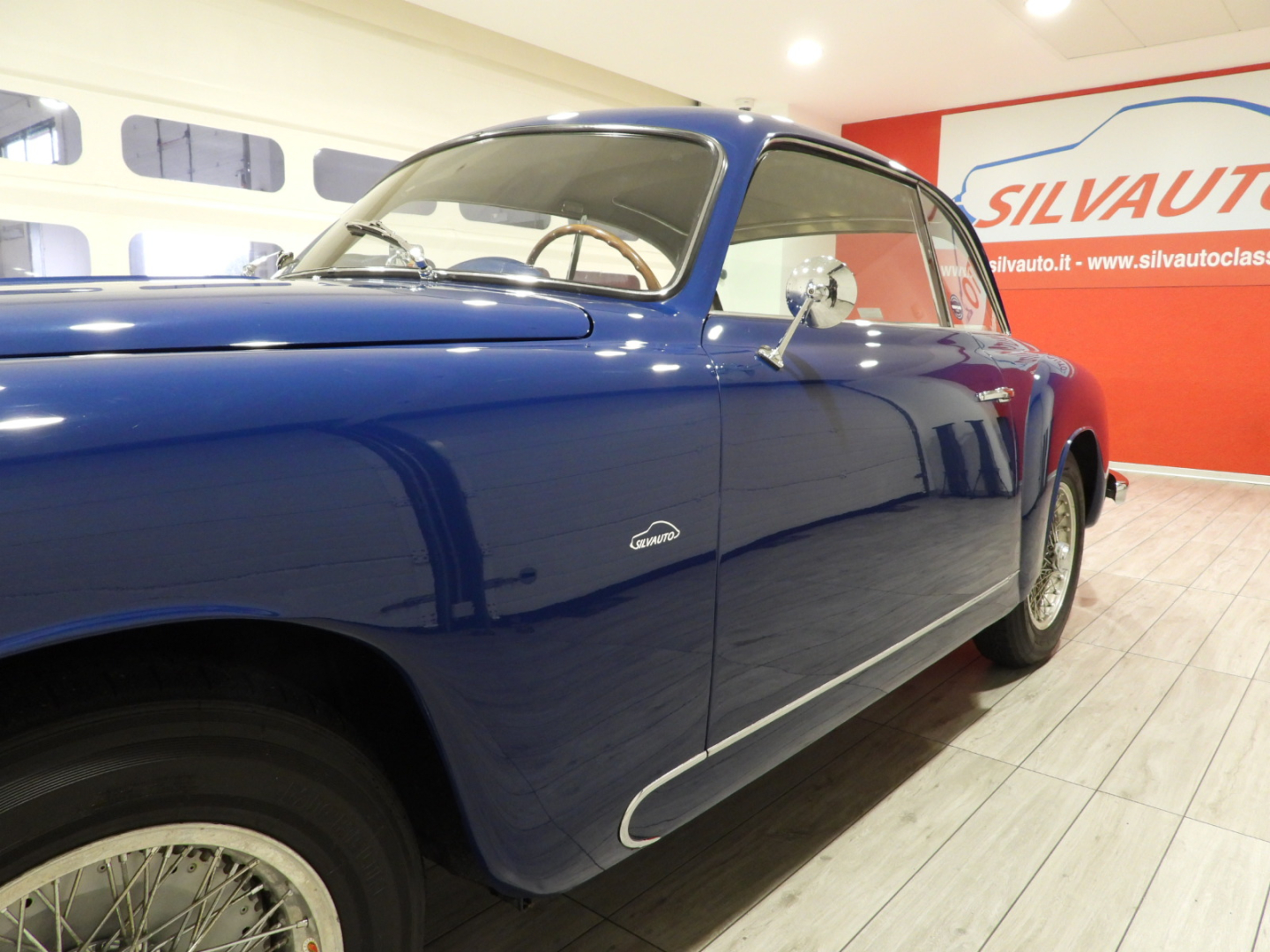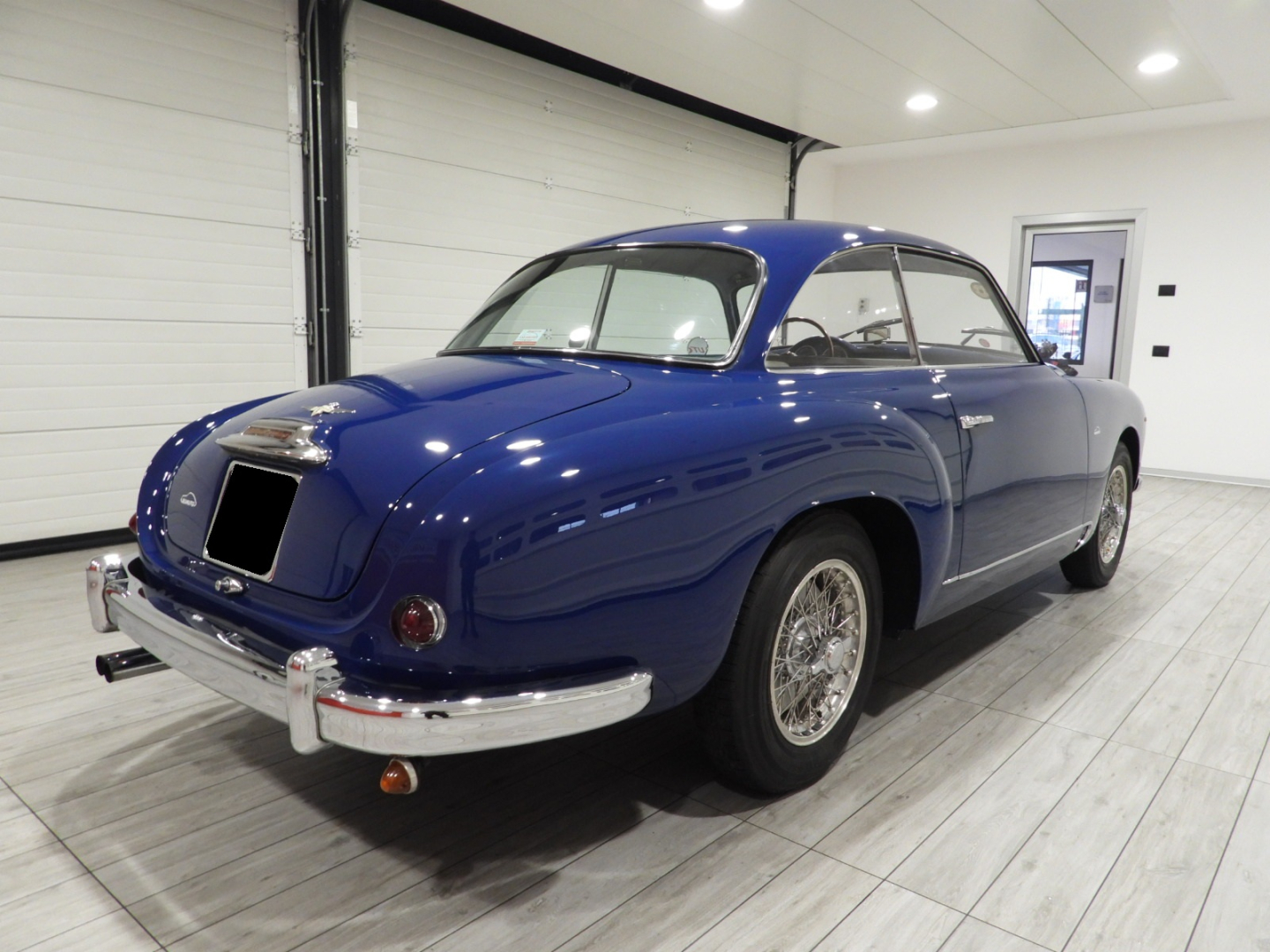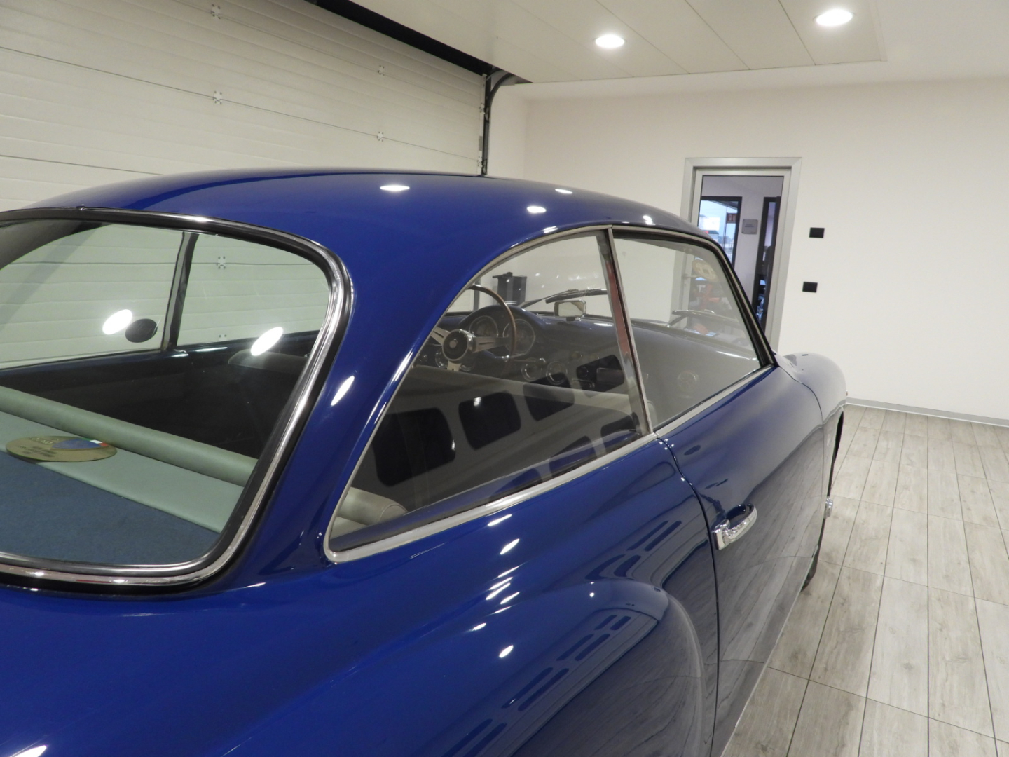 Sedili e pannelli in Vipla grigia e panno lana blu, Moquette in lana grigia al pavimento, Volante Nardi a tre razze con corona in legno accessorio originale dell’epoca, Finestrini posteriori fissi in plexiglass, Specchio esterno lato guida cromato, 5 cerchi Borrani a raggi cromati con gallettone con pneumatici Michelin 165R400, Fari supplementari tondi Marchall di profondita’ a luce gialla