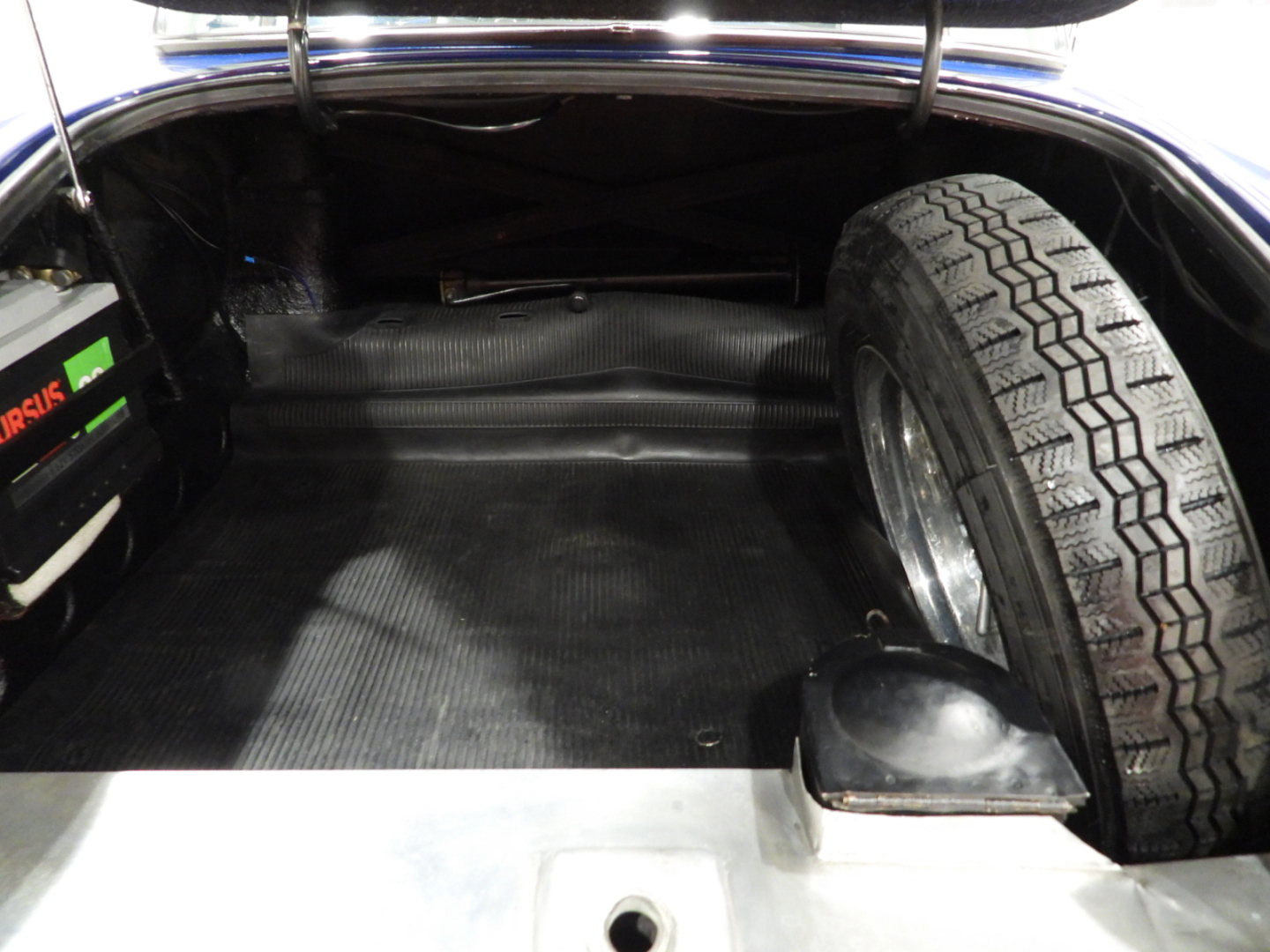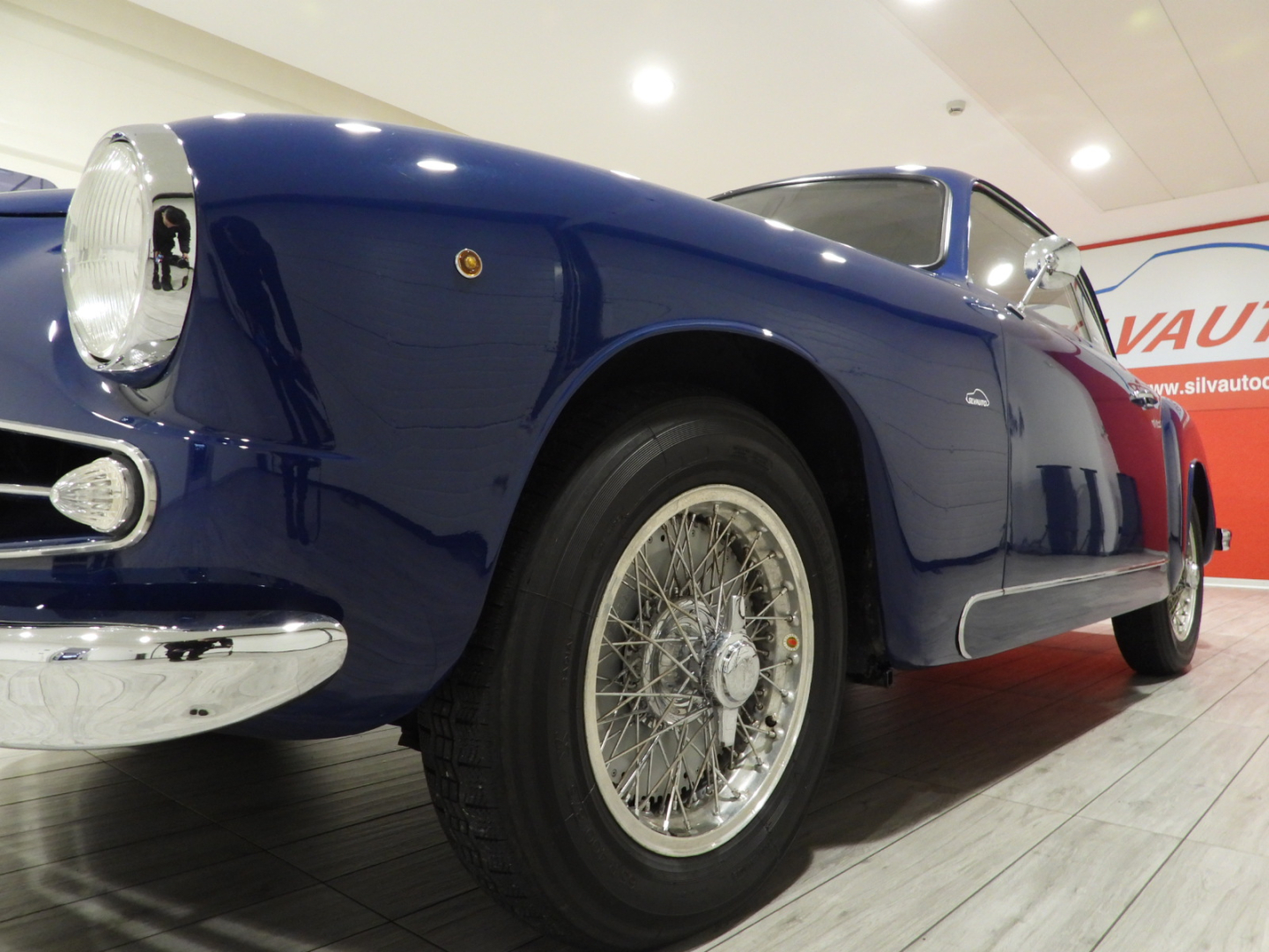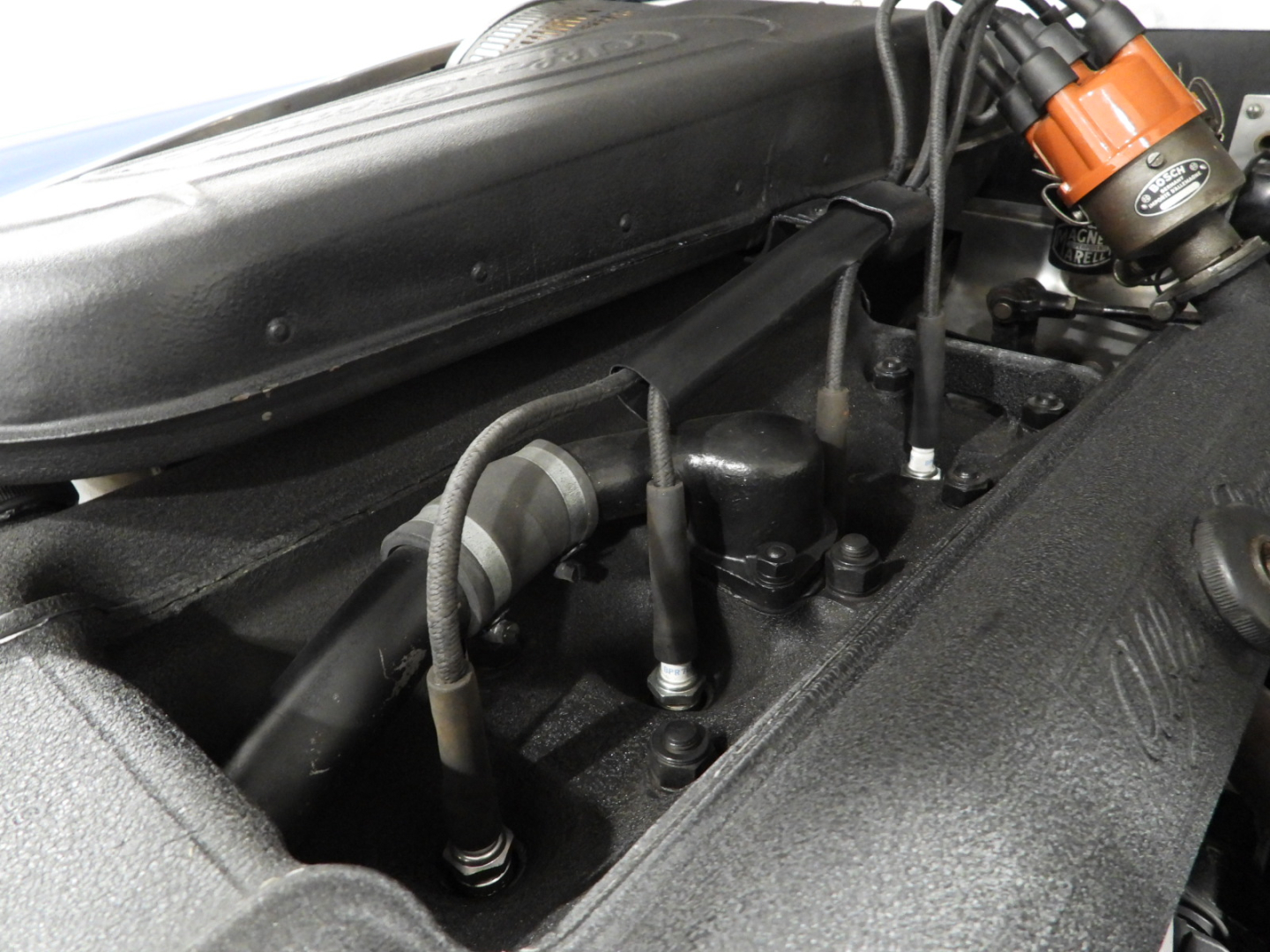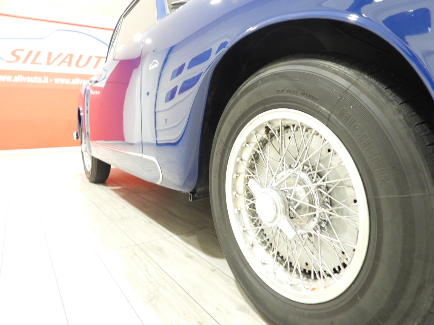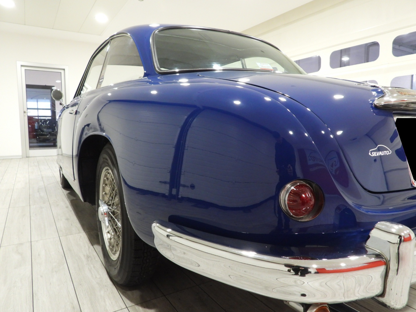 Sedili e pannelli in Vipla grigia e panno lana blu, Moquette in lana grigia al pavimento, Volante Nardi a tre razze con corona in legno accessorio originale dell’epoca, Finestrini posteriori fissi in plexiglass, Specchio esterno lato guida cromato, 5 cerchi Borrani a raggi cromati con gallettone con pneumatici Michelin 165R400, Fari supplementari tondi Marchall di profondita’ a luce gialla