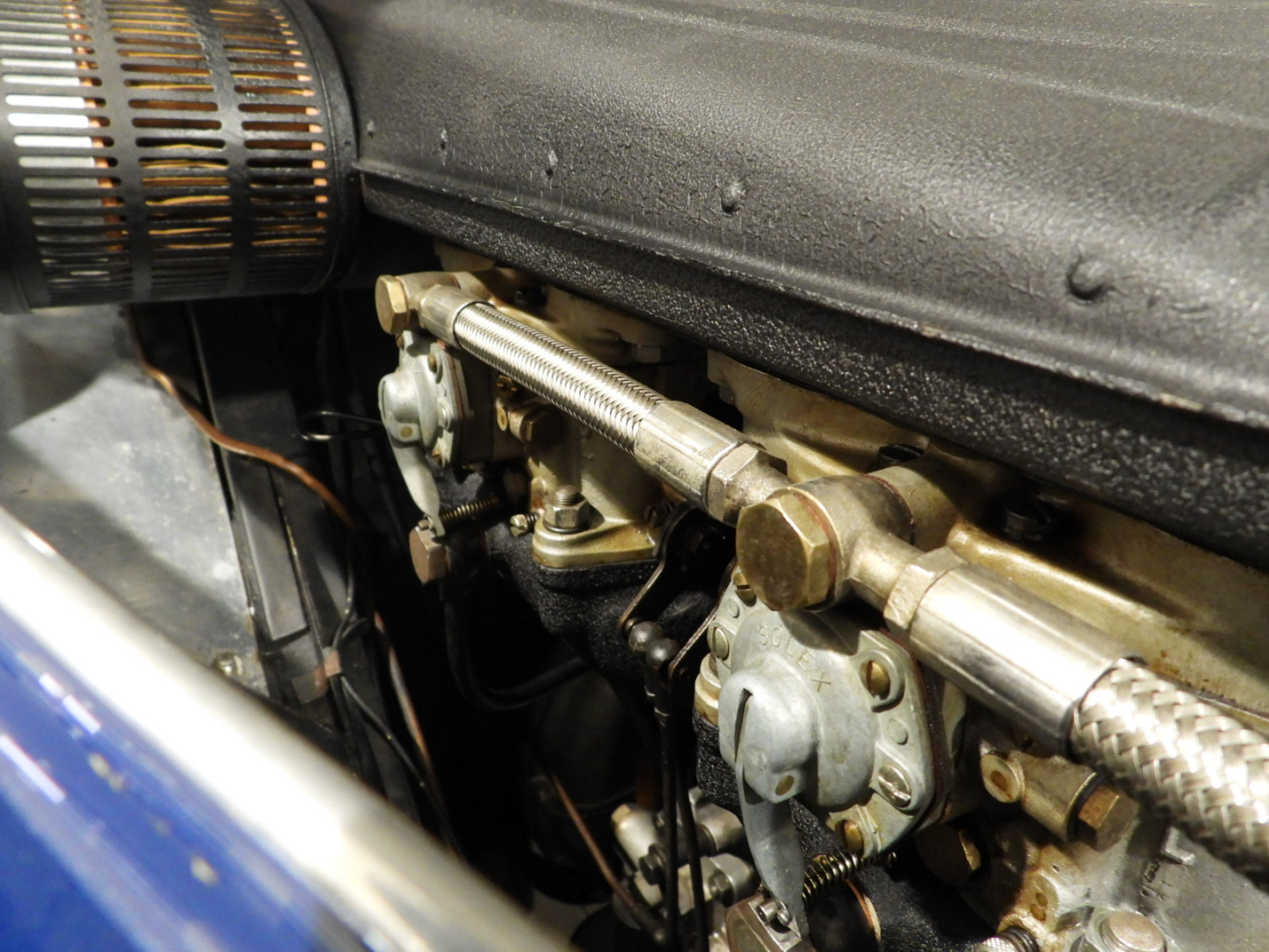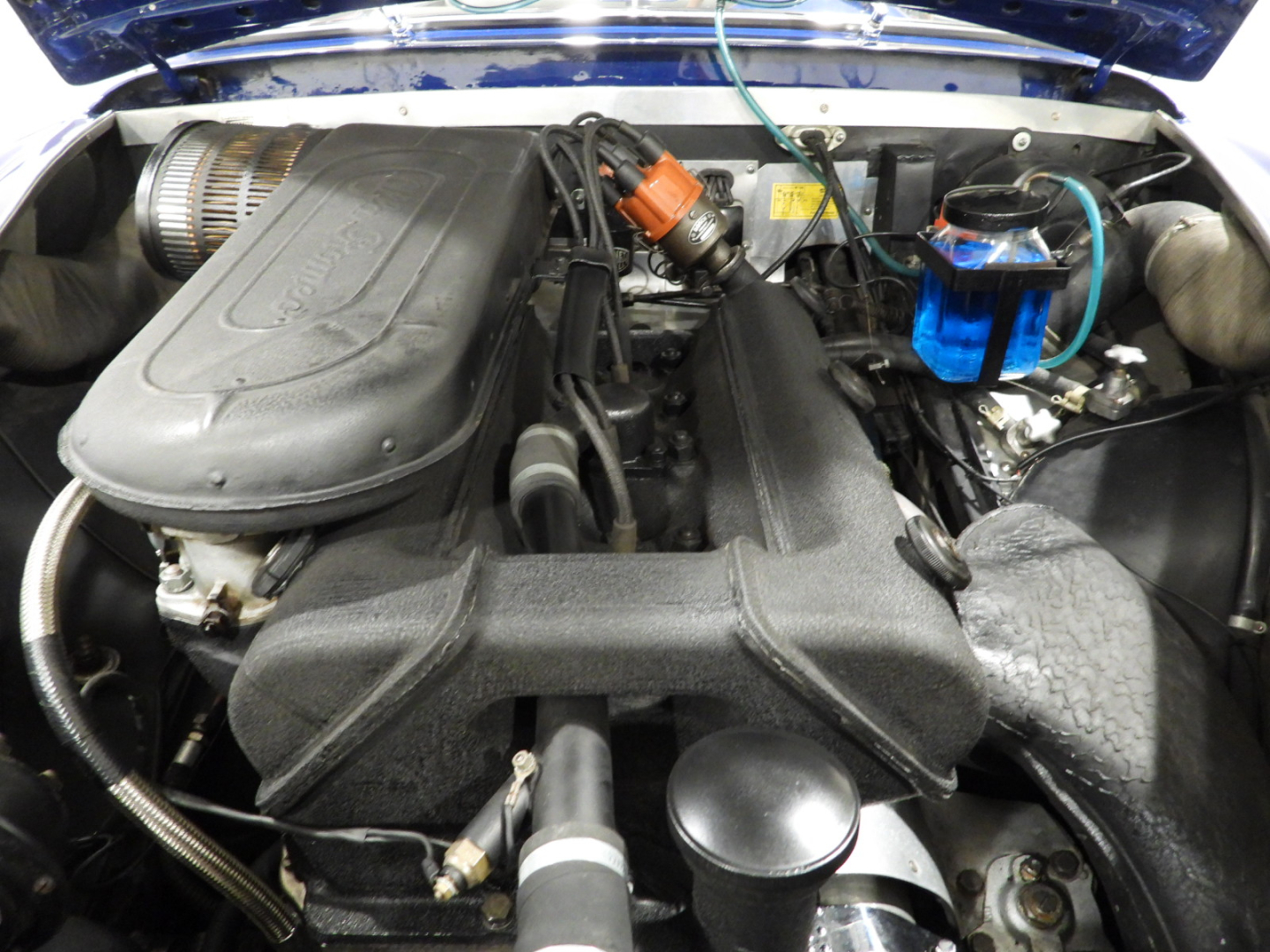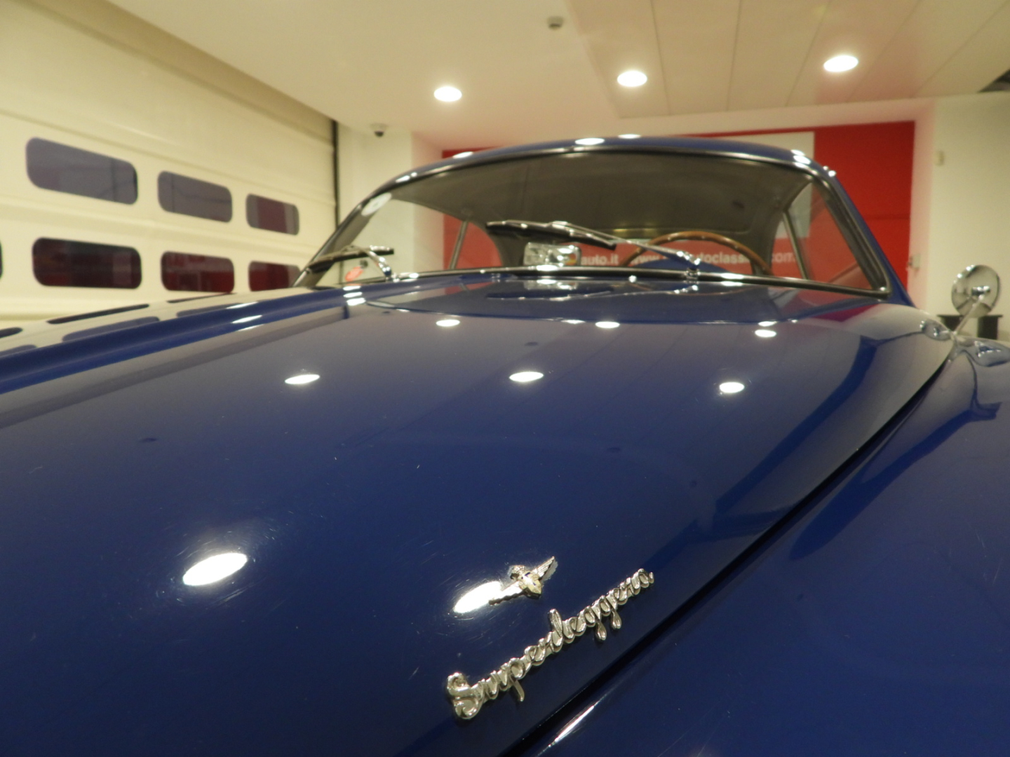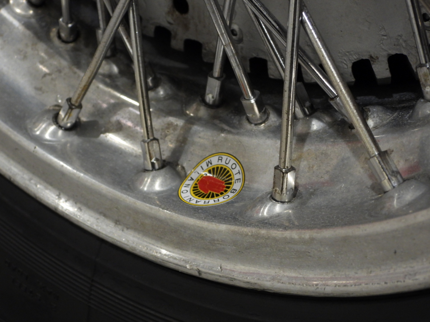 Sedili e pannelli in Vipla grigia e panno lana blu, Moquette in lana grigia al pavimento, Volante Nardi a tre razze con corona in legno accessorio originale dell’epoca, Finestrini posteriori fissi in plexiglass, Specchio esterno lato guida cromato, 5 cerchi Borrani a raggi cromati con gallettone con pneumatici Michelin 165R400, Fari supplementari tondi Marchall di profondita’ a luce gialla