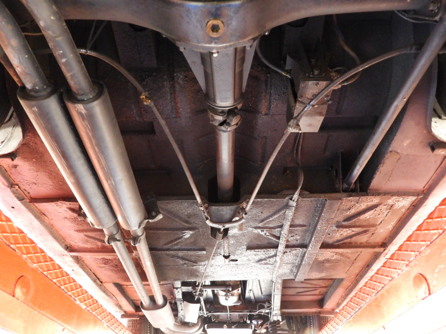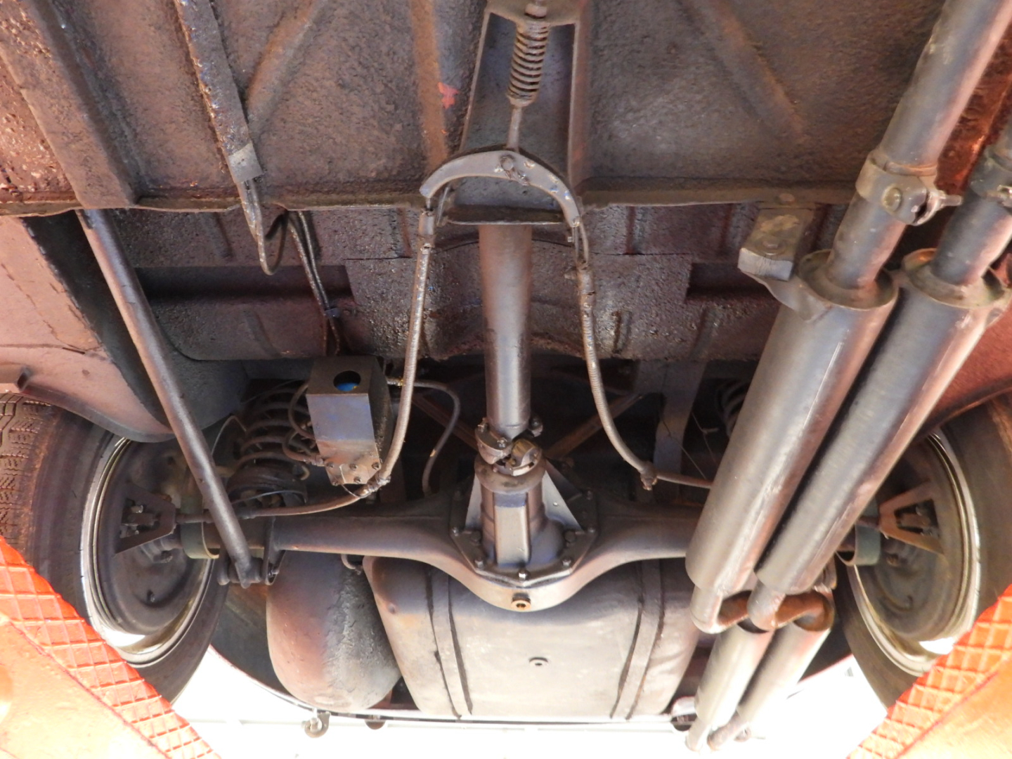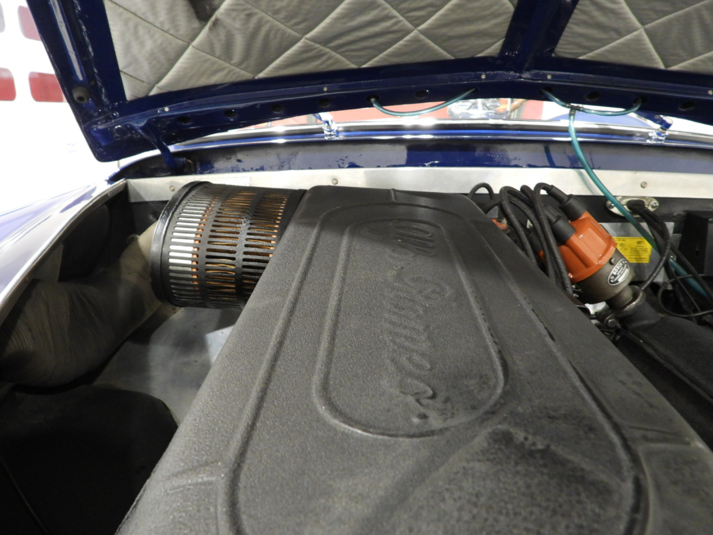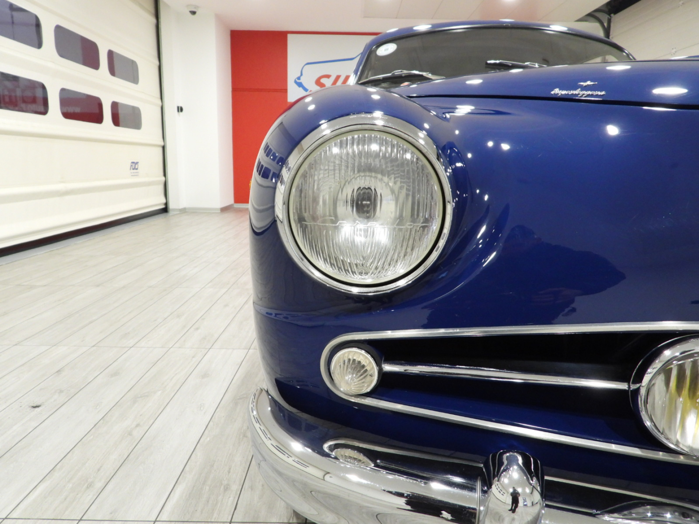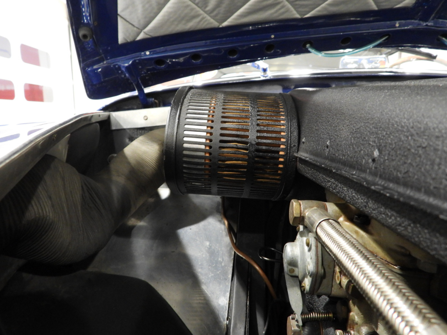 Sedili e pannelli in Vipla grigia e panno lana blu, Moquette in lana grigia al pavimento, Volante Nardi a tre razze con corona in legno accessorio originale dell’epoca, Finestrini posteriori fissi in plexiglass, Specchio esterno lato guida cromato, 5 cerchi Borrani a raggi cromati con gallettone con pneumatici Michelin 165R400, Fari supplementari tondi Marchall di profondita’ a luce gialla