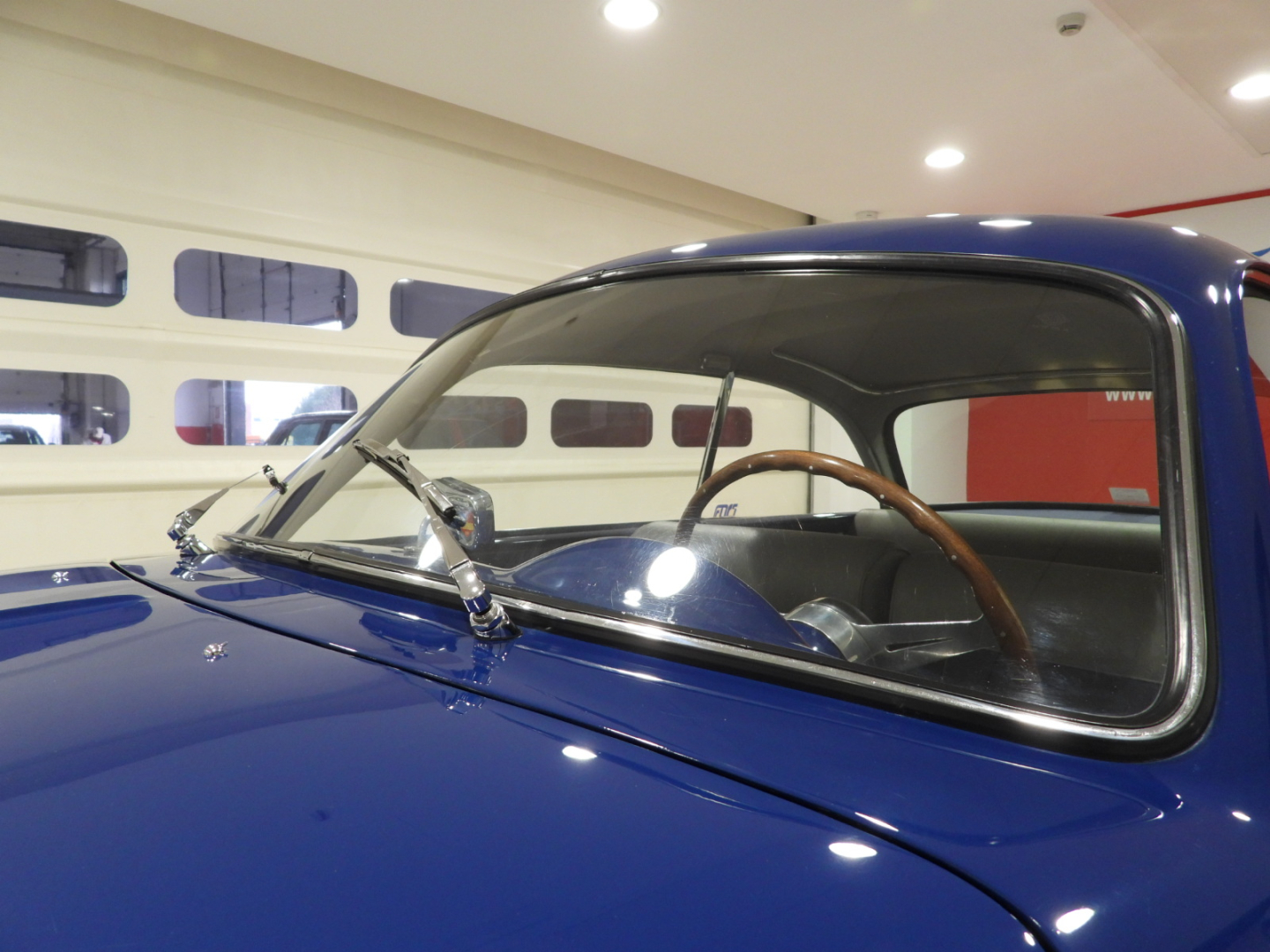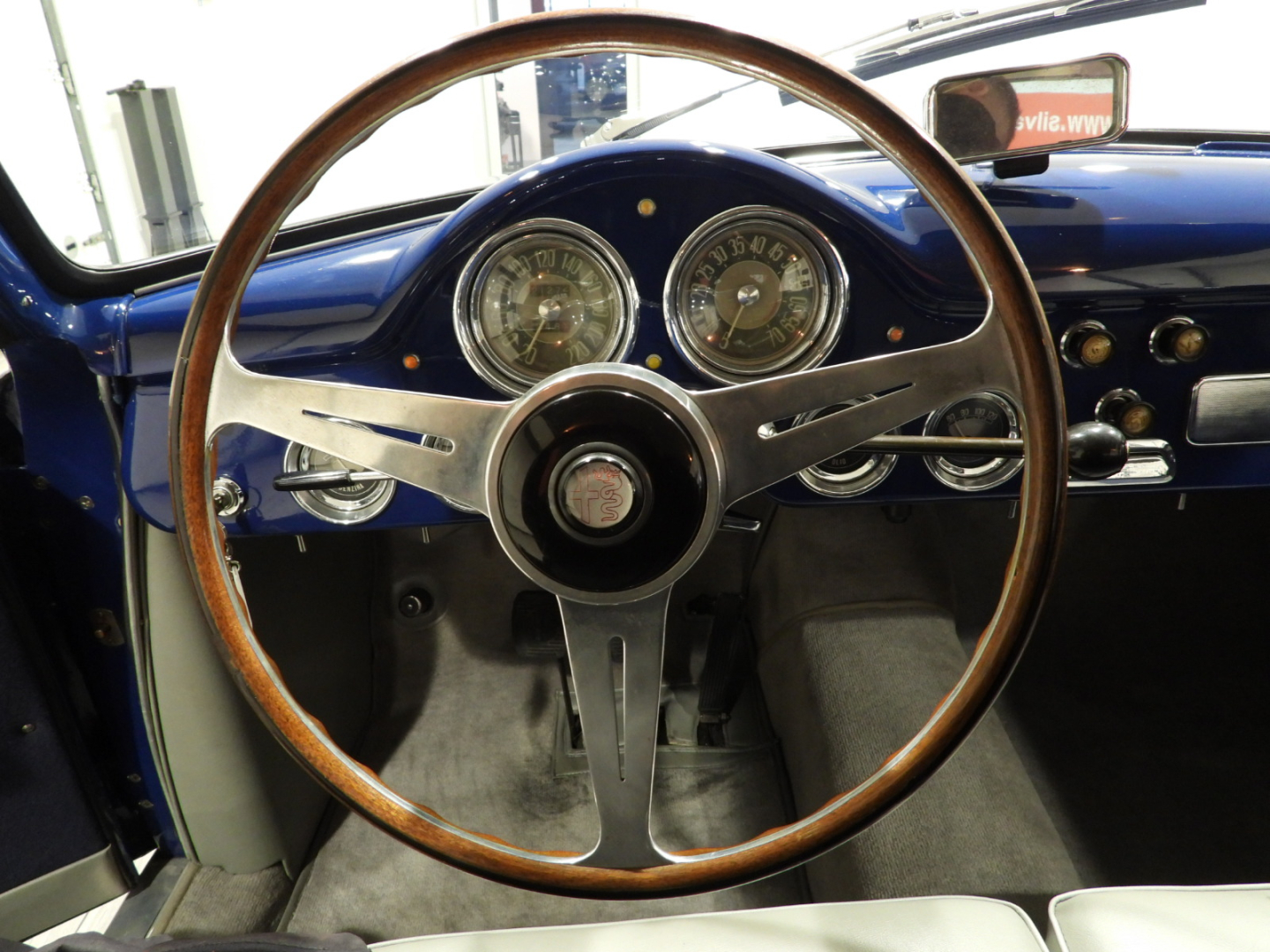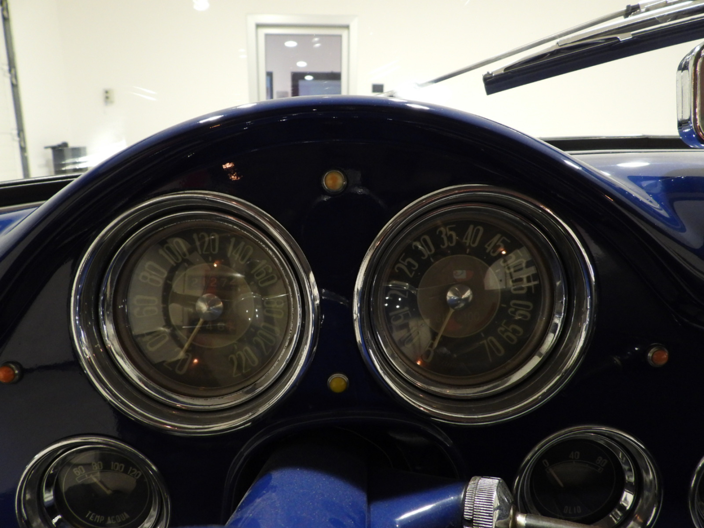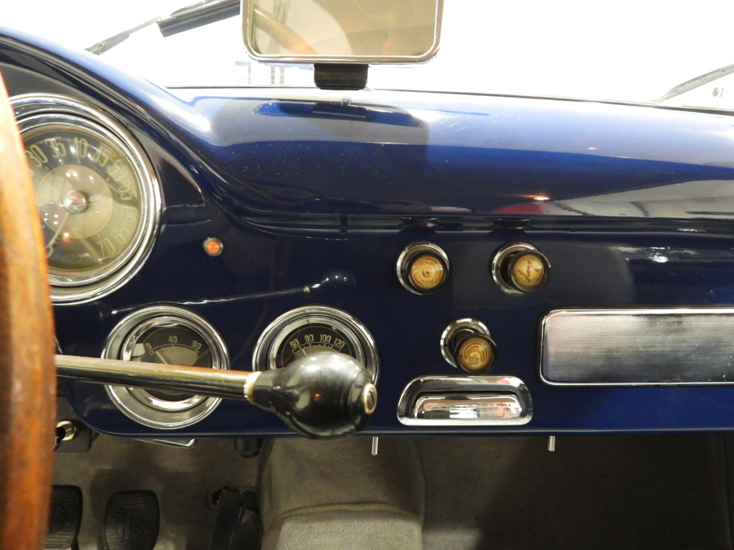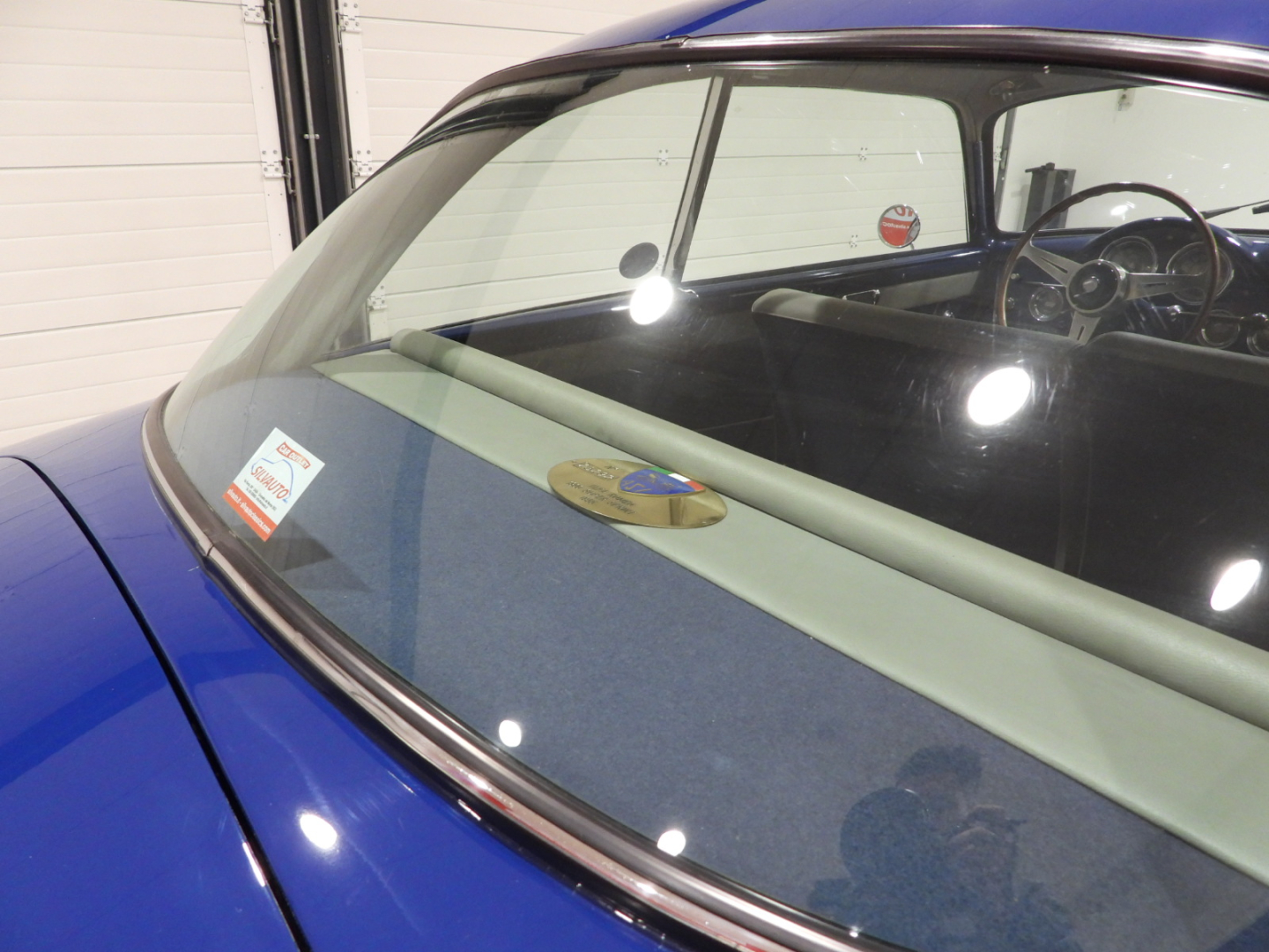 Sedili e pannelli in Vipla grigia e panno lana blu, Moquette in lana grigia al pavimento, Volante Nardi a tre razze con corona in legno accessorio originale dell’epoca, Finestrini posteriori fissi in plexiglass…
