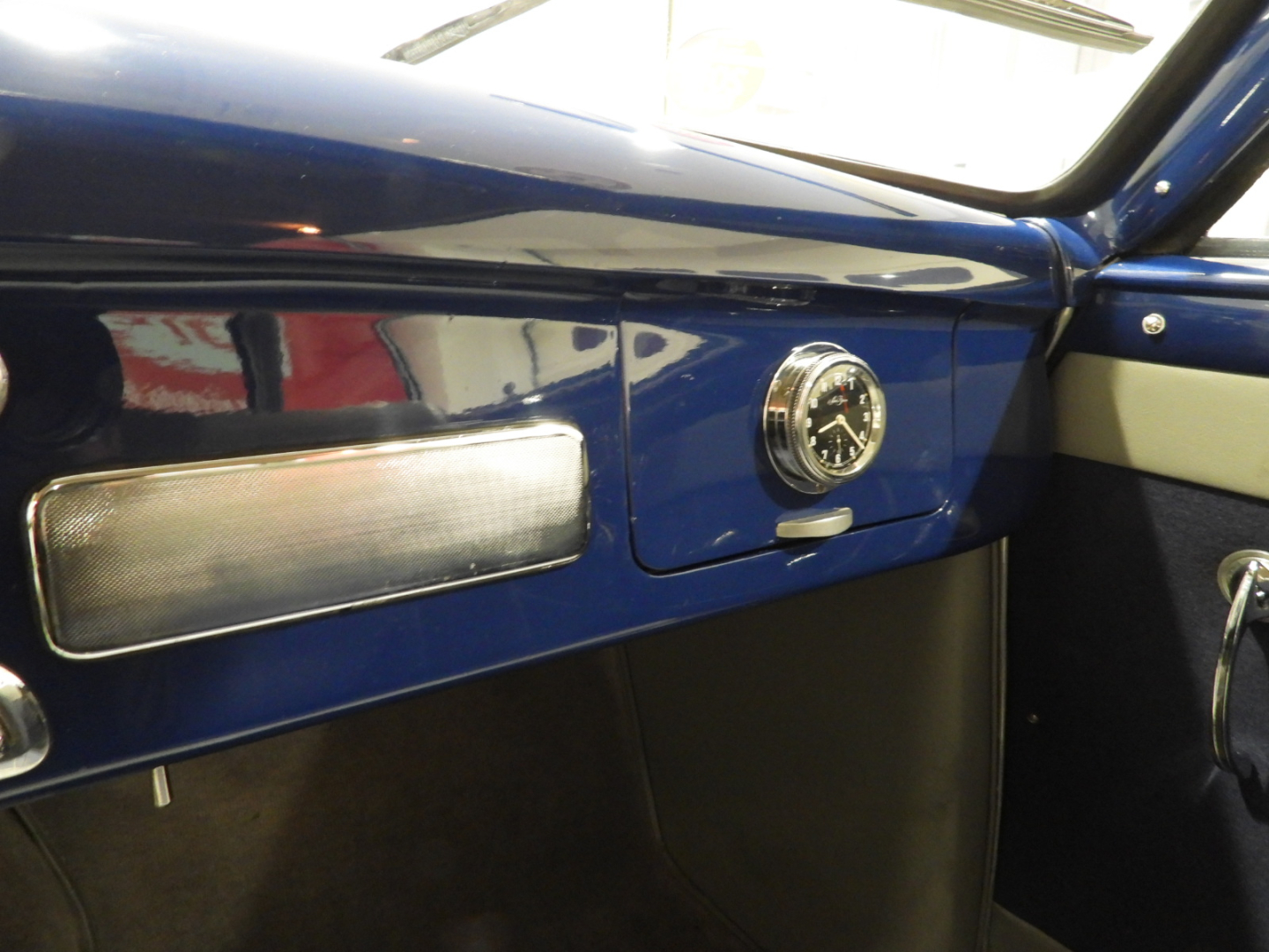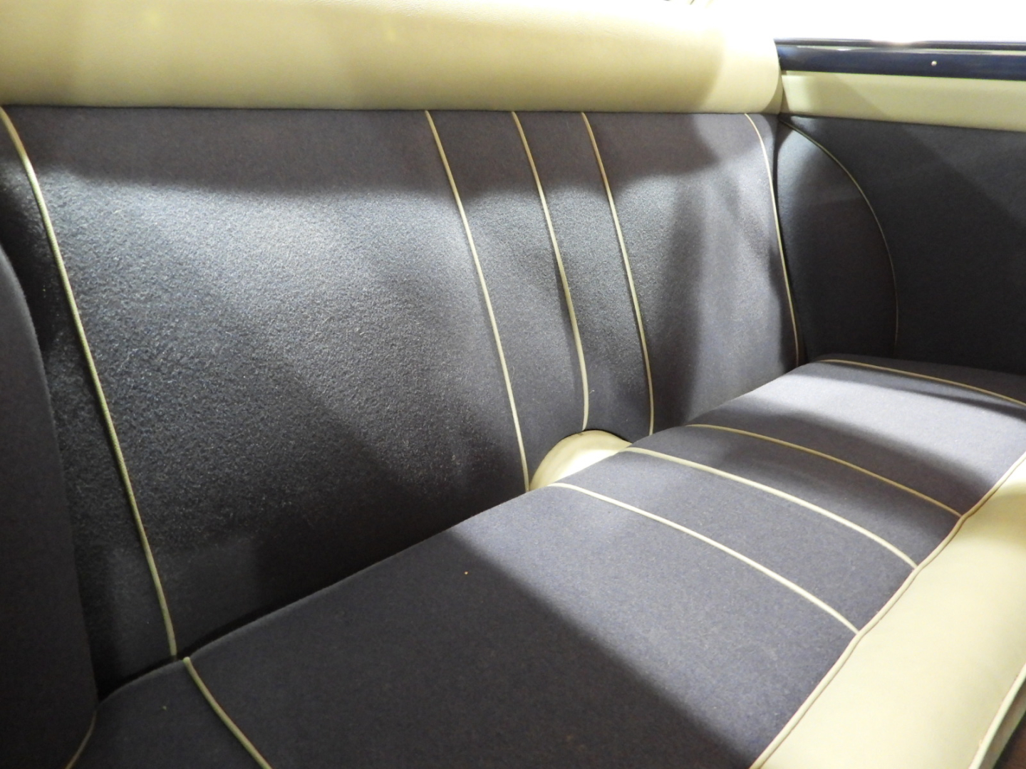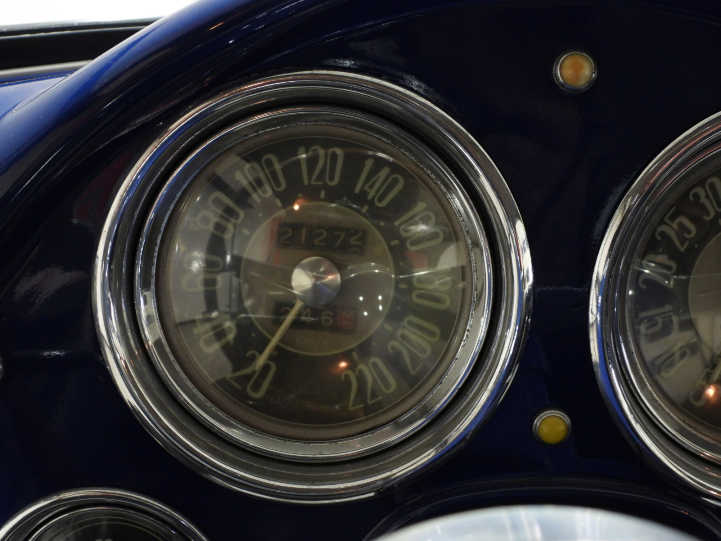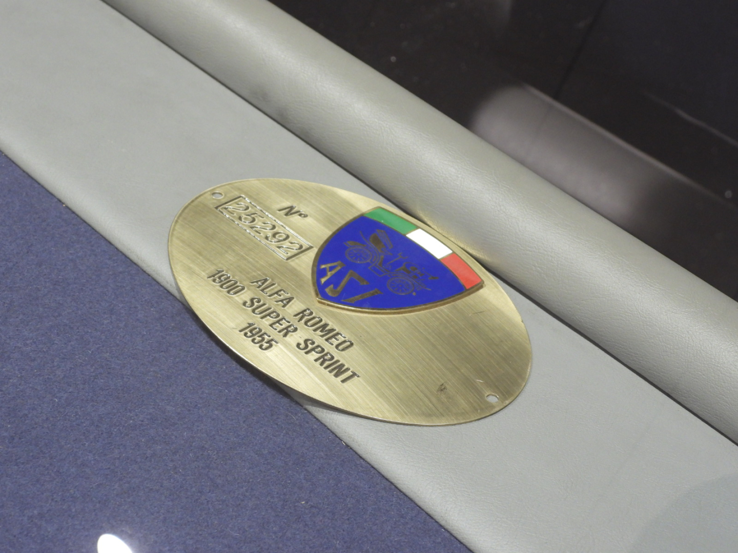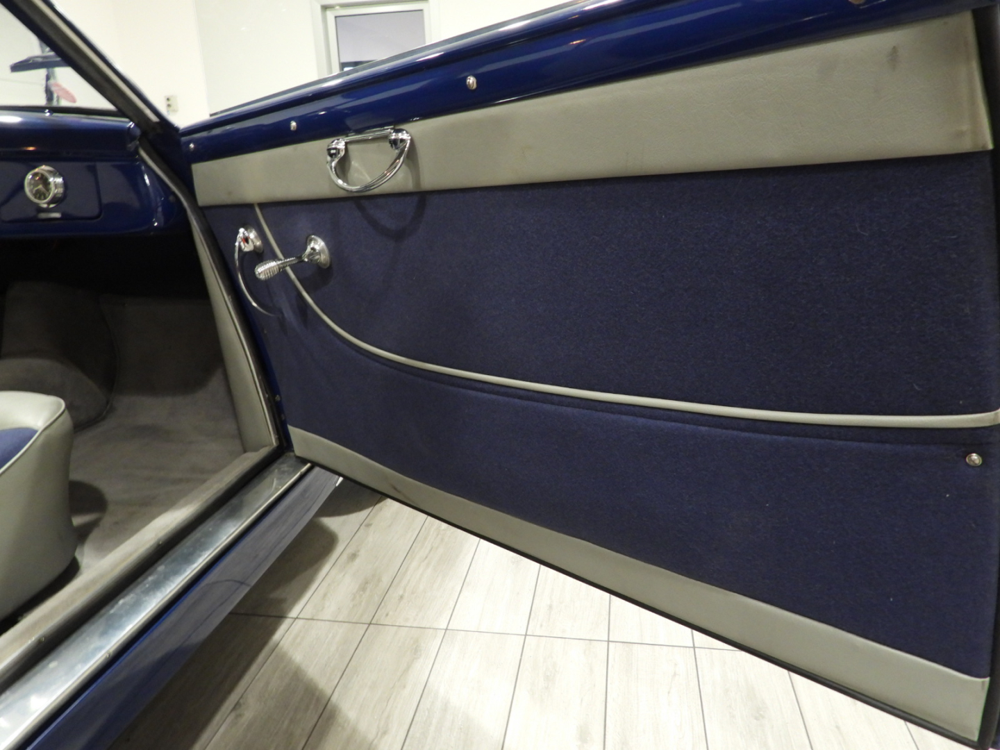 Sedili e pannelli in Vipla grigia e panno lana blu, Moquette in lana grigia al pavimento, Volante Nardi a tre razze con corona in legno accessorio originale dell’epoca, Finestrini posteriori fissi in plexiglass…