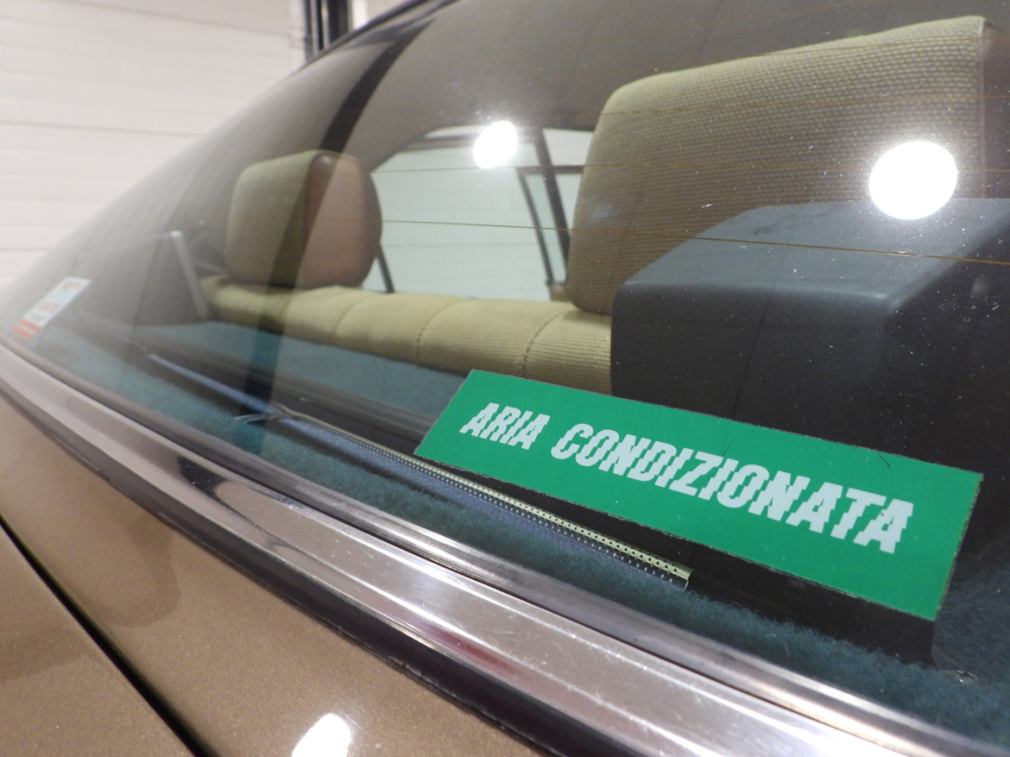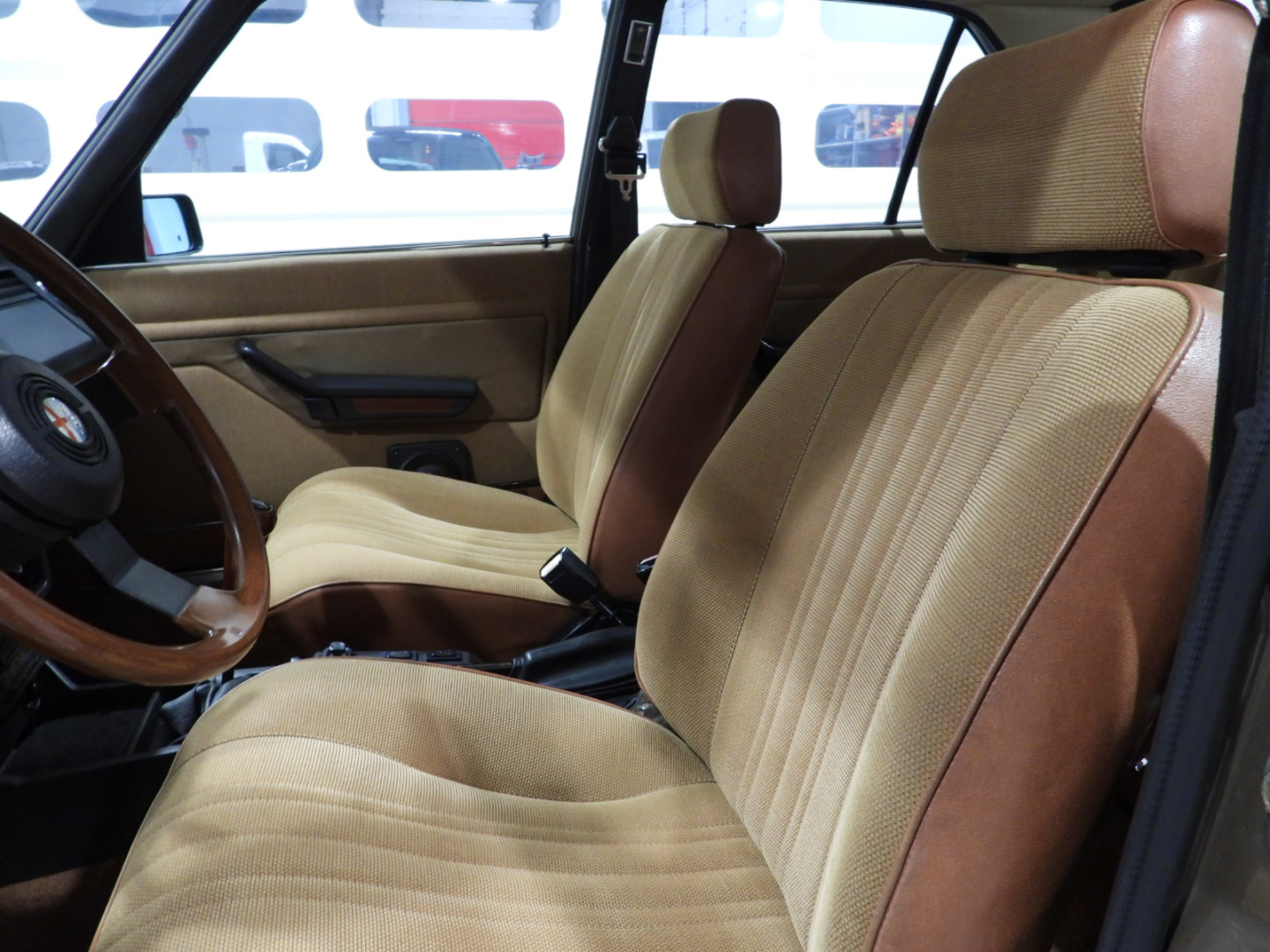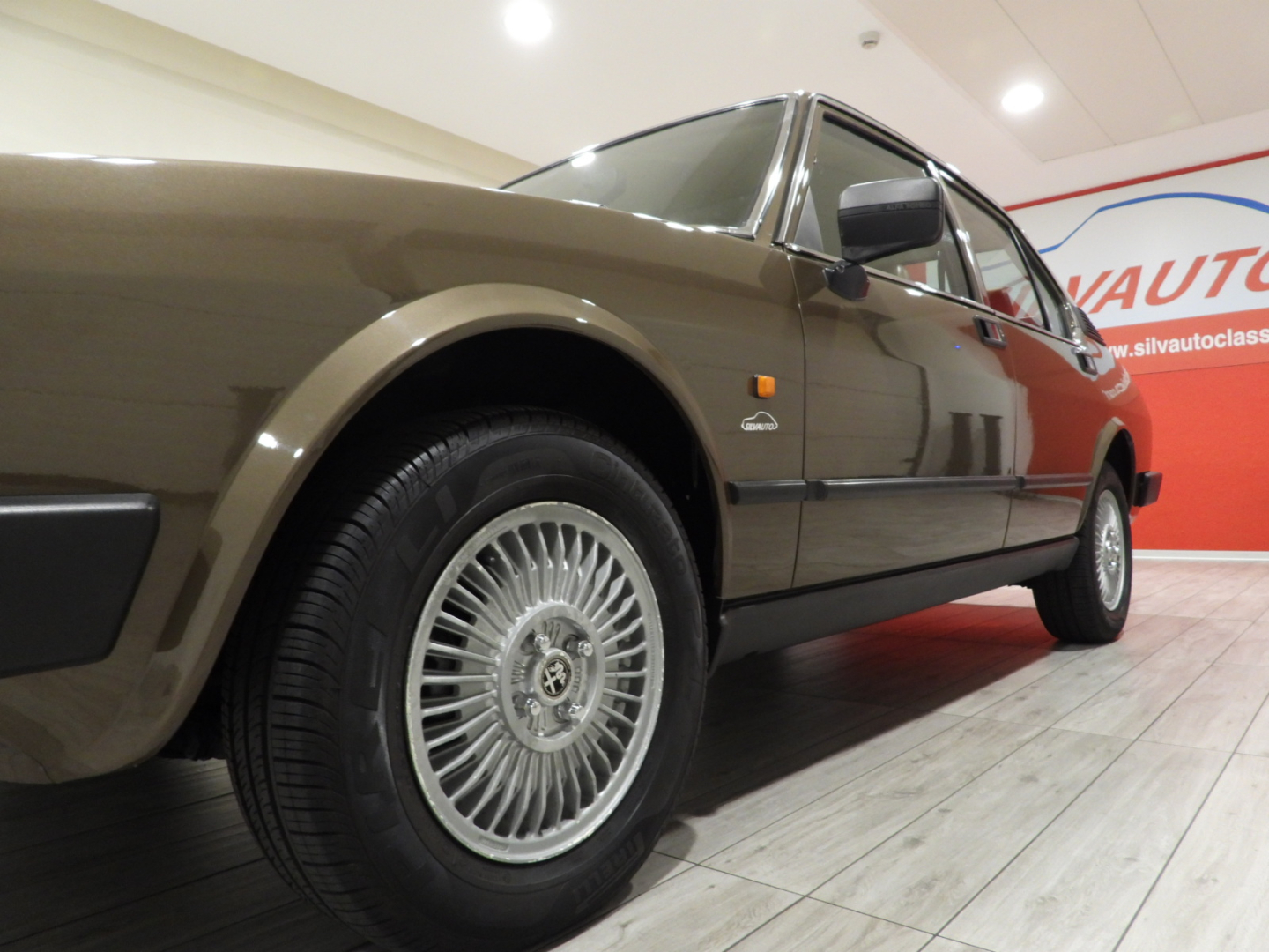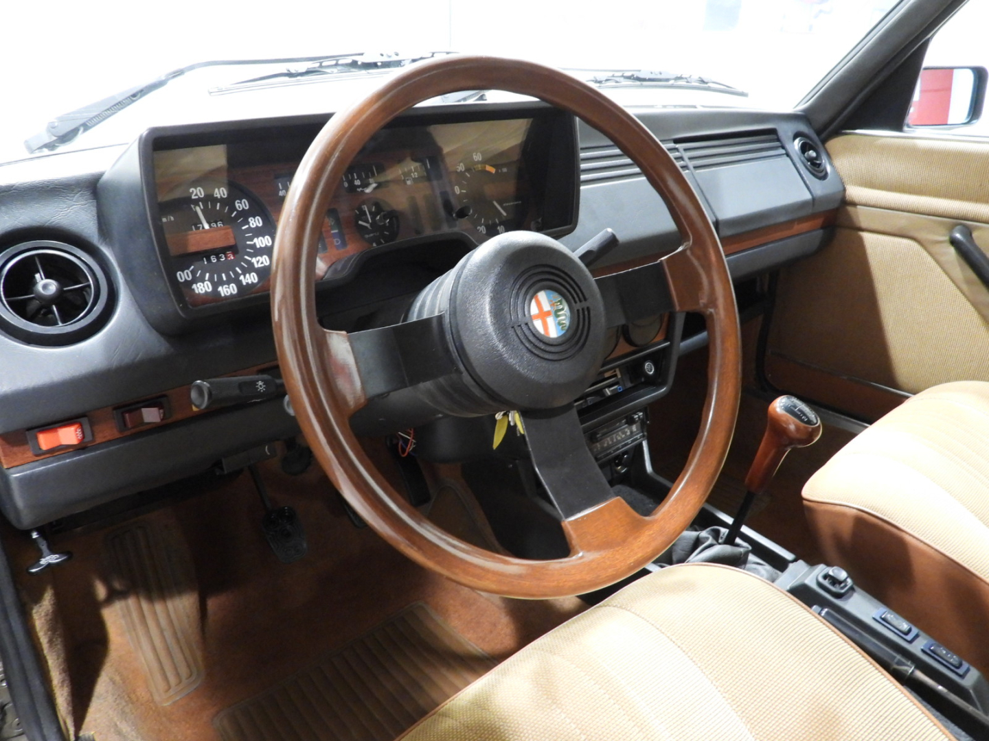 Sedili con poggiatesta anteriori regolabili e posteriori e pannelli in tessuto ciniglia nocciola e Tex Alfa sky cinghiale, Cinture di sicurezza con arrotolare anche su sedili posteriori, Moquette al pavimento in lana nocciola, Volante a tre razze con corona in legno coordinato con pomello del cambio, Aria condizionata, Vetri elettrici anteriori, Doppio specchio esterno Alfa Romeo Vitaloni, Autoradio Blaupunkt Stockholm R26 AM/FM a cassetta stereo 7 con antenna radio incorporata nel parabrezza e casse Alfa Romeo ai pannelli anteriori, Bracciolo posteriore, Lavatergifari, Paraurti e tubo di scarico in acciaio inox, Cerchi in lega Alfa Romeo Campagnolo Millerighe con pneumatici 185/70 R14 Pirelli Cinturato P4, Tappo serbatoio Alfa Romeo con chiavi originali Alfa Romeo