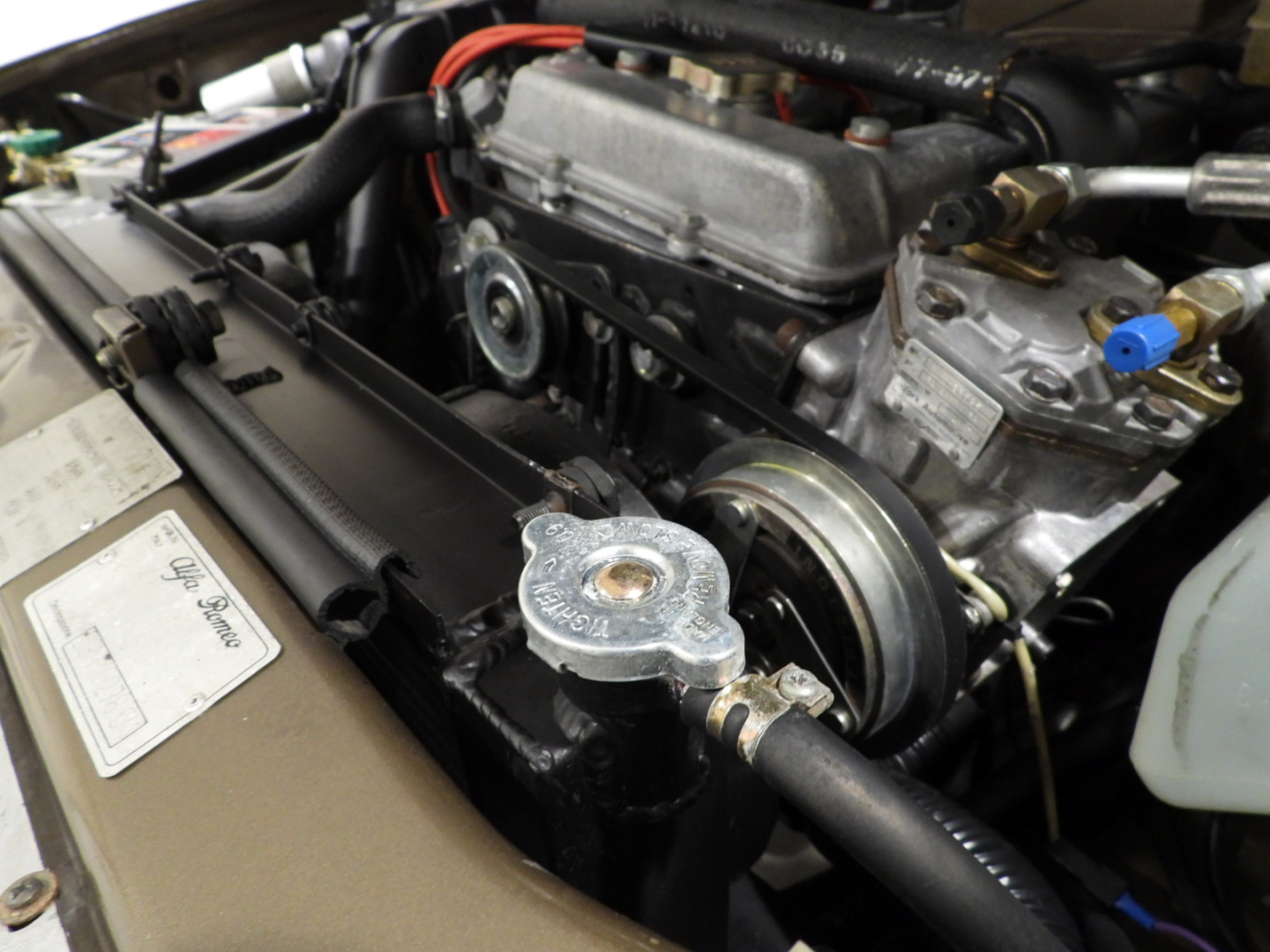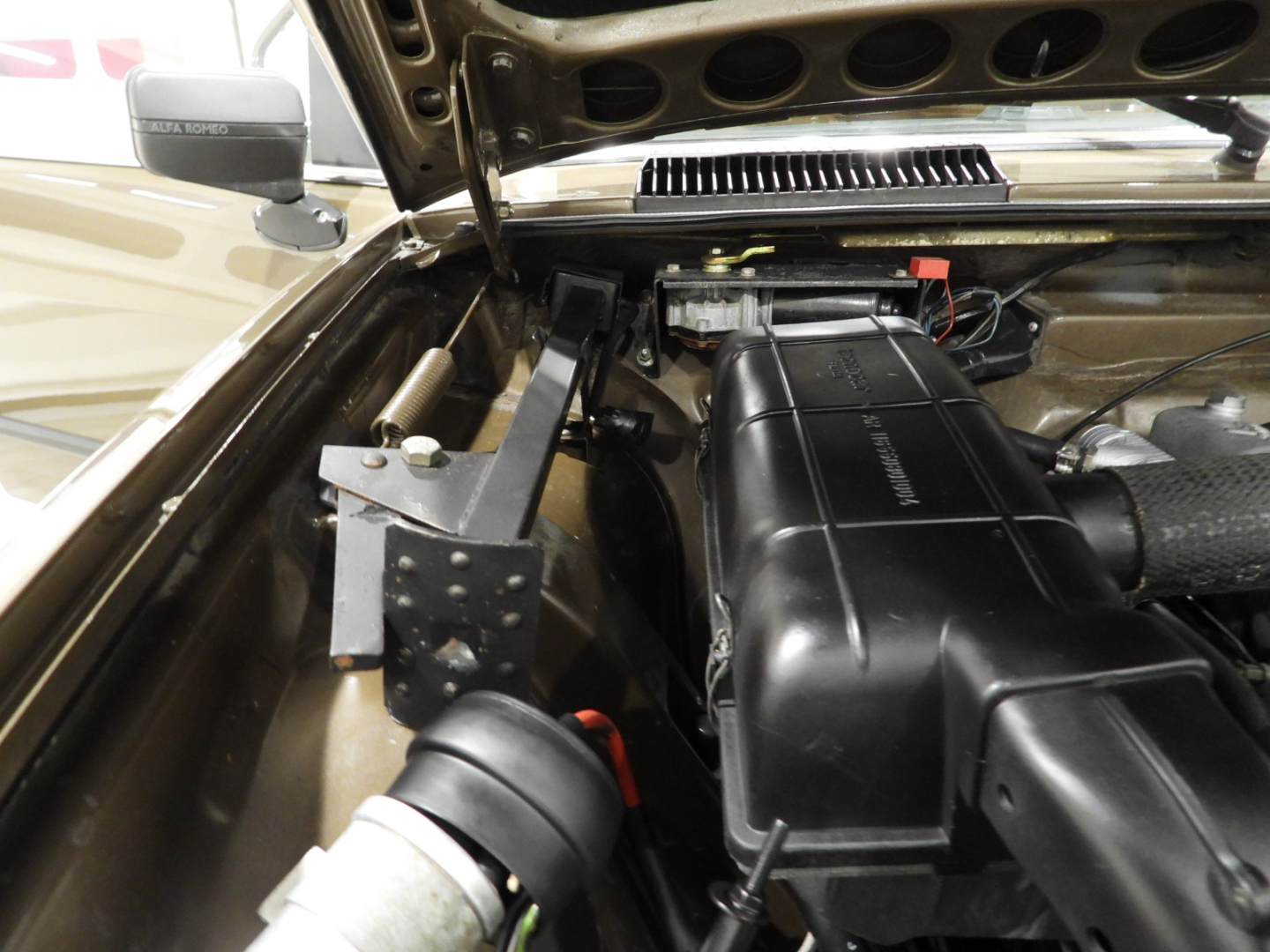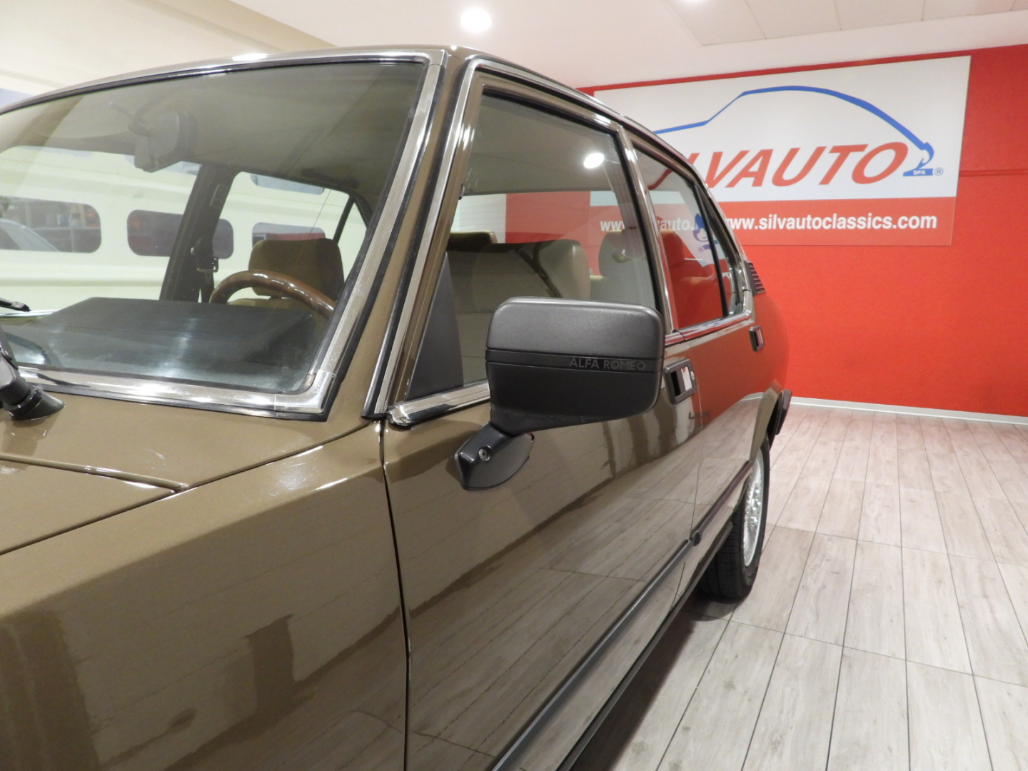 Sedili con poggiatesta anteriori regolabili e posteriori e pannelli in tessuto ciniglia nocciola e Tex Alfa sky cinghiale, Cinture di sicurezza con arrotolare anche su sedili posteriori, Moquette al pavimento in lana nocciola, Volante a tre razze con corona in legno coordinato con pomello del cambio, Aria condizionata, Vetri elettrici anteriori, Doppio specchio esterno Alfa Romeo Vitaloni, Autoradio Blaupunkt Stockholm R26 AM/FM a cassetta stereo 7 con antenna radio incorporata nel parabrezza e casse Alfa Romeo ai pannelli anteriori, Bracciolo posteriore, Lavatergifari, Paraurti e tubo di scarico in acciaio inox, Cerchi in lega Alfa Romeo Campagnolo Millerighe con pneumatici 185/70 R14 Pirelli Cinturato P4, Tappo serbatoio Alfa Romeo con chiavi originali Alfa Romeo