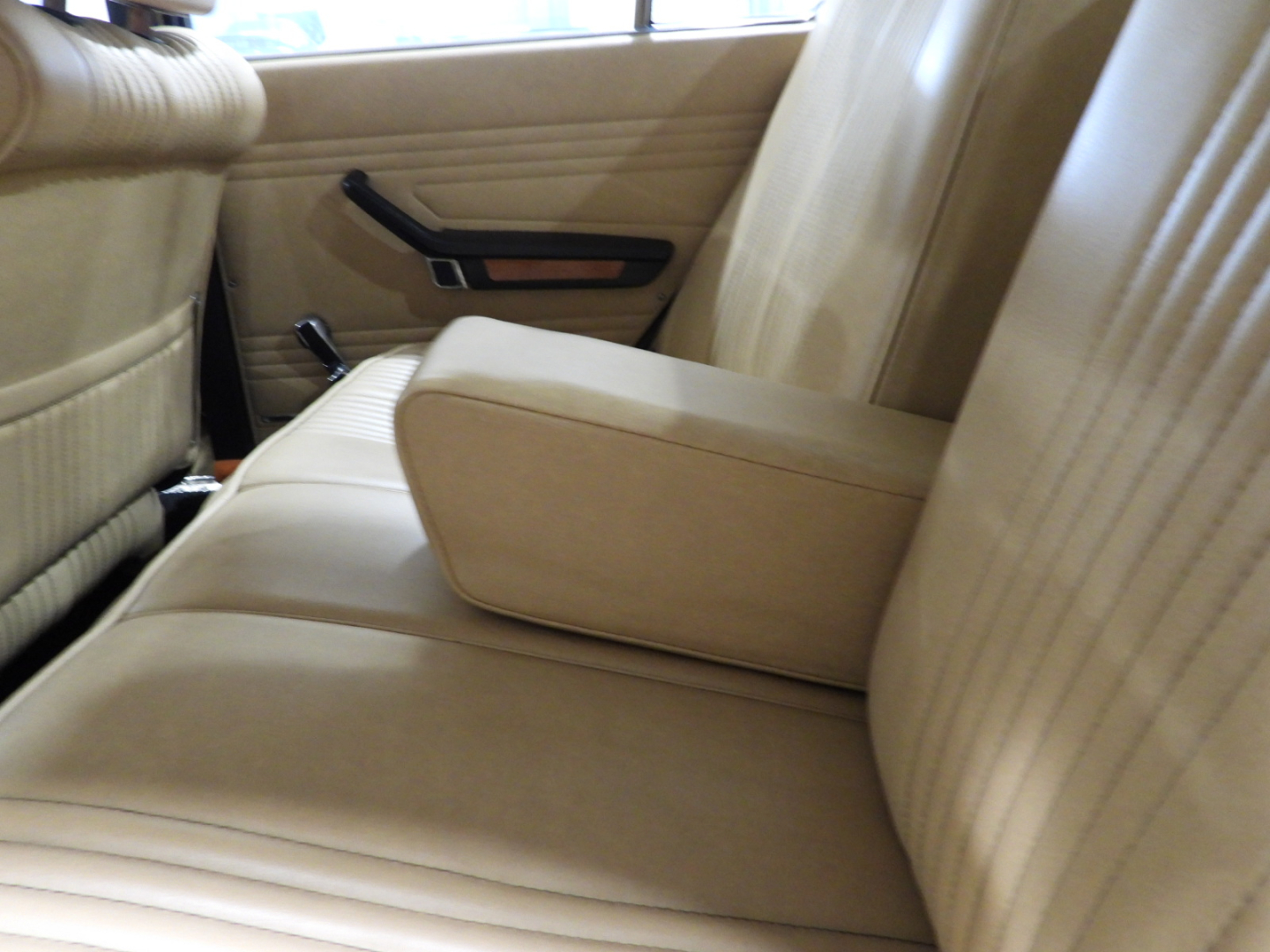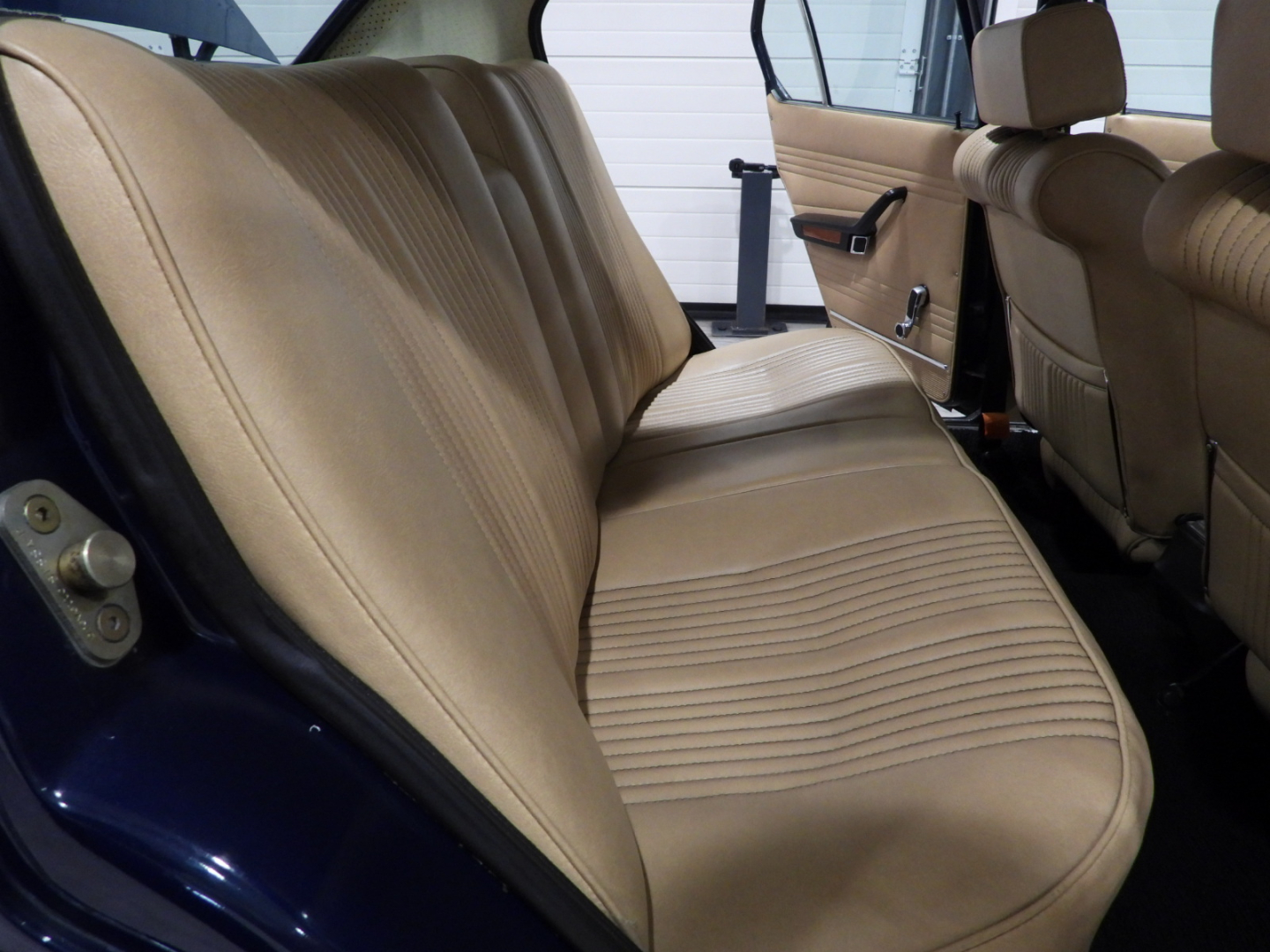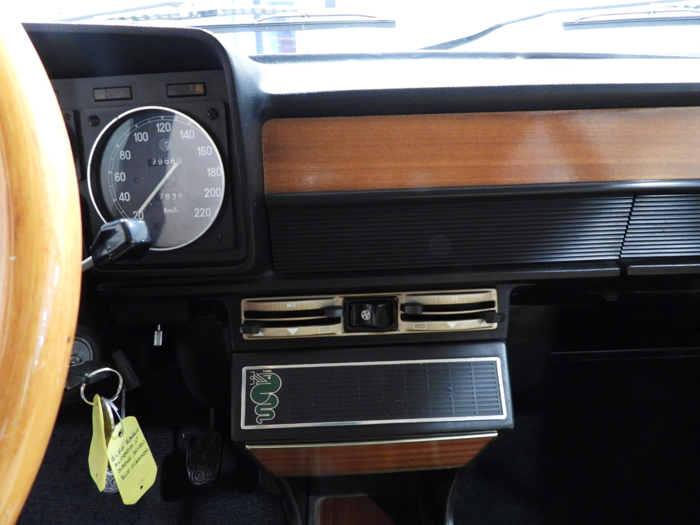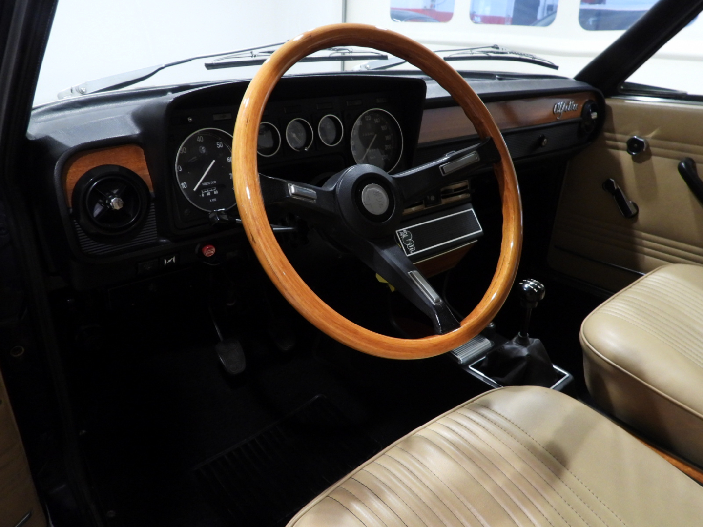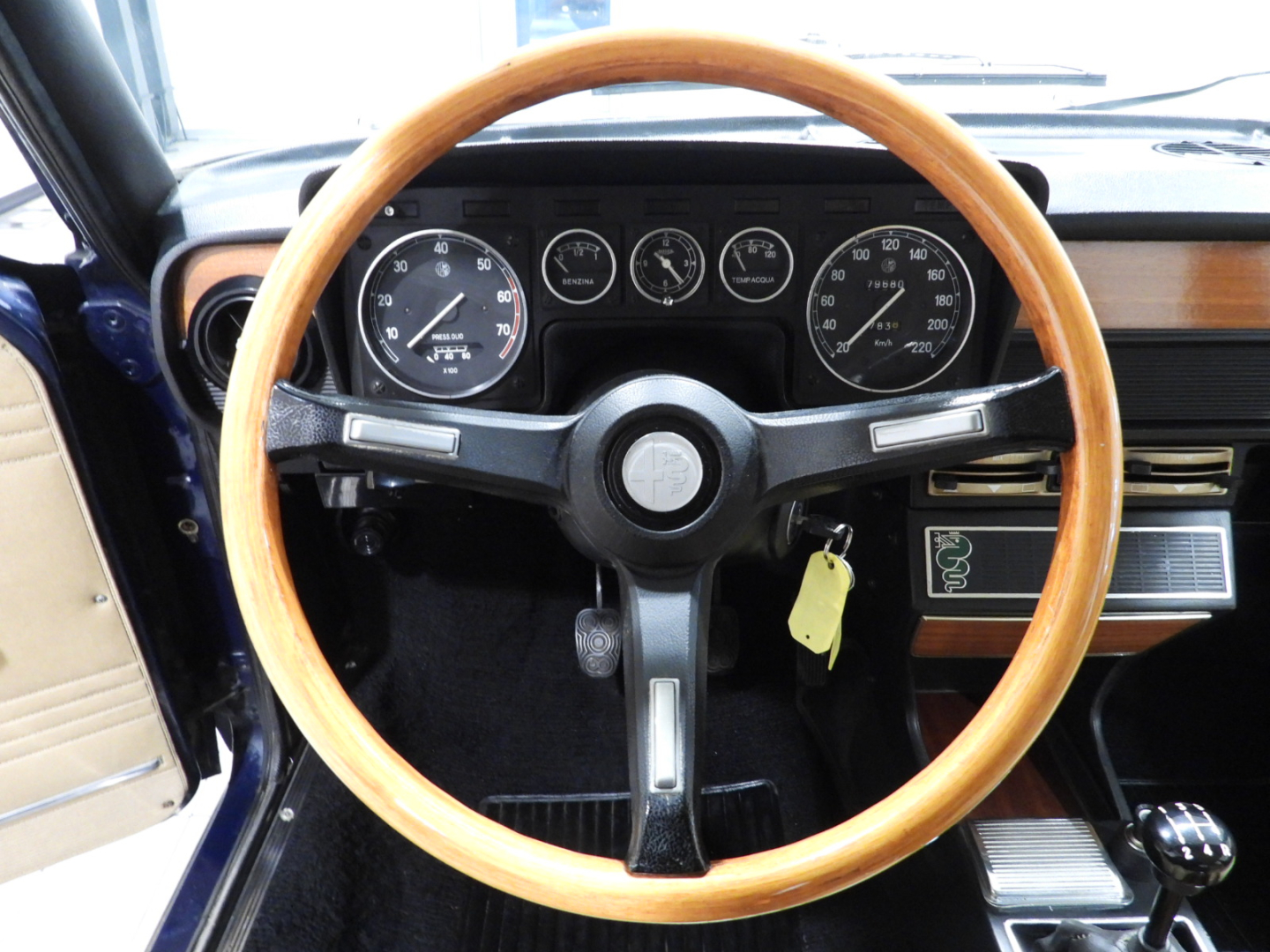 Sedili e pannelli in Tex Alfa sky cuoio naturale, Cinture di sicurezza anteriori, Moquette bouclet nera al pavimento, Volante a tre razze con corona in legno