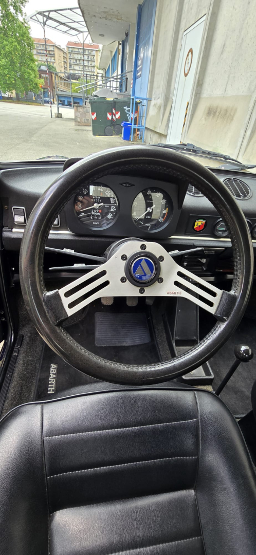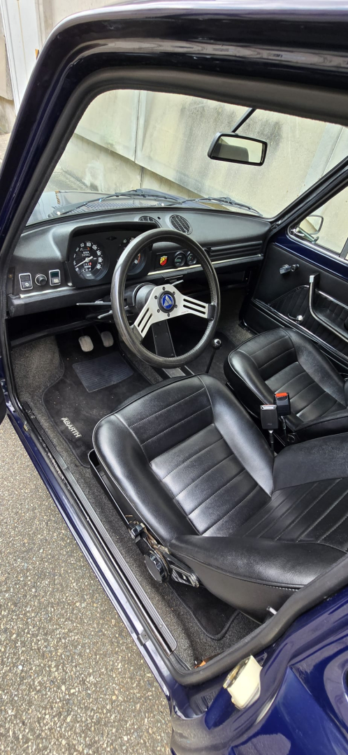 Sedili e pannelli in Sky nero, Volante Originale Autobianchi Abarth a 2 razze con corona in pelle, Autoradio, Cerchi in lega ABARTH/CROMODORA, Terminale di scarico cromato