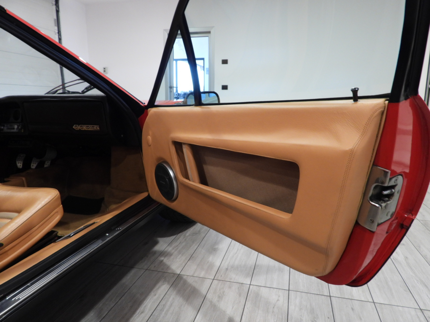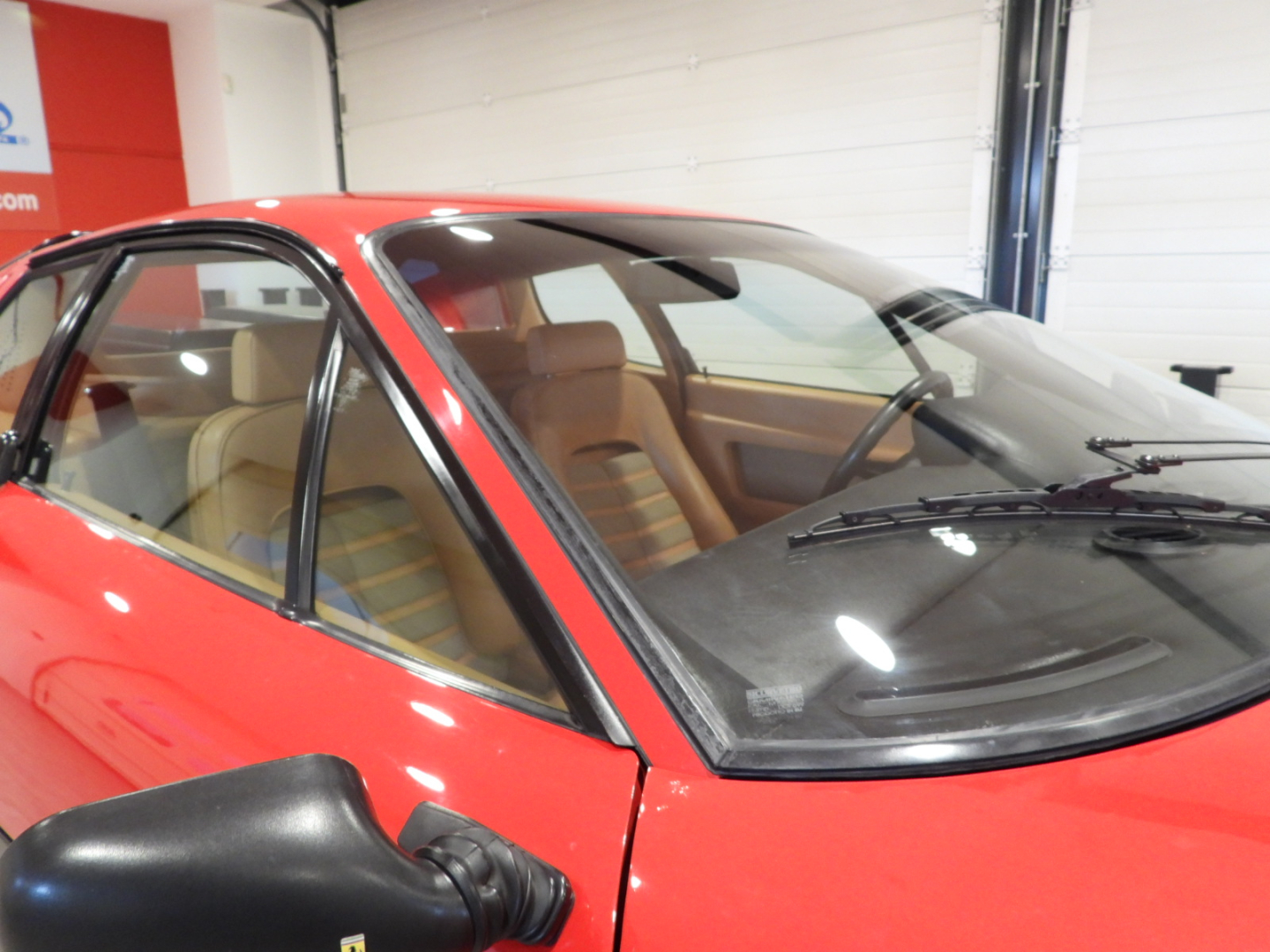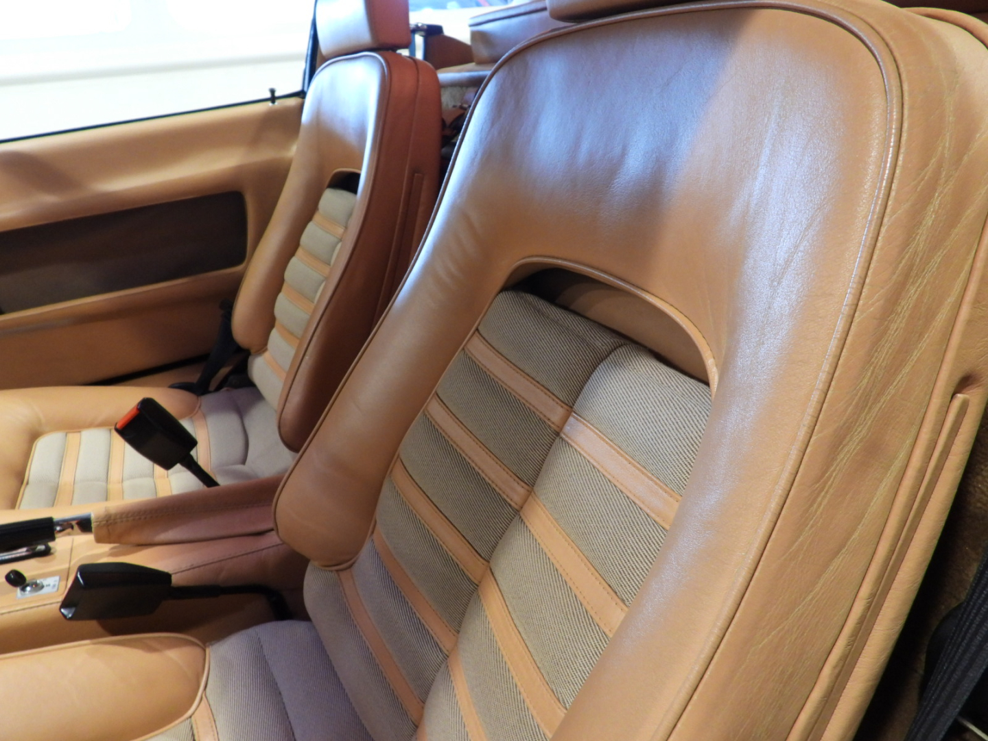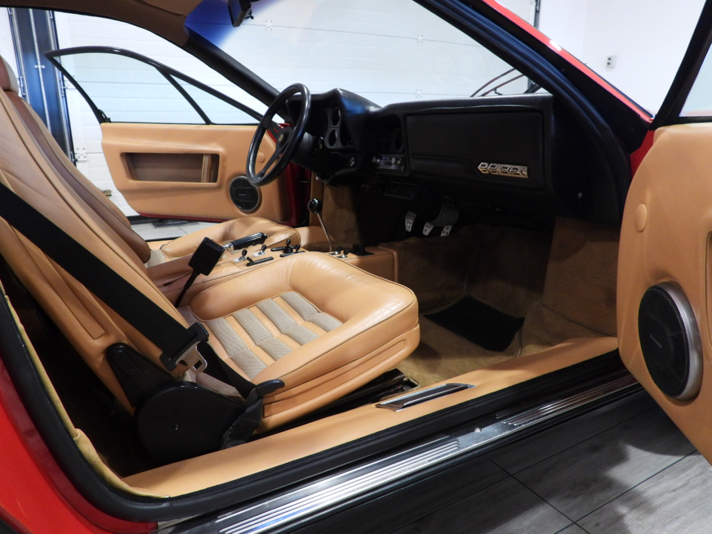 Sedili e pannelli in pelle beige VM 3218 e stoffa 7403, Moquette in lana beige al pavimento, Volante originale Ferrari Nardi a tre razze con corona in pelle, Autoradio PIONEER Auto – Reverse AM/FM a cassetta Stereo 7 con equalizzatore Pioneer montato in casa madre, Cerchi in lega a 5 razze con gallettone con pneumatici Michelin 240/55 VR415