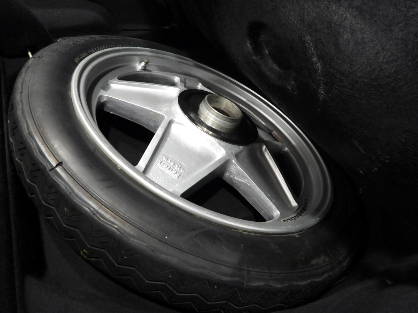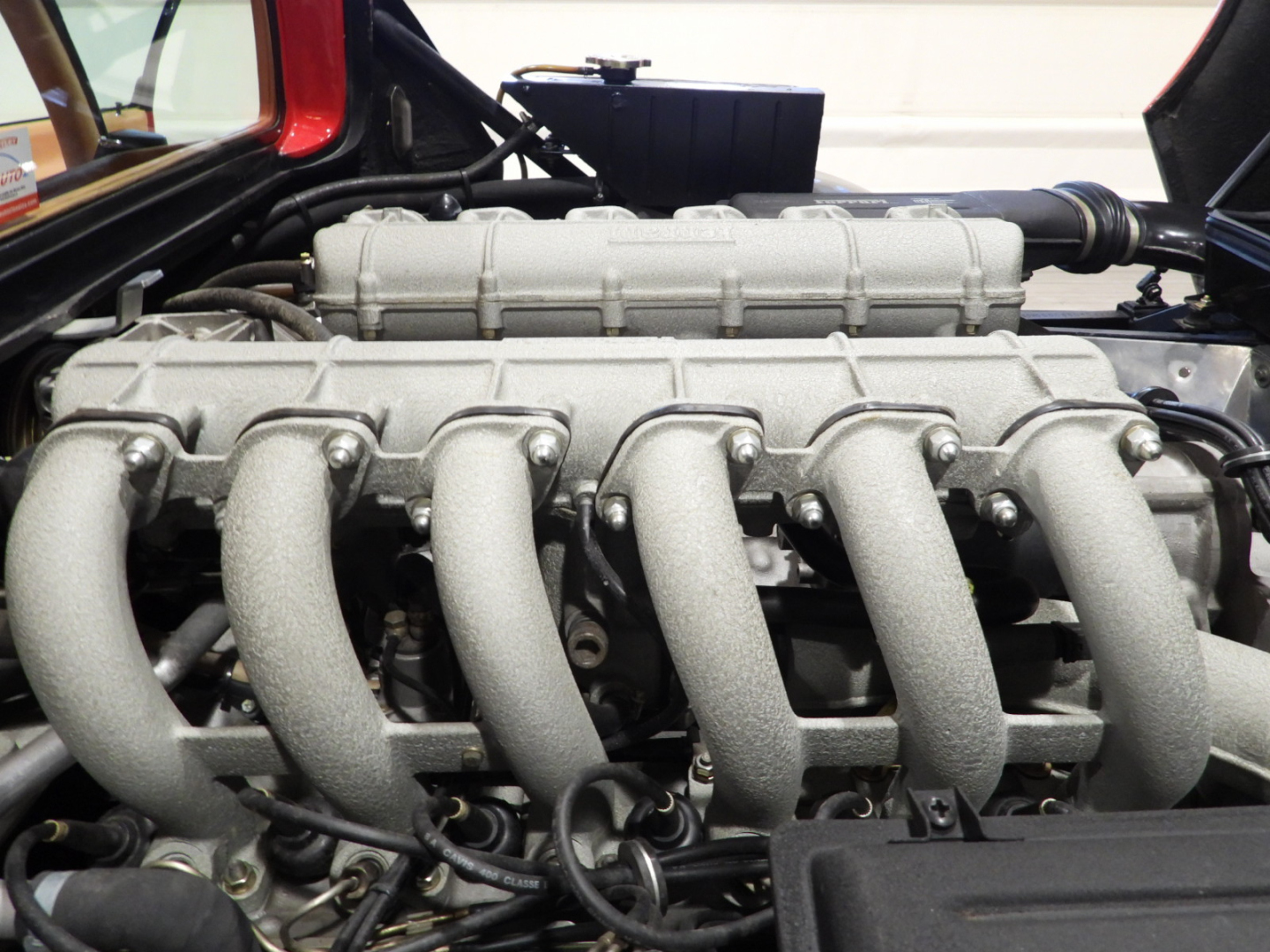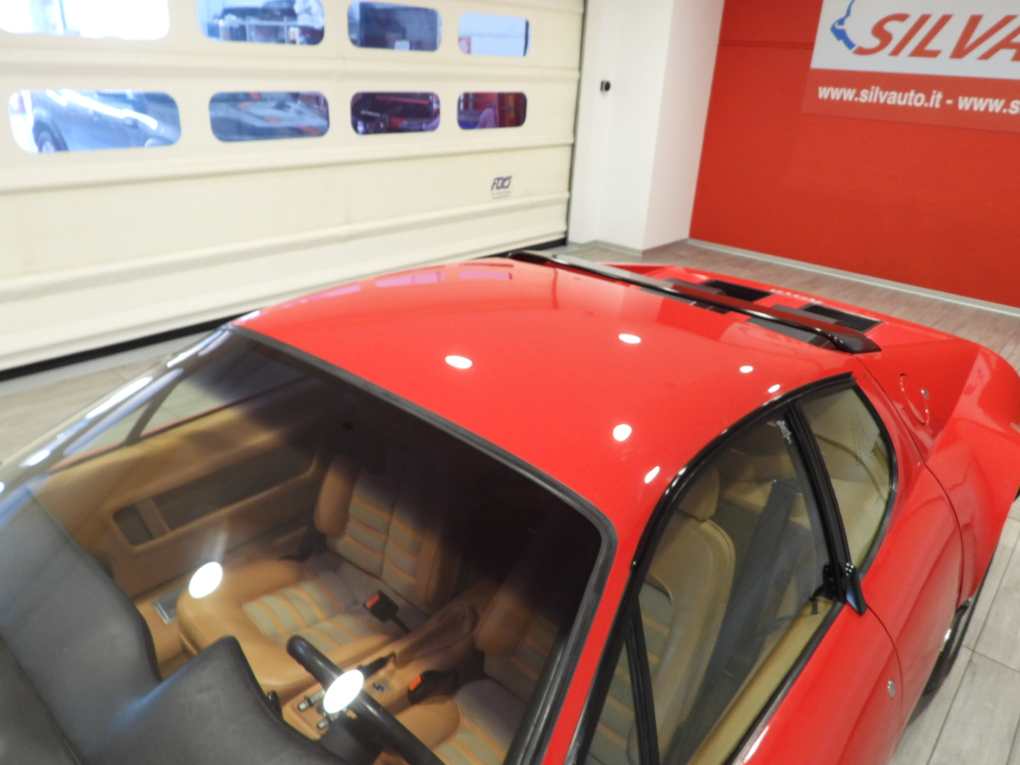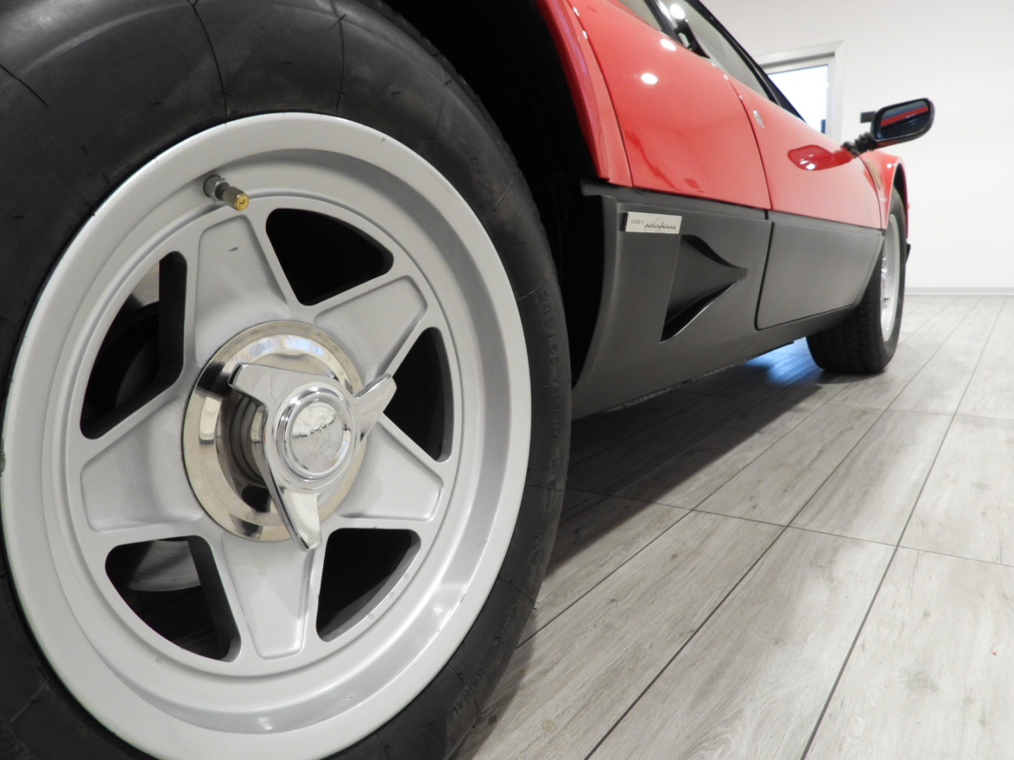Sedili e pannelli in pelle beige VM 3218 e stoffa 7403, Moquette in lana beige al pavimento, Volante originale Ferrari Nardi a tre razze con corona in pelle, Autoradio PIONEER Auto – Reverse AM/FM a cassetta Stereo 7 con equalizzatore Pioneer montato in casa madre, Cerchi in lega a 5 razze con gallettone con pneumatici Michelin 240/55 VR415