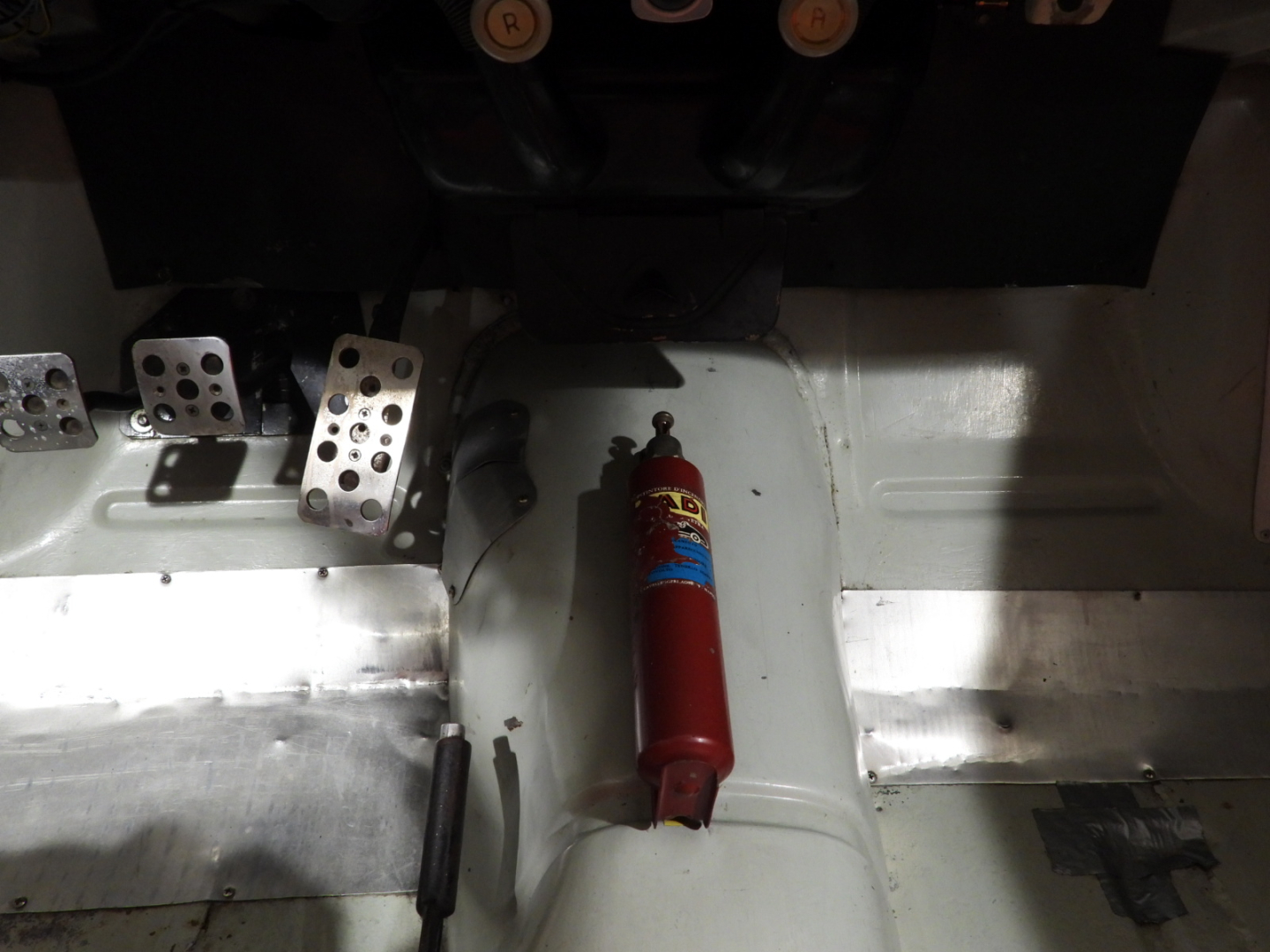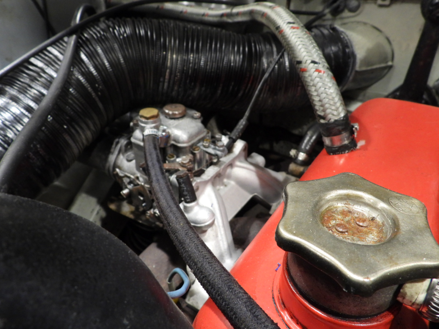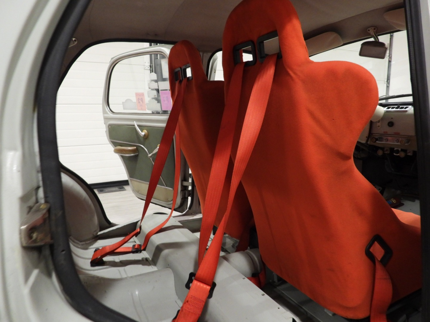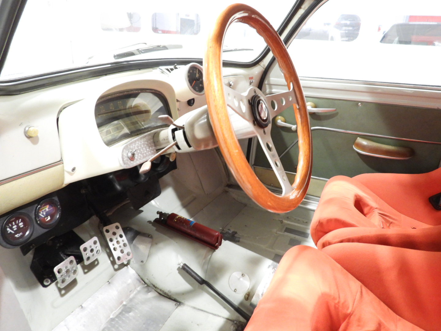 Sedili anatomici Omp con poggiatesta integrato in tessuto rosso, Cinture Sabelt 4 punti, Volante sportivo Momo a tre razze con corona in legno, Pedaliera sportiva in alluminio, Doppio specchio esterno tondo cromato, Cerchi in ferro con pneumatici 145/80 R14, Fari fendinebbia supplementari Marchal tondi a luce bianca