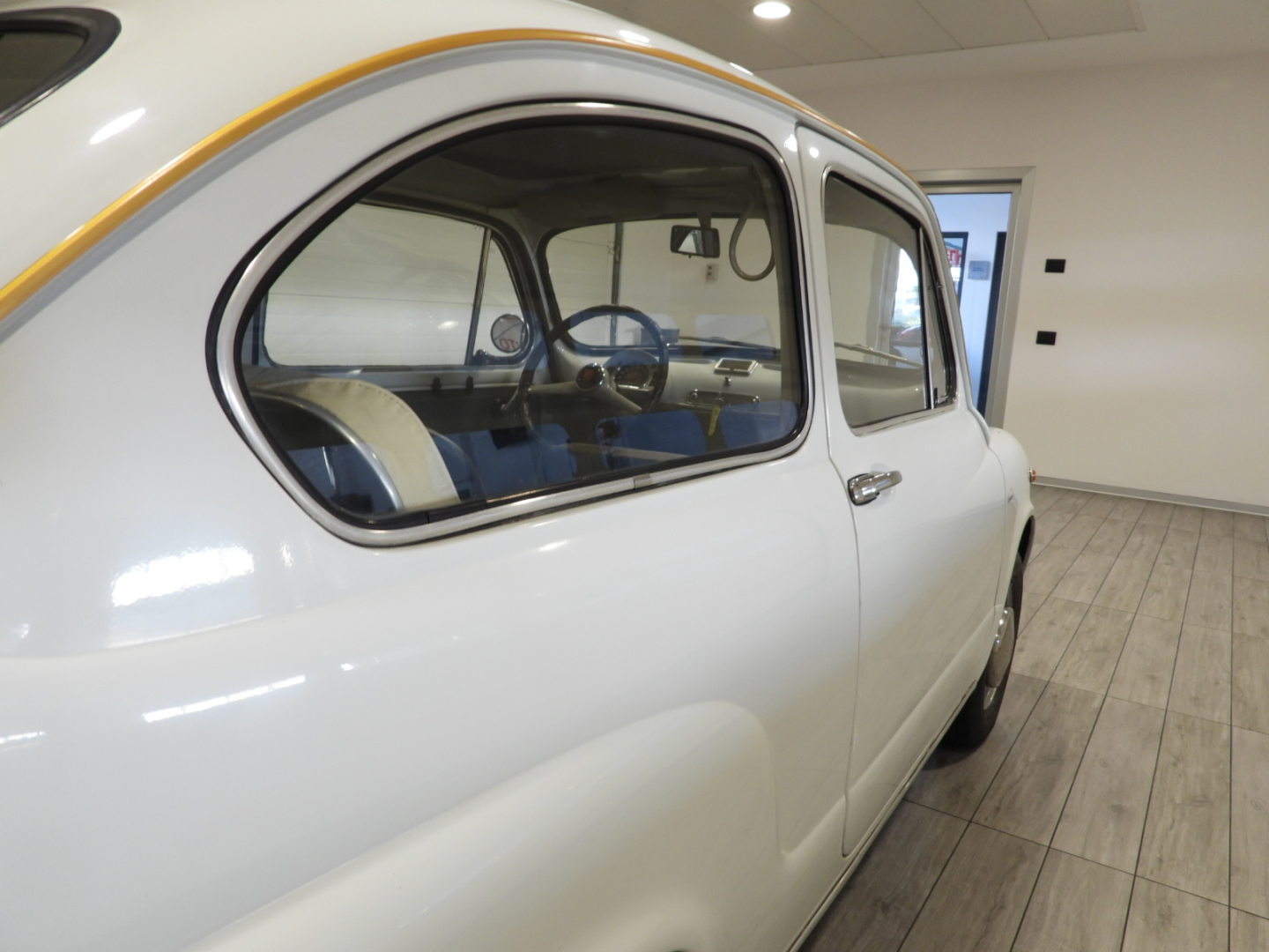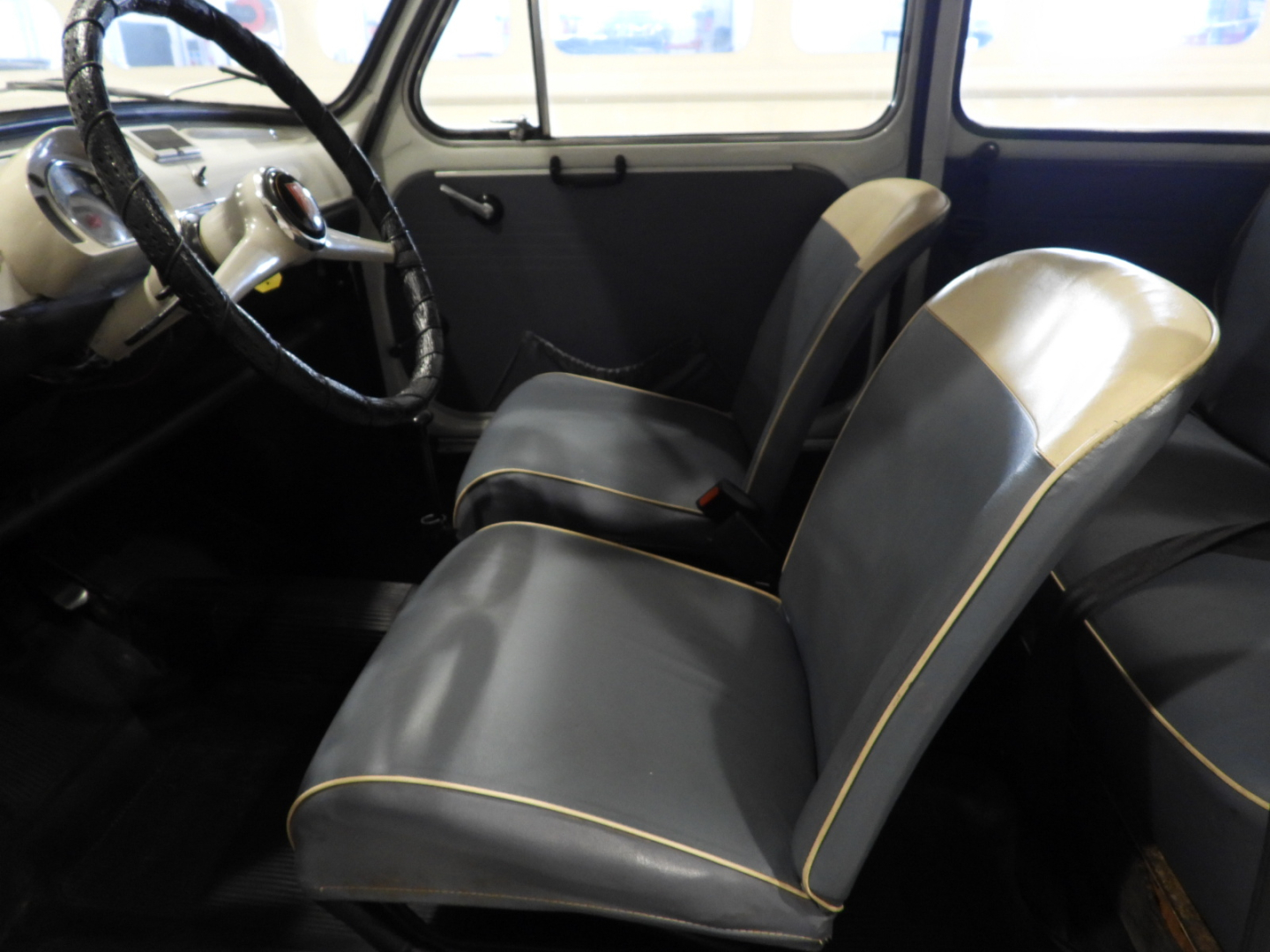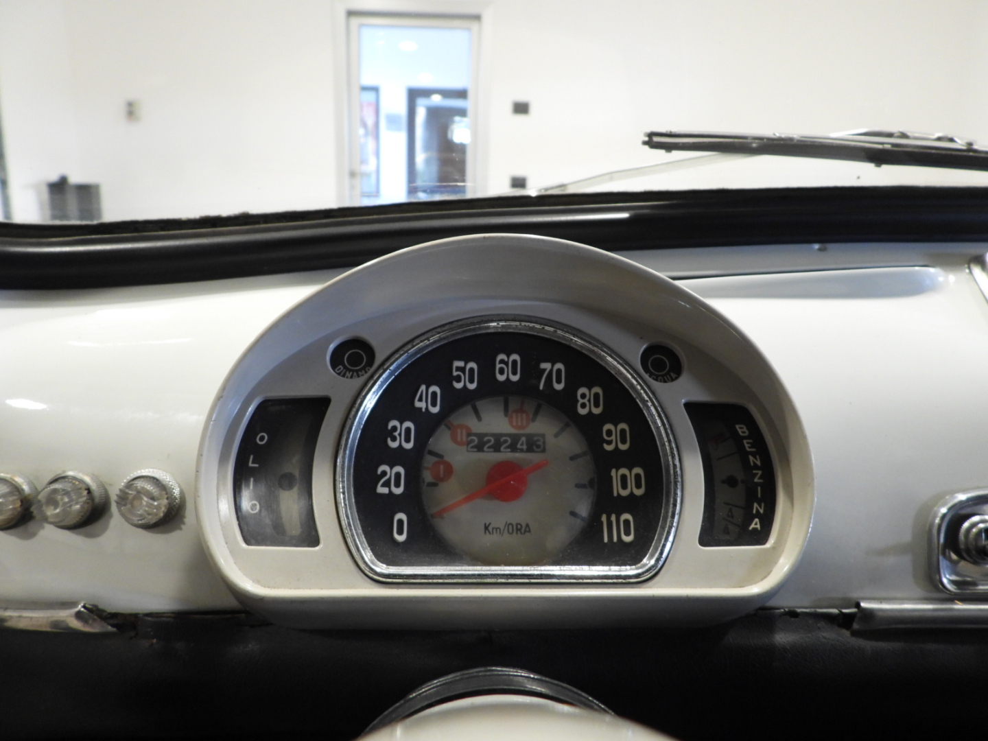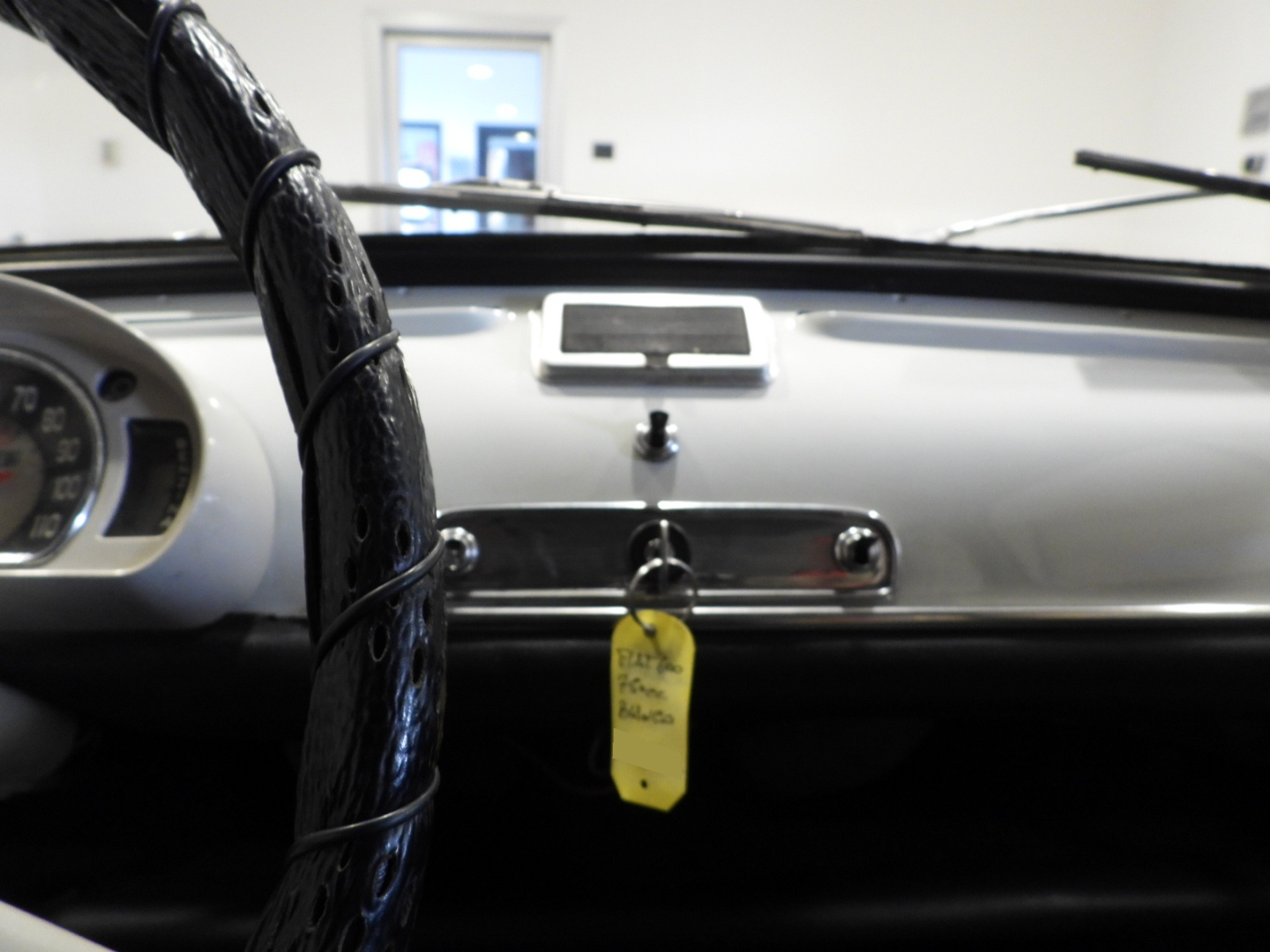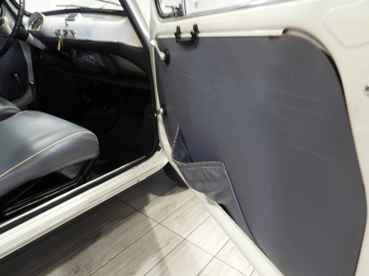 Sedili e pannelli in Vipla celeste e avorio, Specchio esterno lato guida cromato, Cerchi in ferro con calotta Fiat Cromata con pneumatici 145SR12, Staccabatteria