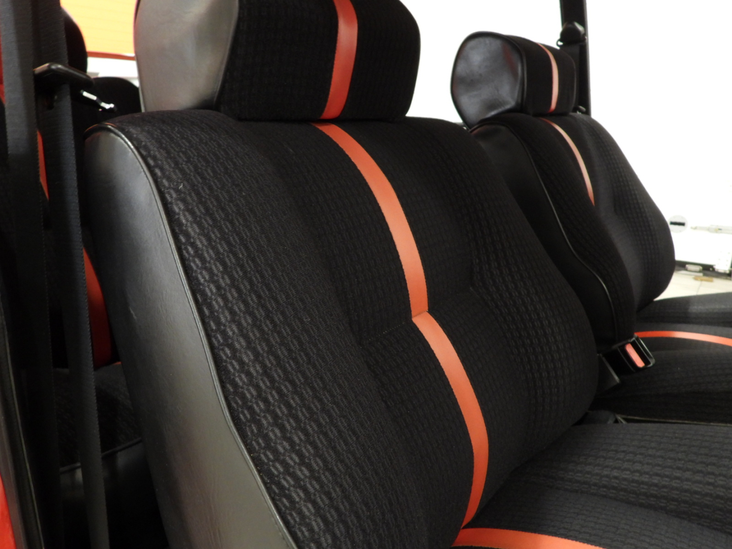 Sedili con poggiatesta anteriori e posteriori in tessuto nero e sky nero con linea rossa centrale su seduta e alzata, Pannelli in sky nero, Bracciolo posteriore, Volante a tre razze Abarth con corona in pelle, Specchio esterno lato guida California by Vitaloni, 5 Cerchi in lega Abarth Campagnolo 7Jx15 con pneumatici Pirelli 195/50 R15