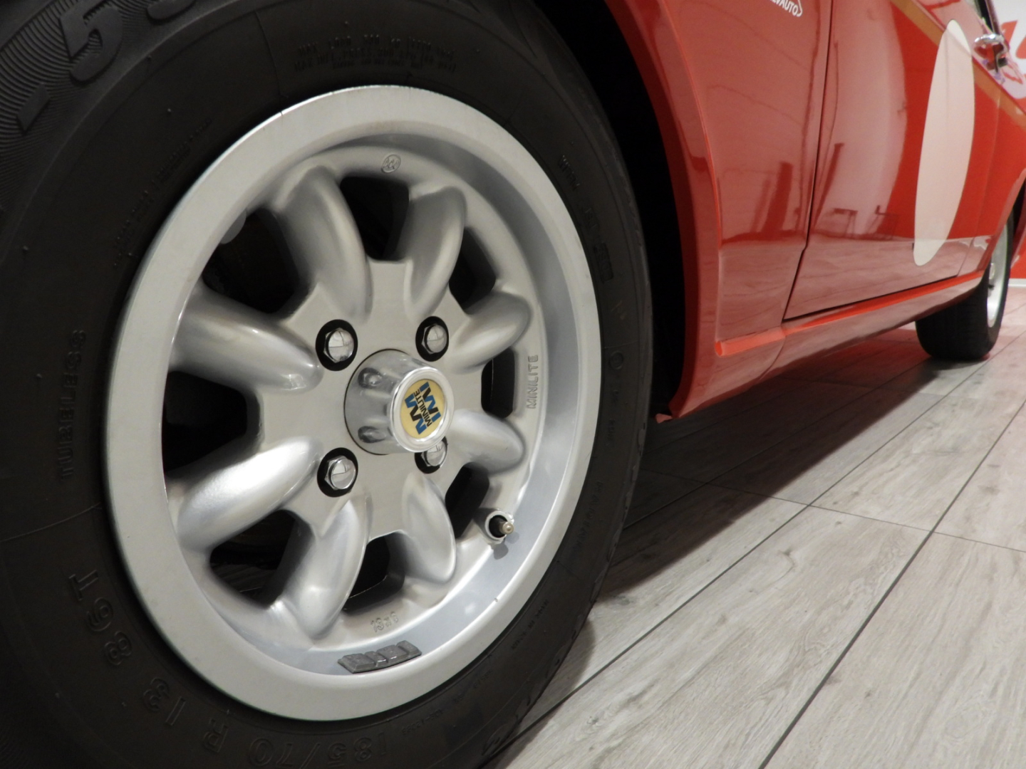Sedili tipo fusina in sky e velluto nero, Pedaliera sportiva, Cinture di sicurezza Sabelt a tre punti, Volante sportivo a tre razze Astrall con corona in pelle, Specchio esterno lato guida cromato, Cerchi in lega MINILITE con pneumatice Firestone 185/70 R13, Fari di profondita’ CIBIE supplementari a luce bianca, Specchio esterno lato guida cromato, Staccabatteria