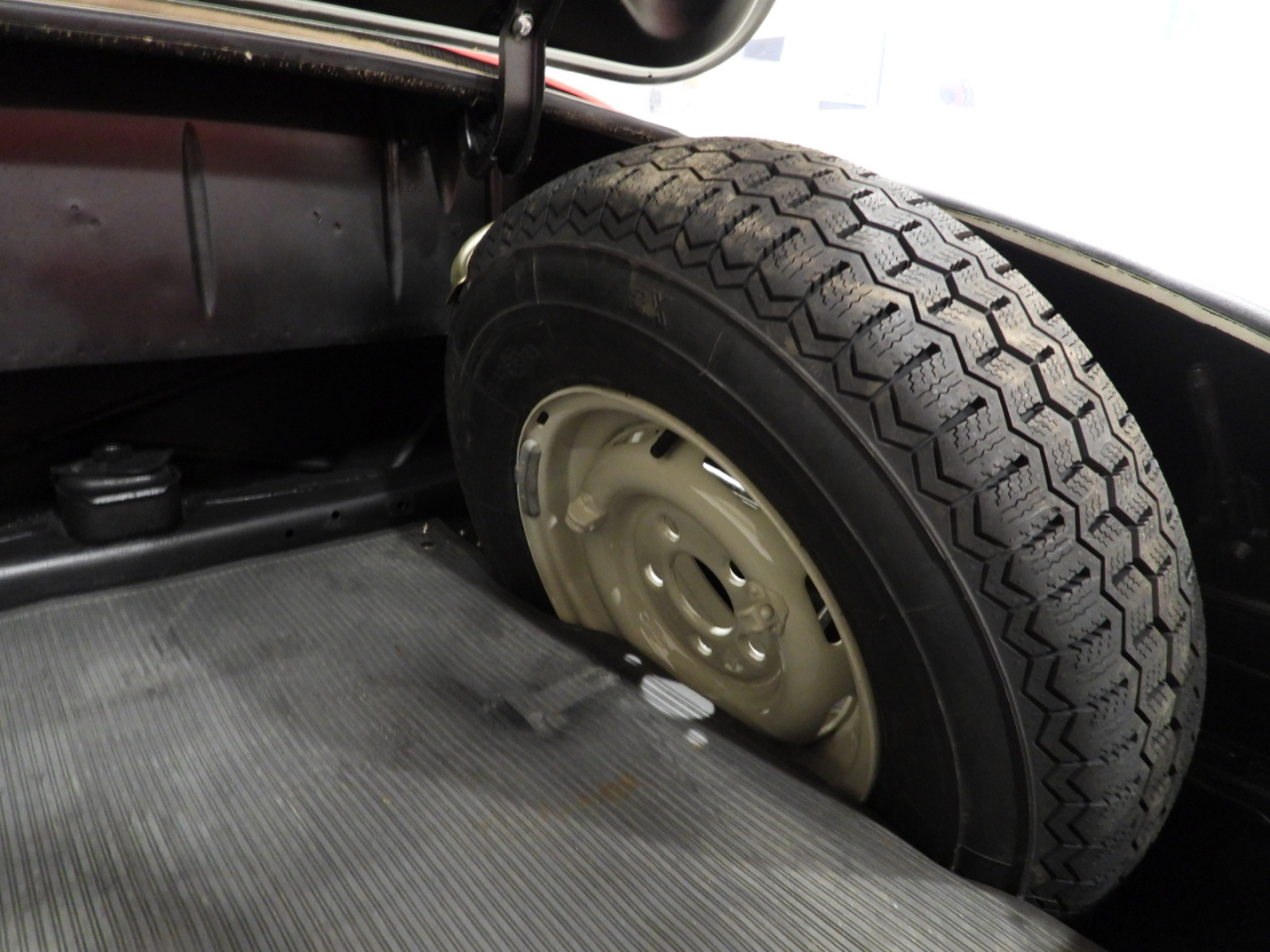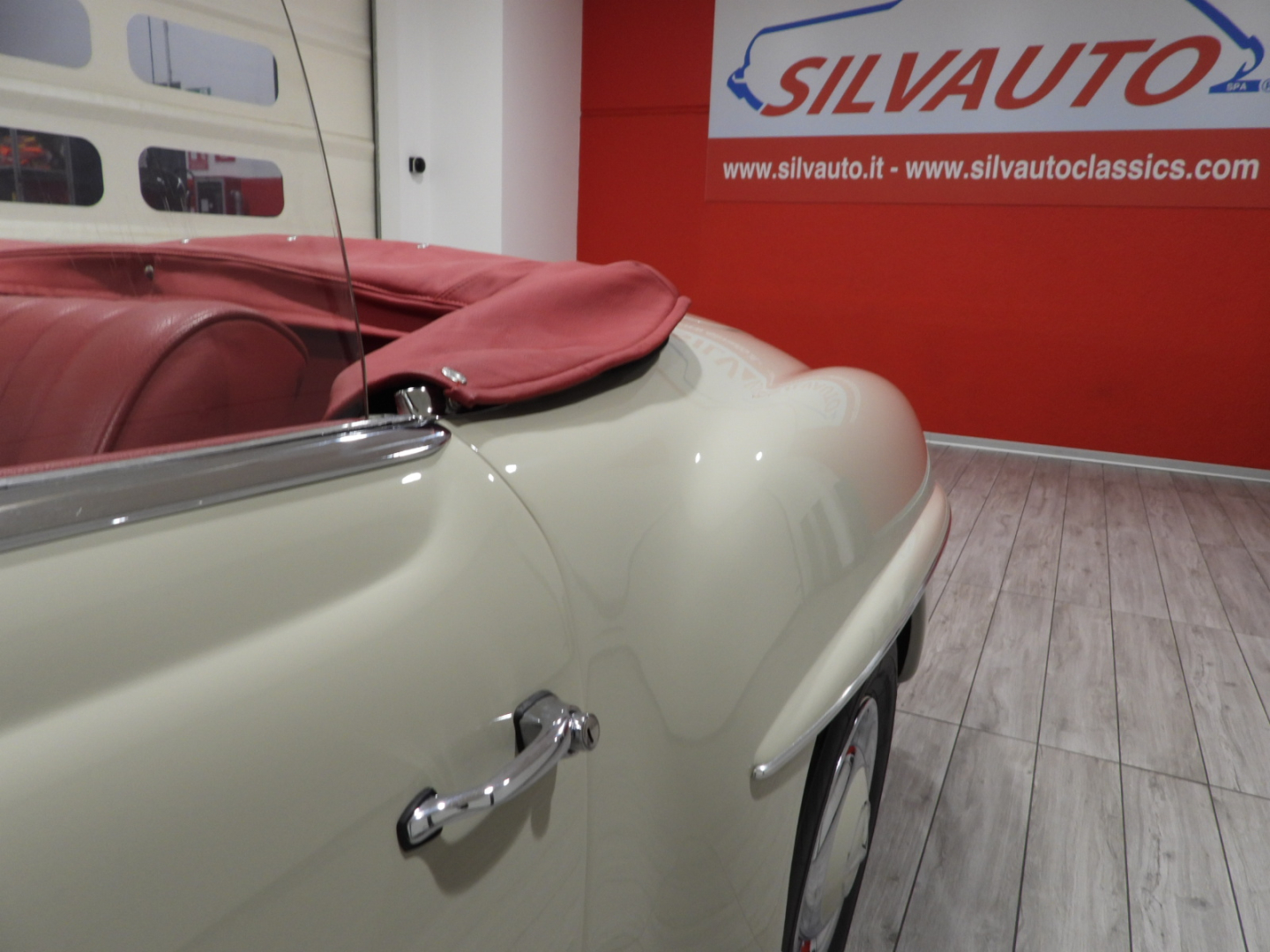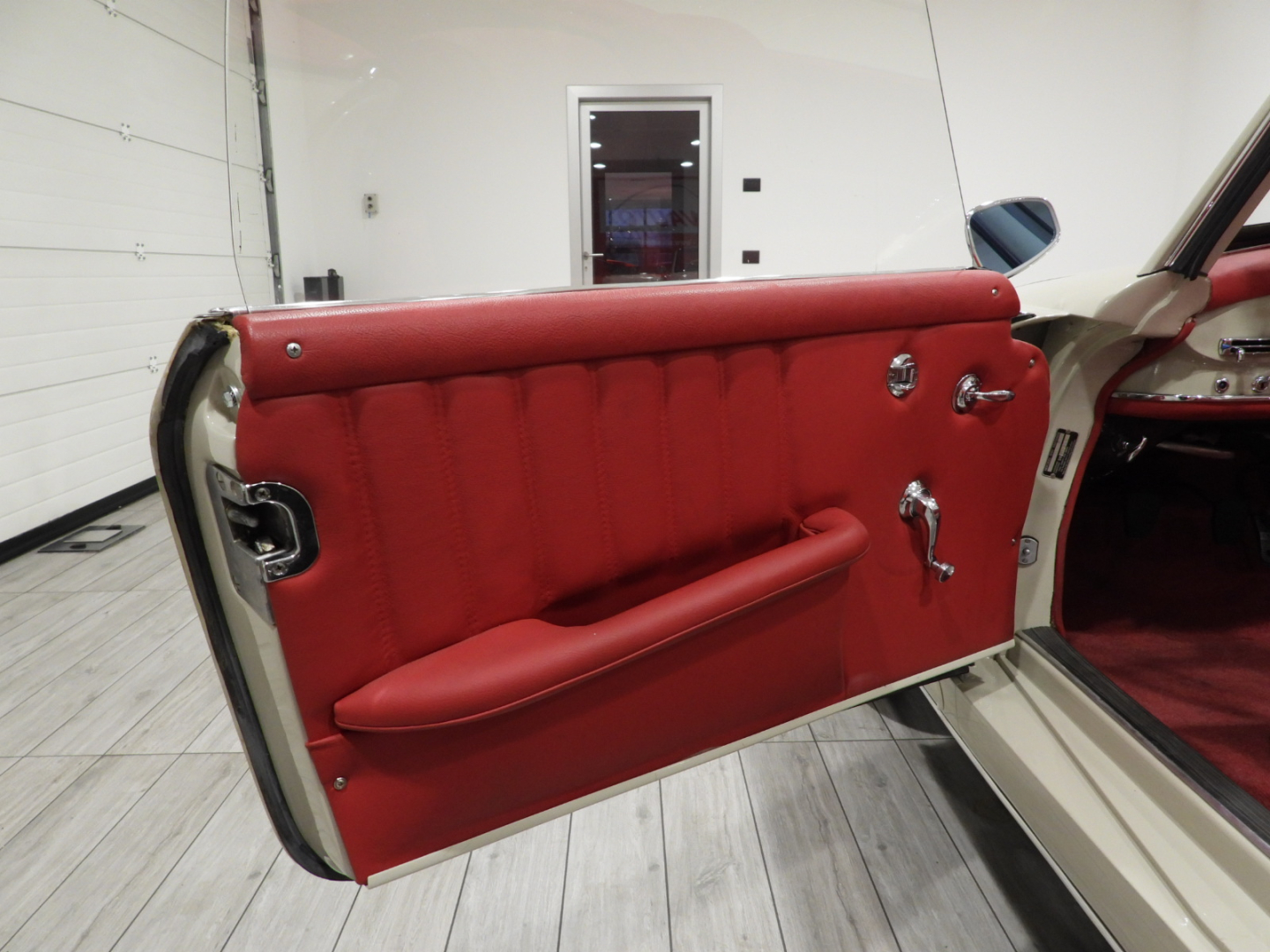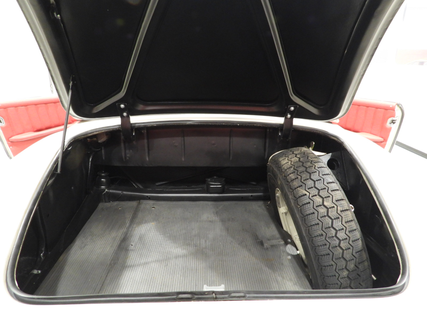 Sedili e pannelli in tutta pelle cartier, Moquette in lana rossa al pavimento, Specchio esterno lato guida cromato, Autoradio Blaupunkt con antenna manuale al parafango anteriore sinistro, Cerchi in ferro con calotte in tinta carrozzeria con anello cromato con pneumatici Michelin 6.40 R13, Capotte in tela nera, Hard top in tinta carrozzeria