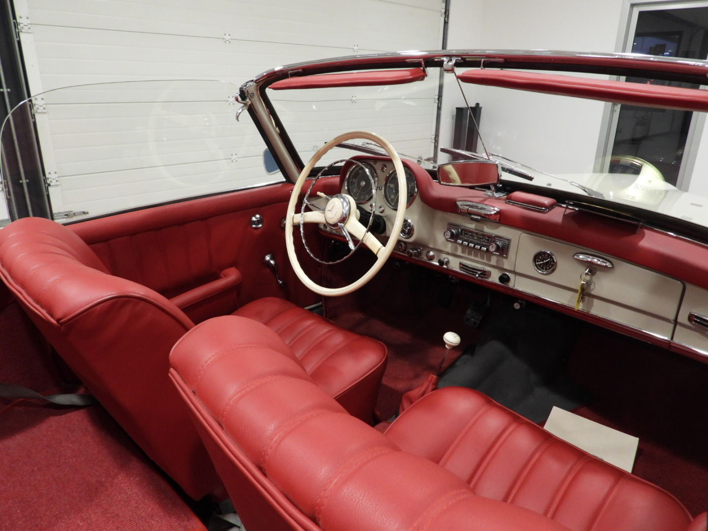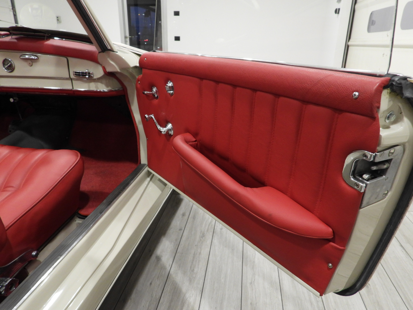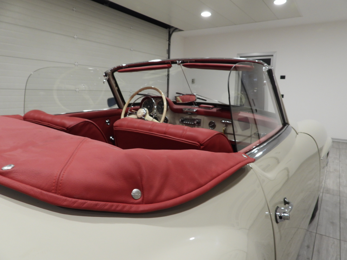 Sedili e pannelli in tutta pelle cartier, Moquette in lana rossa al pavimento, Specchio esterno lato guida cromato, Autoradio Blaupunkt con antenna manuale al parafango anteriore sinistro, Cerchi in ferro con calotte in tinta carrozzeria con anello cromato con pneumatici Michelin 6.40 R13, Capotte in tela nera, Hard top in tinta carrozzeria