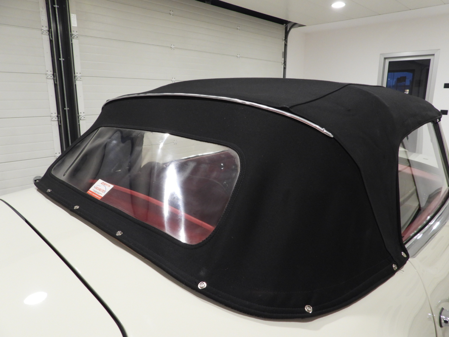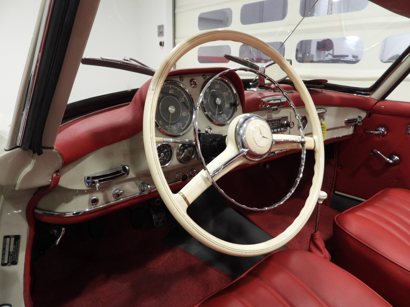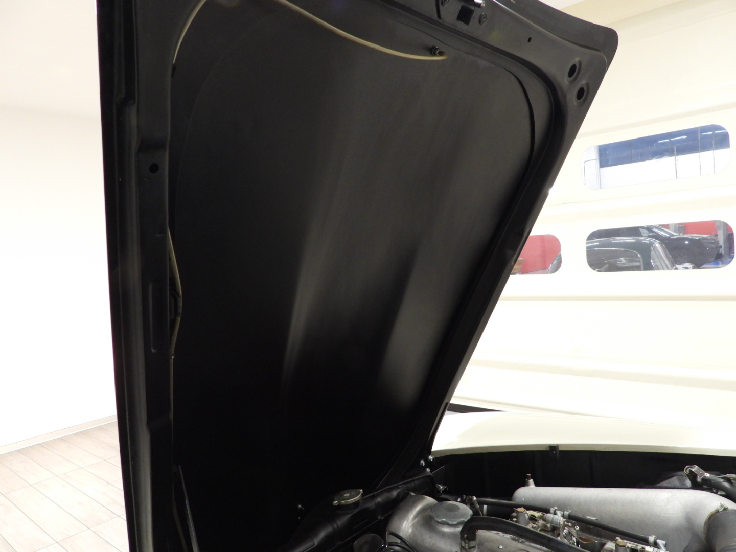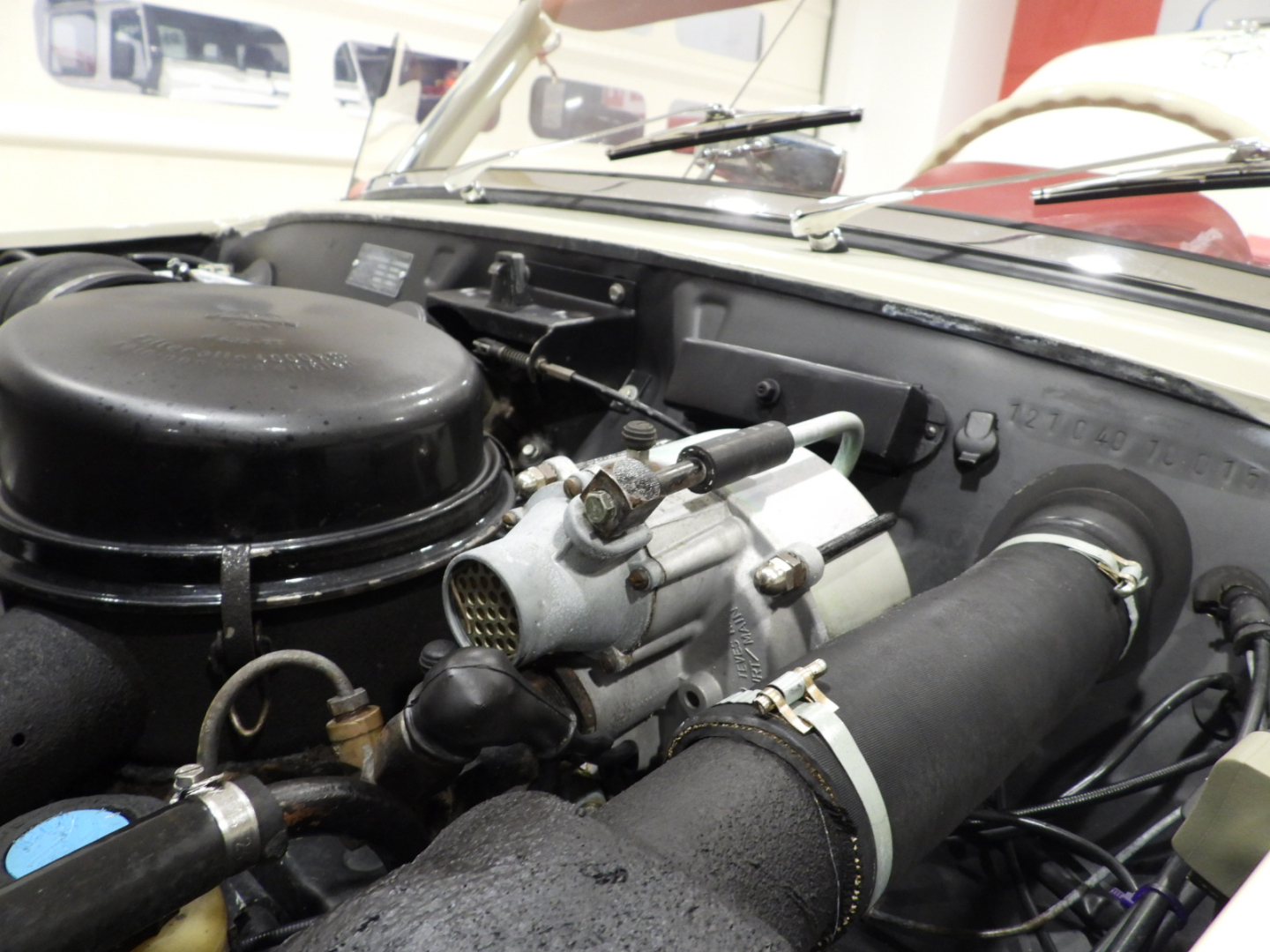 Sedili e pannelli in tutta pelle cartier, Moquette in lana rossa al pavimento, Specchio esterno lato guida cromato, Autoradio Blaupunkt con antenna manuale al parafango anteriore sinistro, Cerchi in ferro con calotte in tinta carrozzeria con anello cromato con pneumatici Michelin 6.40 R13, Capotte in tela nera, Hard top in tinta carrozzeria