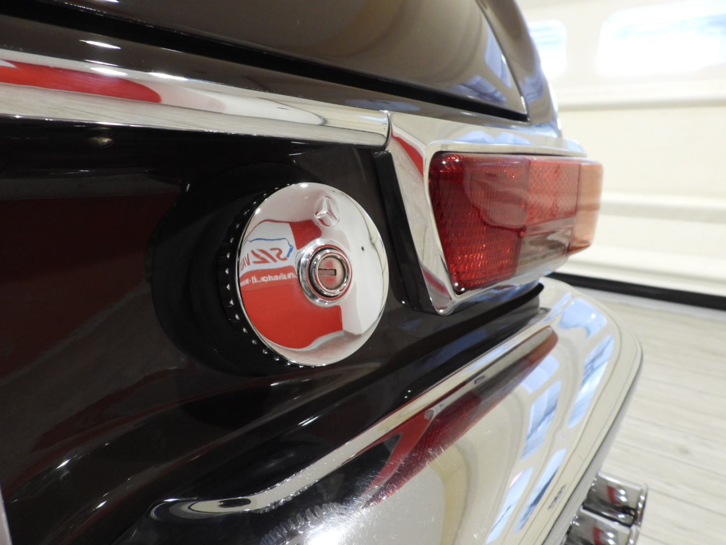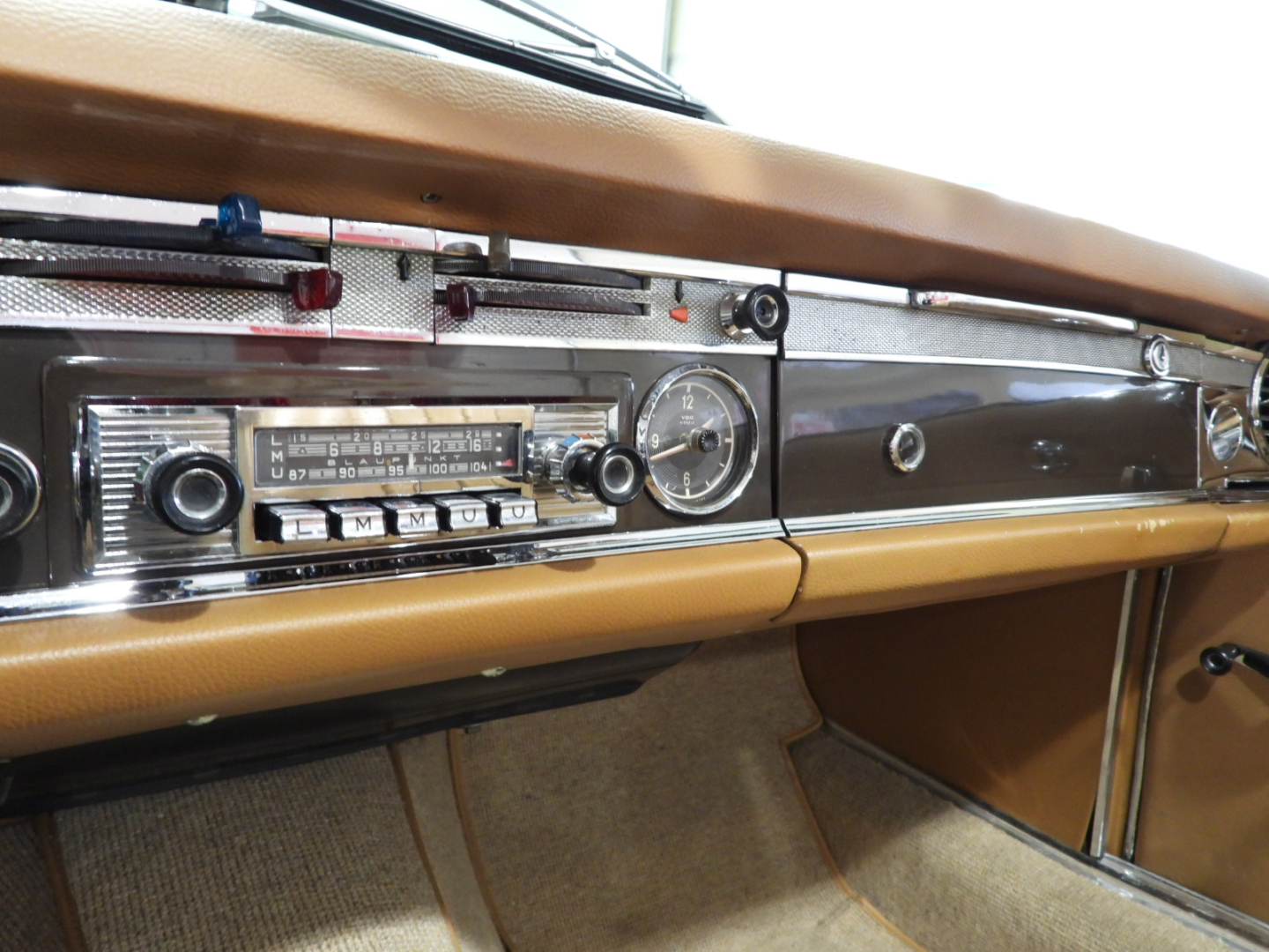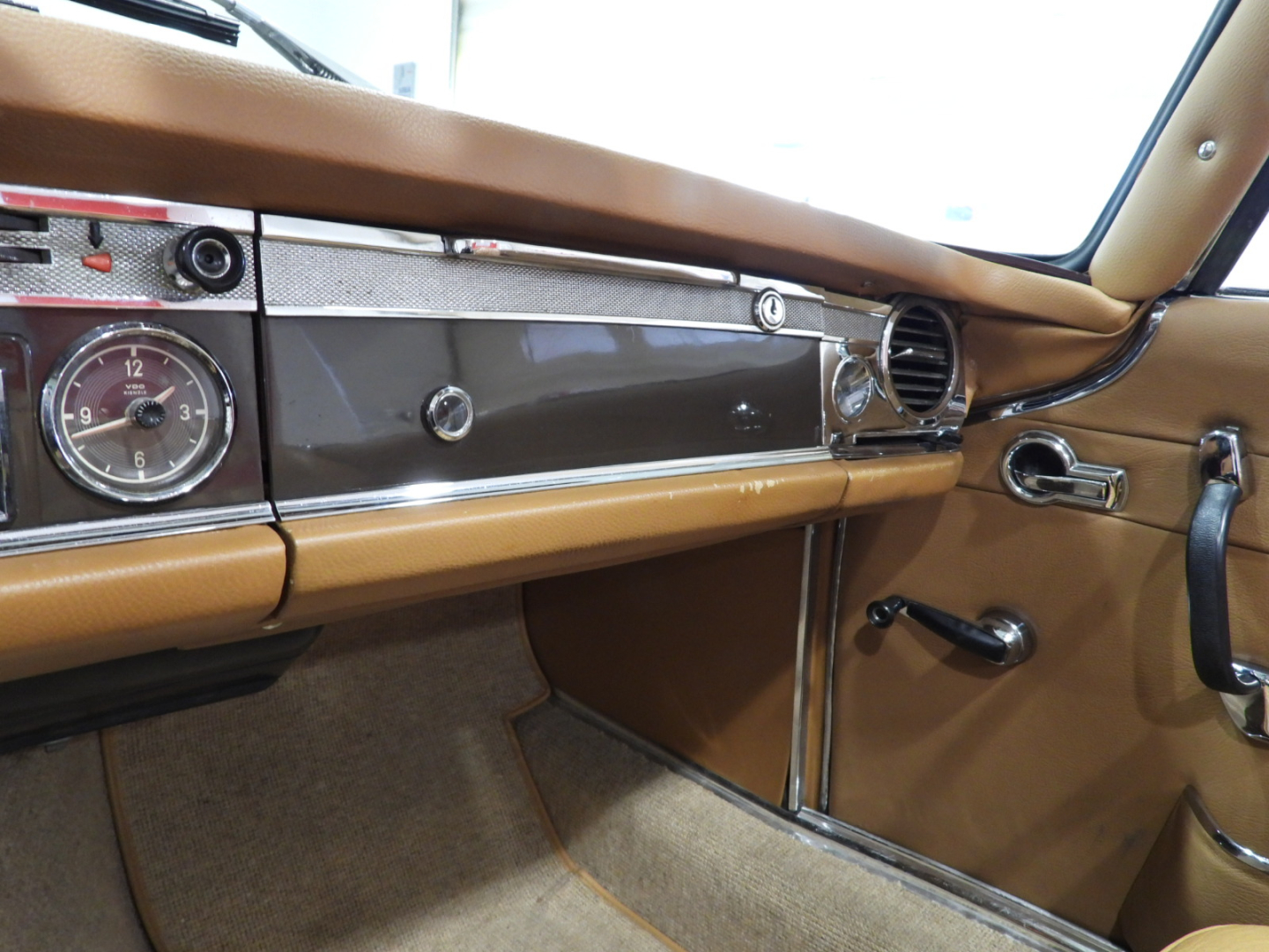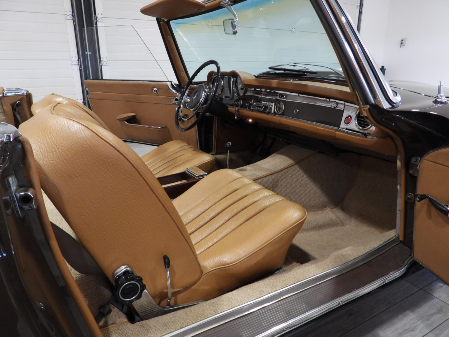 Sedili e pannelli in MB Tex color Cognac cod. 2402, Moquette al pavimento in bouclet havana, Autoradio Blaupunkt dell’epoca con antenna elettrica al parafango anteriore destro, Specchio esterno lato guida cromato, Cerchi in ferro cromati con calotta Mercedes-Benz verniciati in tinta carrozzeria con pneumatici Michelin 185HR14 con bordo in rilievo salva marciapiede, Soft top in tela marrone 737, Hard top in tinta carrozzeria, Staccabatteria