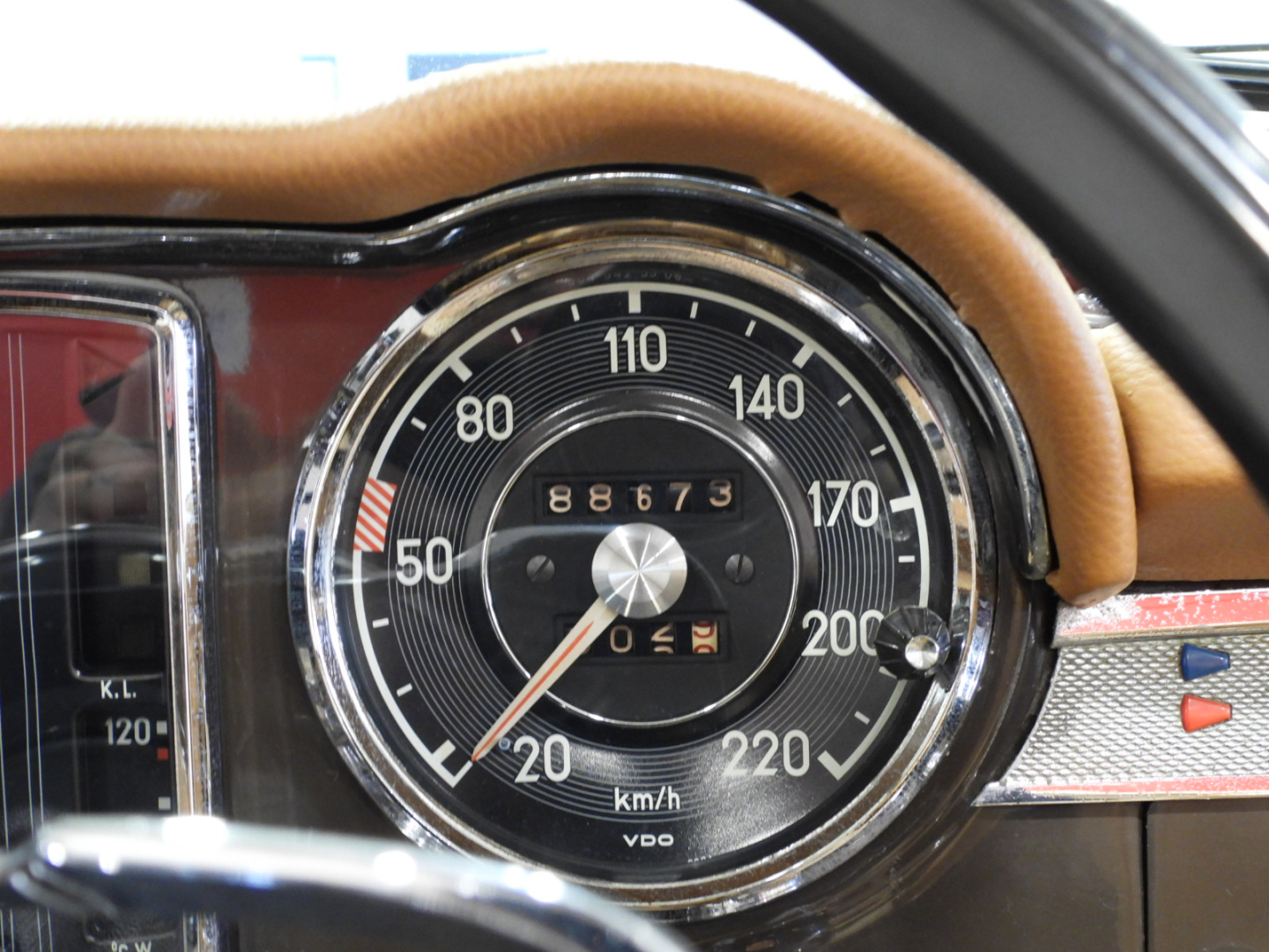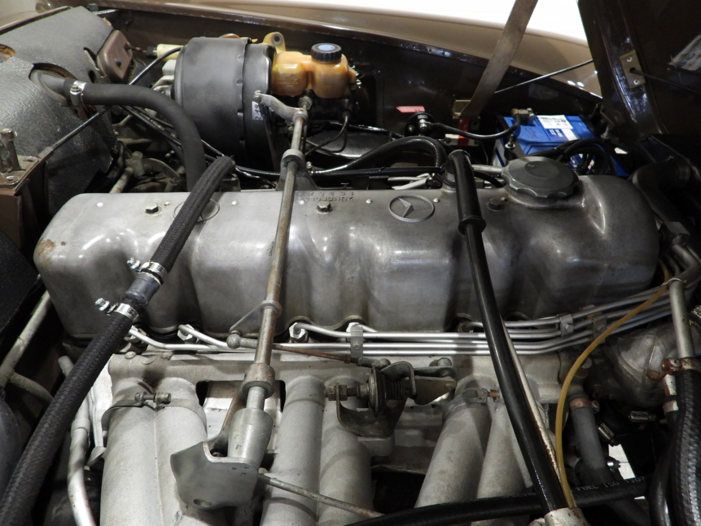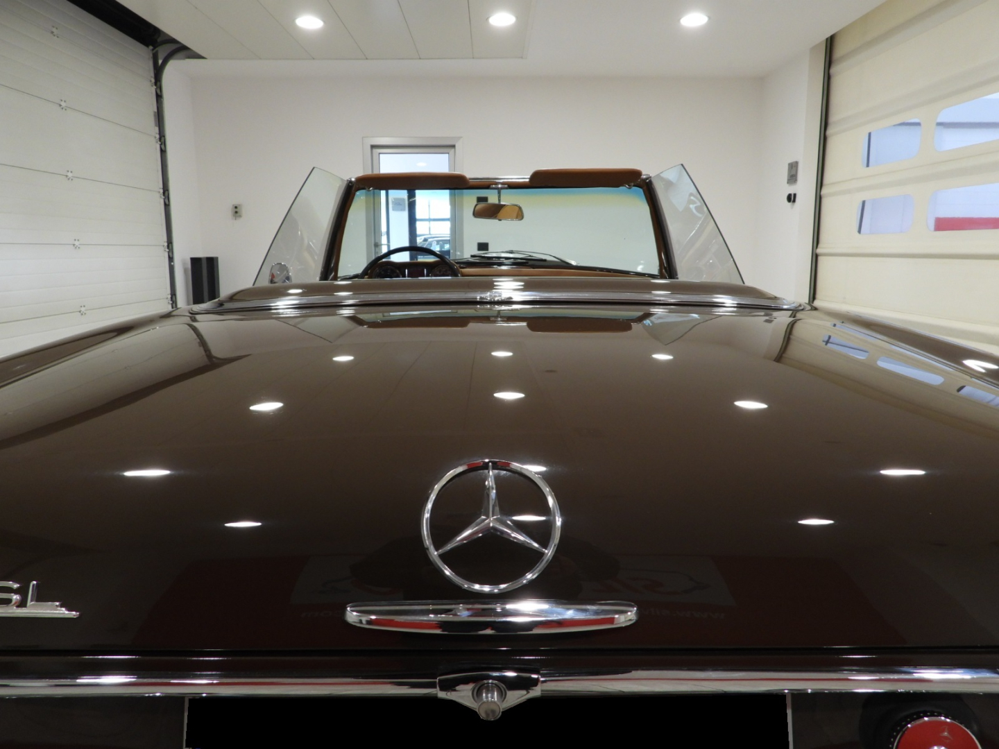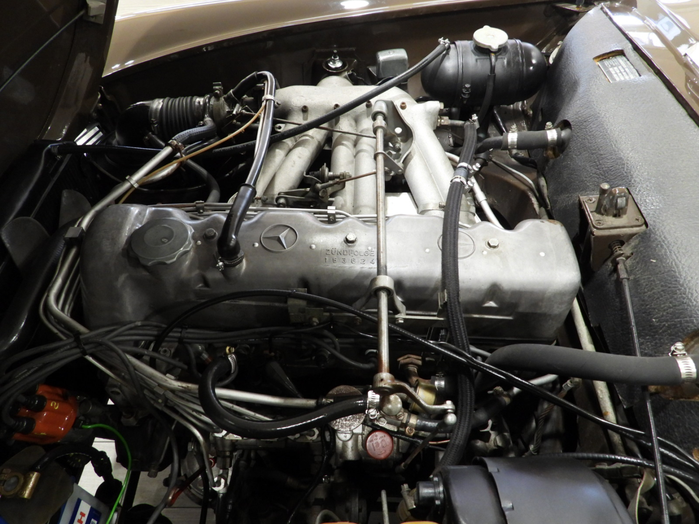 Sedili e pannelli in MB Tex color Cognac cod. 2402, Moquette al pavimento in bouclet havana, Autoradio Blaupunkt dell’epoca con antenna elettrica al parafango anteriore destro, Specchio esterno lato guida cromato, Cerchi in ferro cromati con calotta Mercedes-Benz verniciati in tinta carrozzeria con pneumatici Michelin 185HR14 con bordo in rilievo salva marciapiede, Soft top in tela marrone 737, Hard top in tinta carrozzeria, Staccabatteria