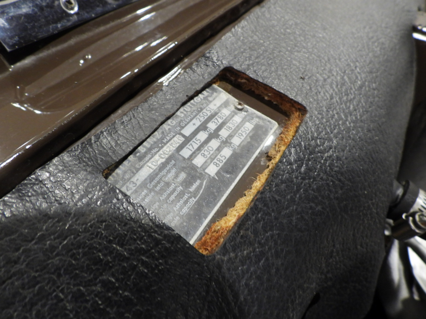 Sedili e pannelli in MB Tex color Cognac cod. 2402, Moquette al pavimento in bouclet havana, Autoradio Blaupunkt dell’epoca con antenna elettrica al parafango anteriore destro…
