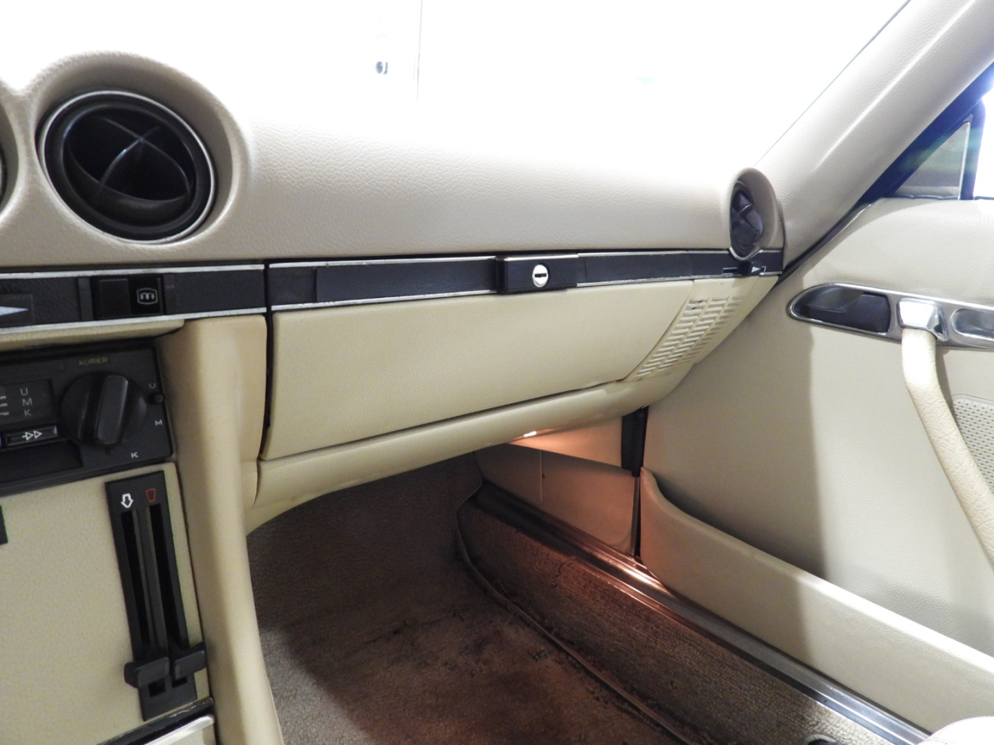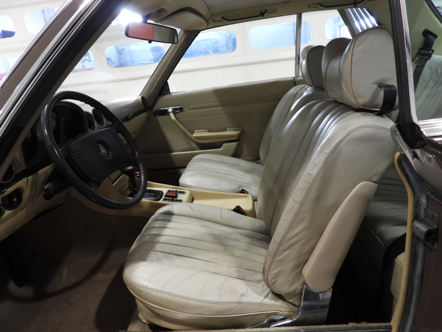 Sedili riscaldabili e pannelli in tutta pelle beige, Moquette bouclet beige al pavimento, Autoradio Becker Monza AM/FM a cassetta Stereo 7 con antenna al parafango posteriore destro, Vetri elettrici, Bracciolo posteriore, Hazard, Specchio esterno lato guida cromato a regolazione manuale interna, Cerchi in lega MB con pneumatici 205/70 R14, Staccabatteria