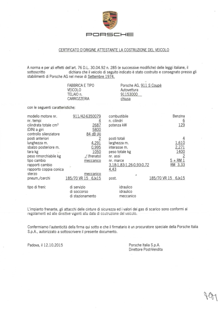 - PRESENTE CERTIFICATO D’ORIGINE ATTESTANTE LA COSTRUZIONE DEL VEICOLO RILASCIATO DA PORSCHE ITALIA SPA CON CARATTERISTICHE TECNICHE ANCORA CORRISPONDENTI ALLA CONFIGURAZIONE DA NUOVA