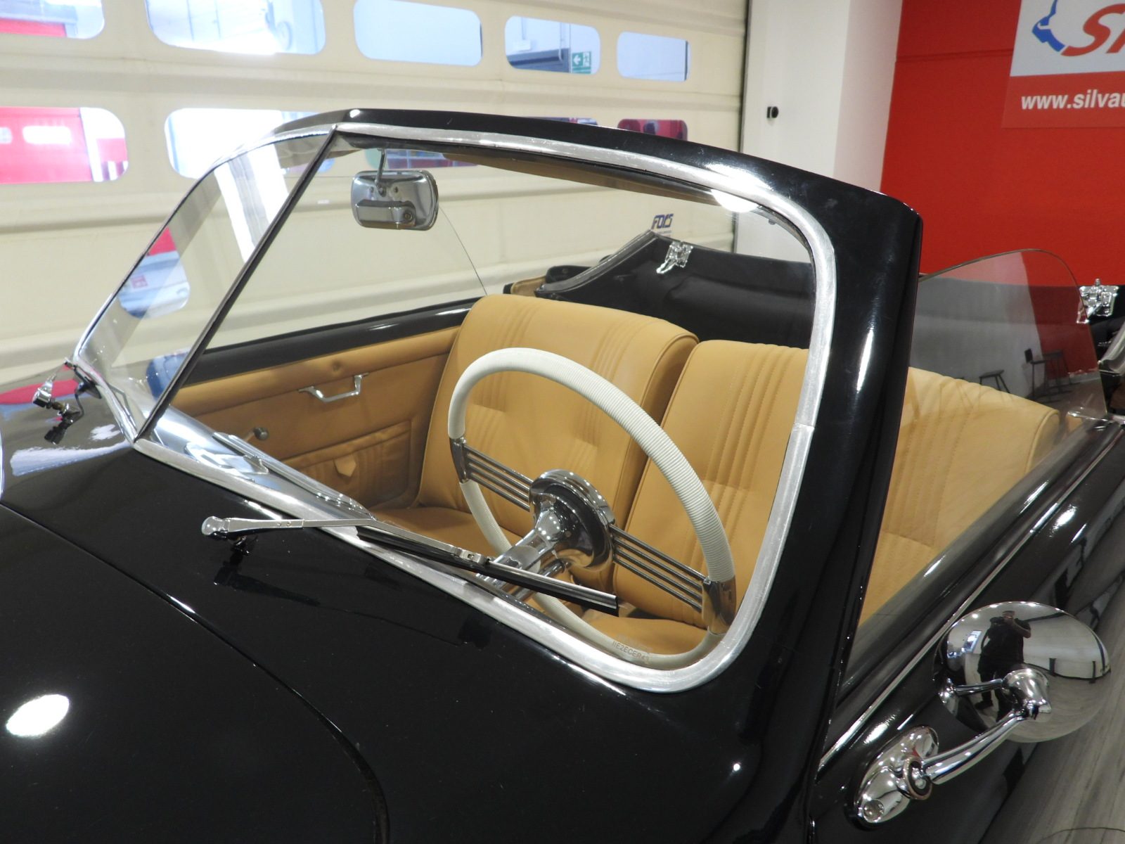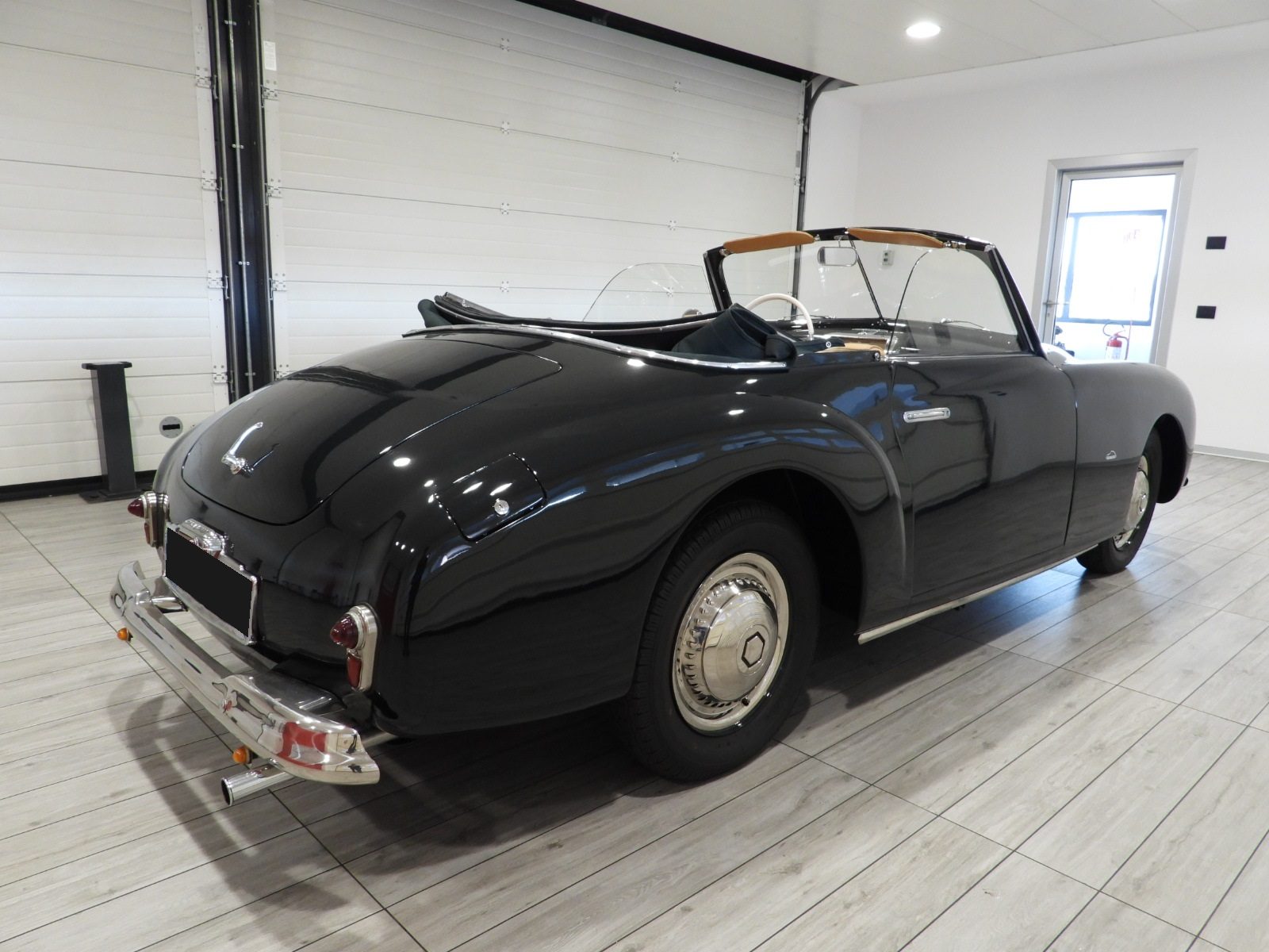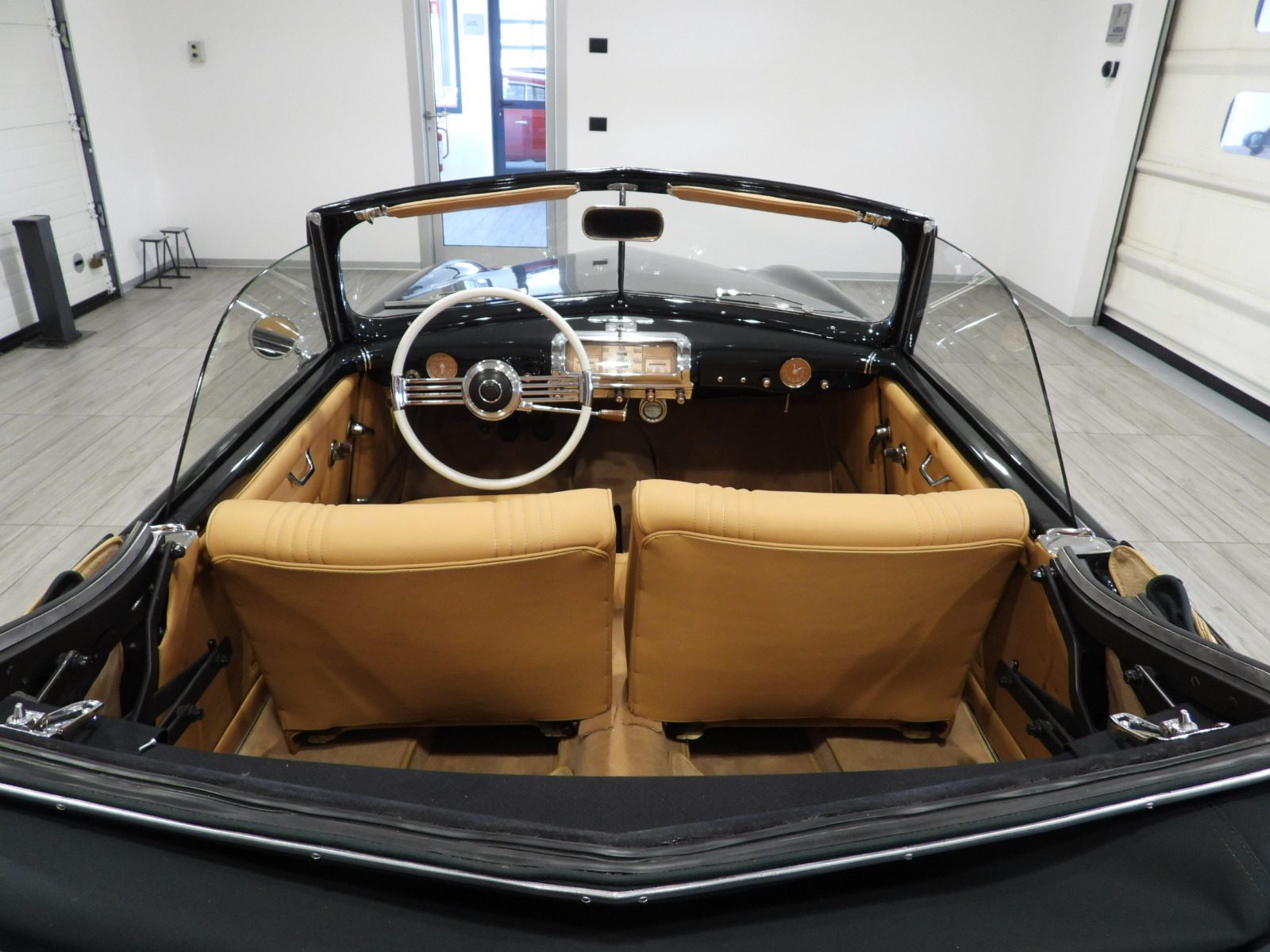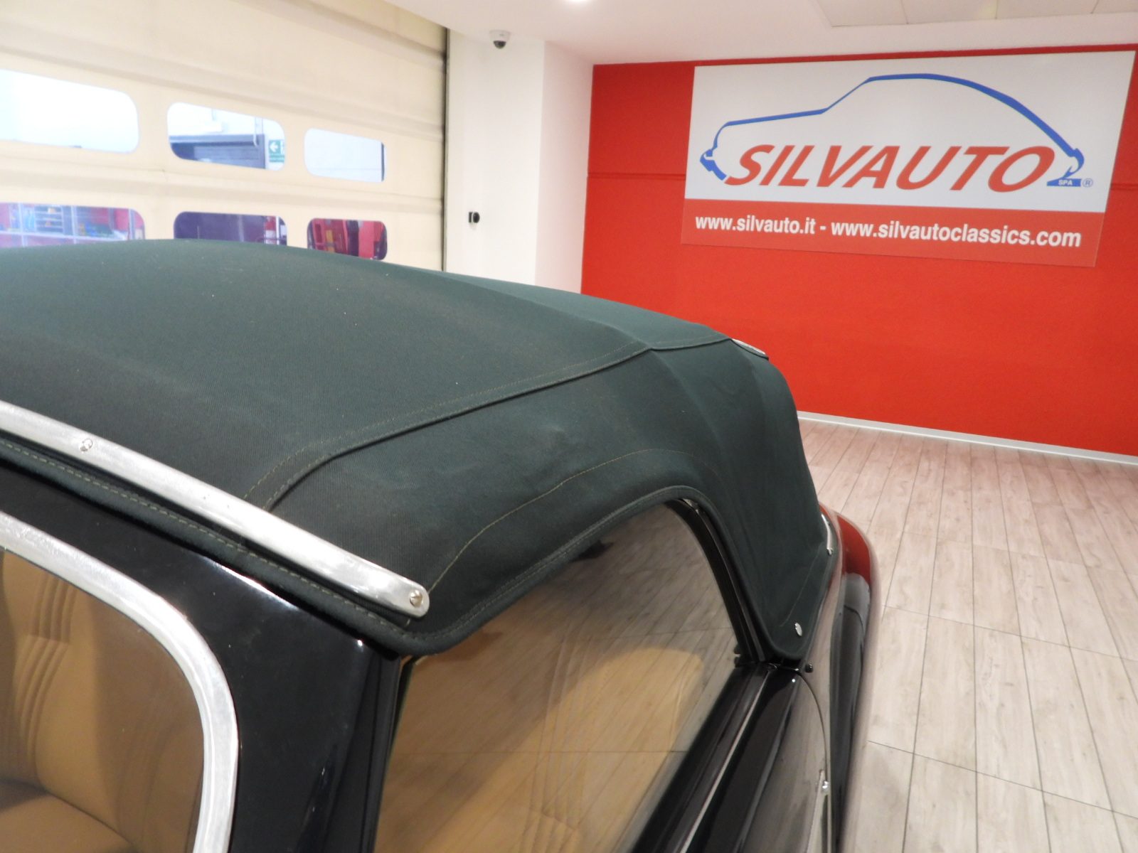 Sedili e pannelli in pelle connoly beige, Moquette in lana beige, Volante a due razze originale dell’epoca, Strumentazione rettangolare in posizione centrale in alluminio, Capotte in tela verde, Cambio al volante (accessorio Giraud)