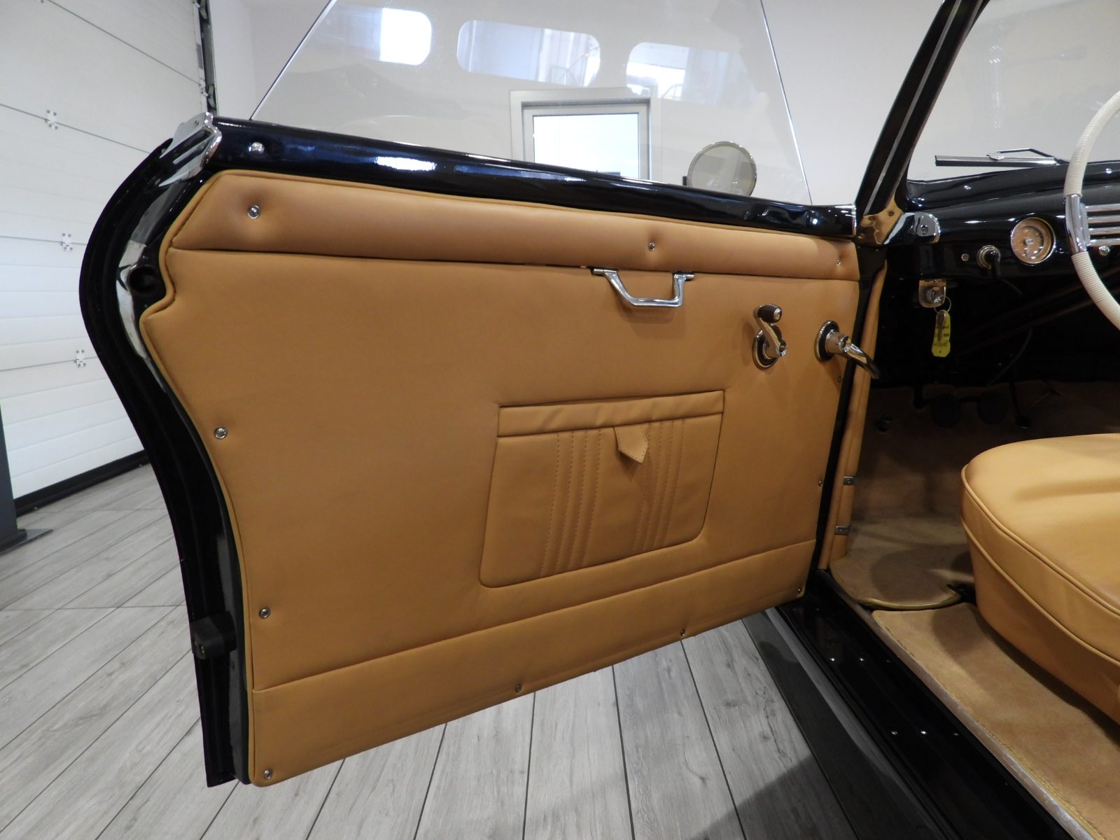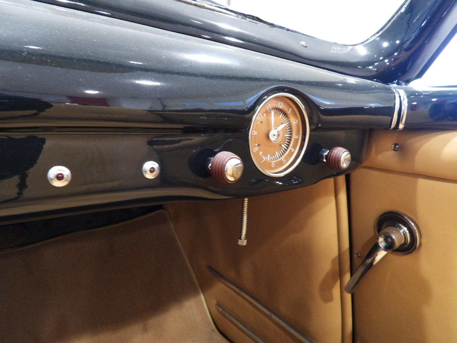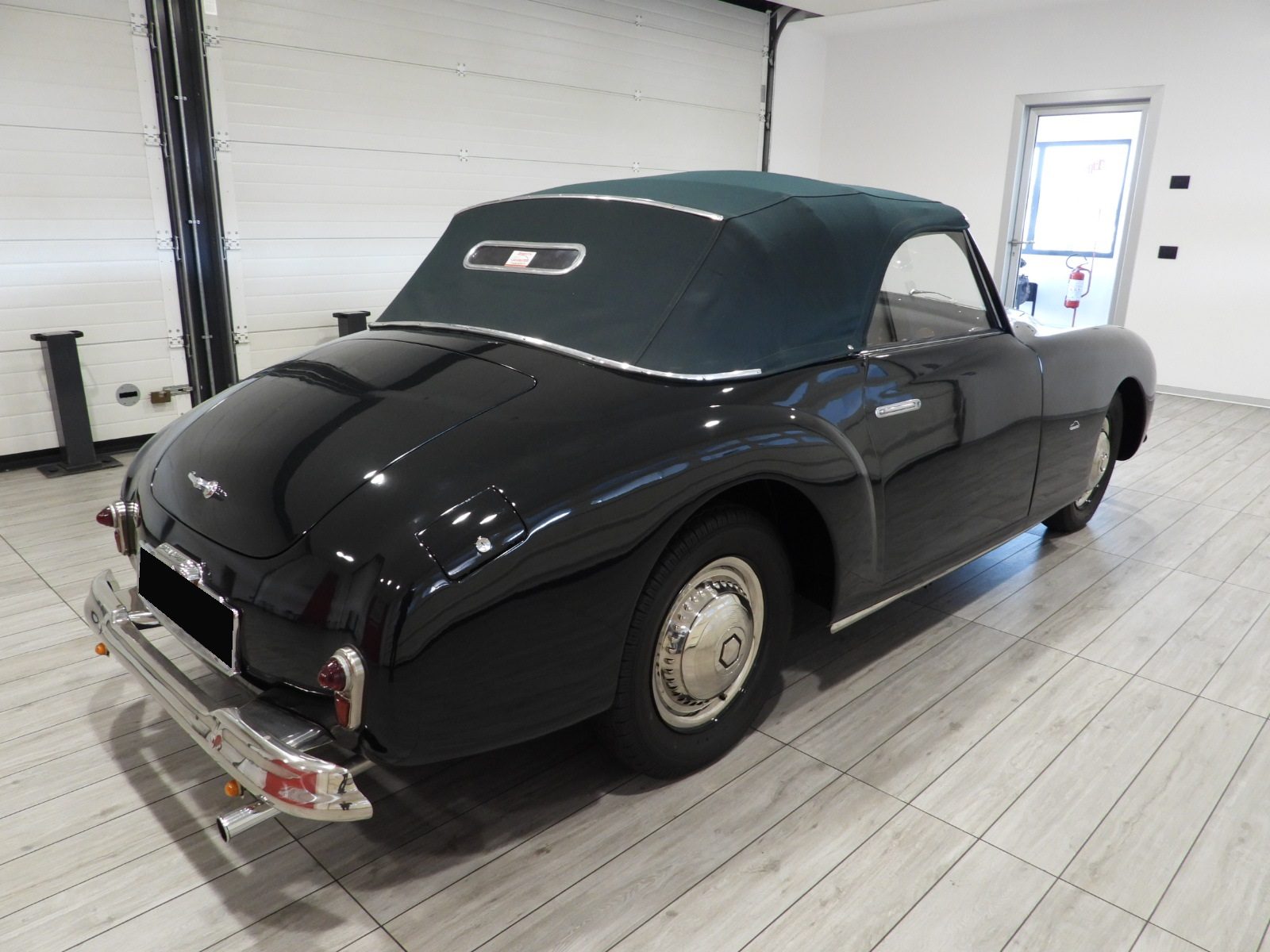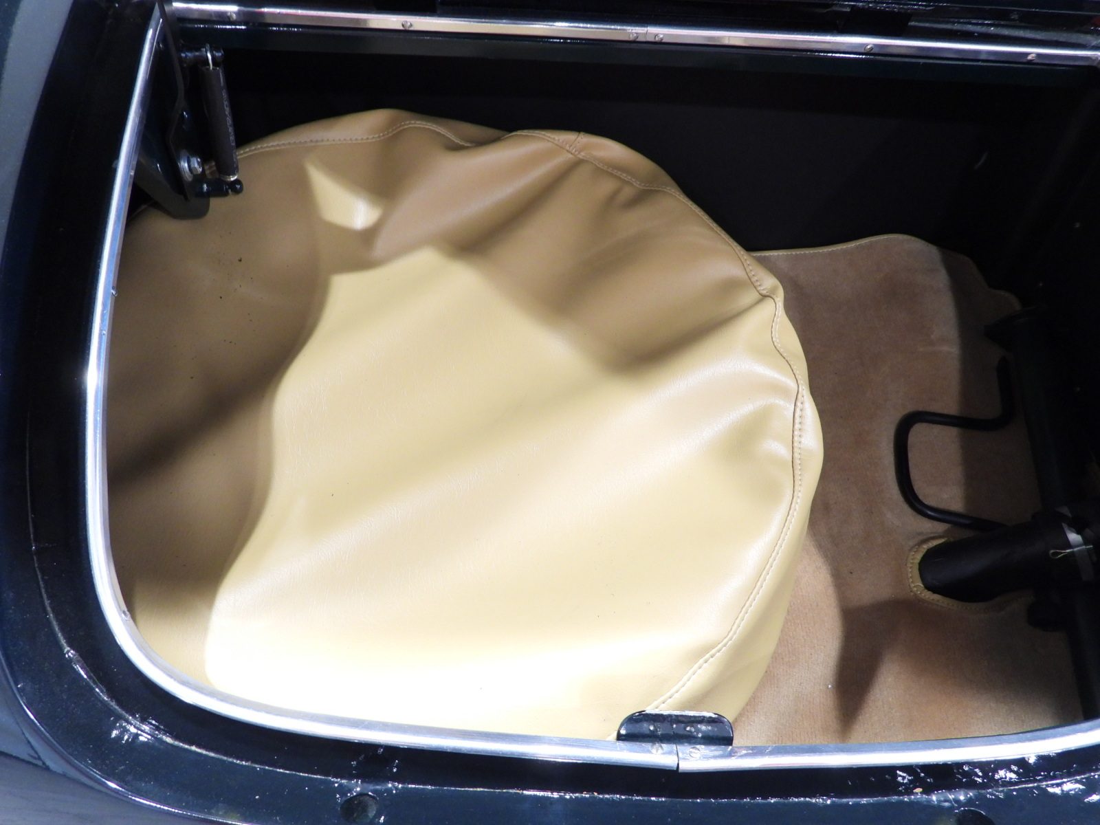 Sedili e pannelli in pelle connoly beige, Moquette in lana beige, Volante a due razze originale dell’epoca, Strumentazione rettangolare in posizione centrale in alluminio, Capotte in tela verde, Cambio al volante (accessorio Giraud)