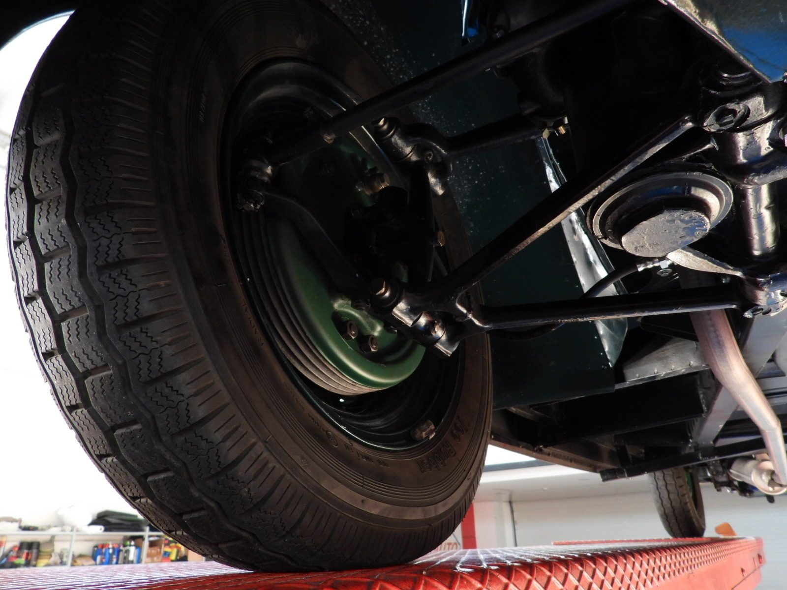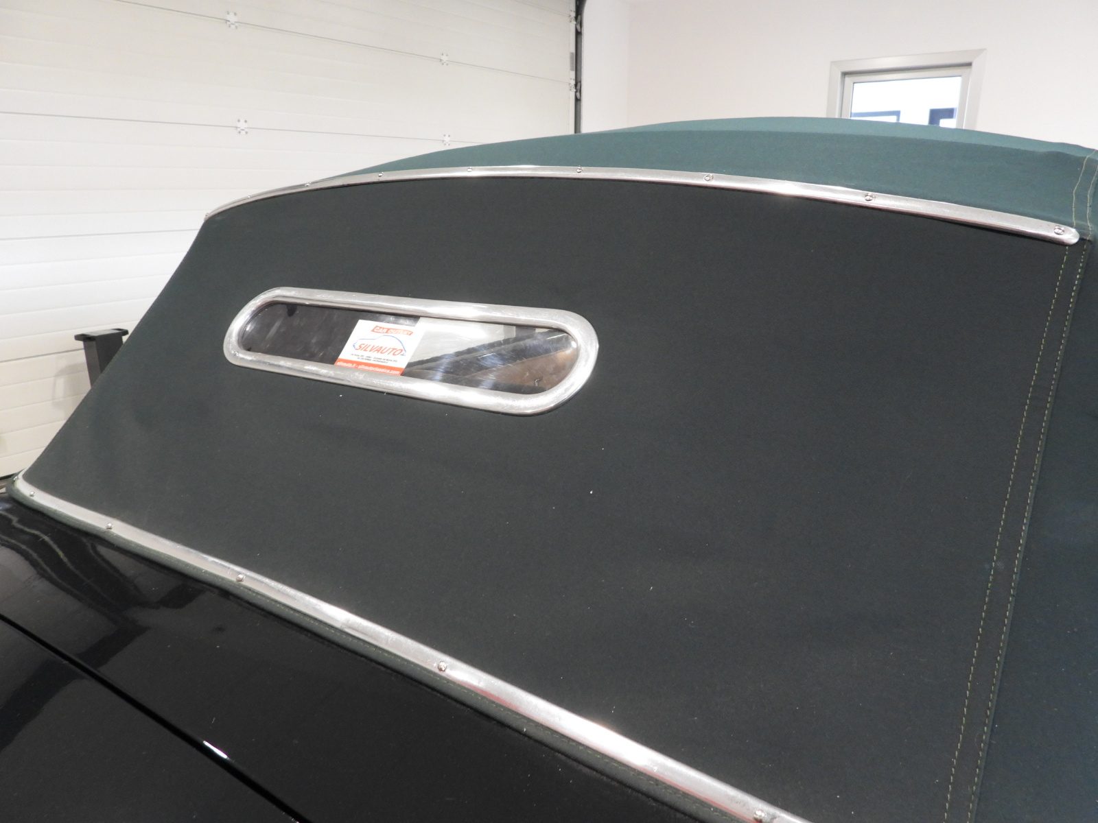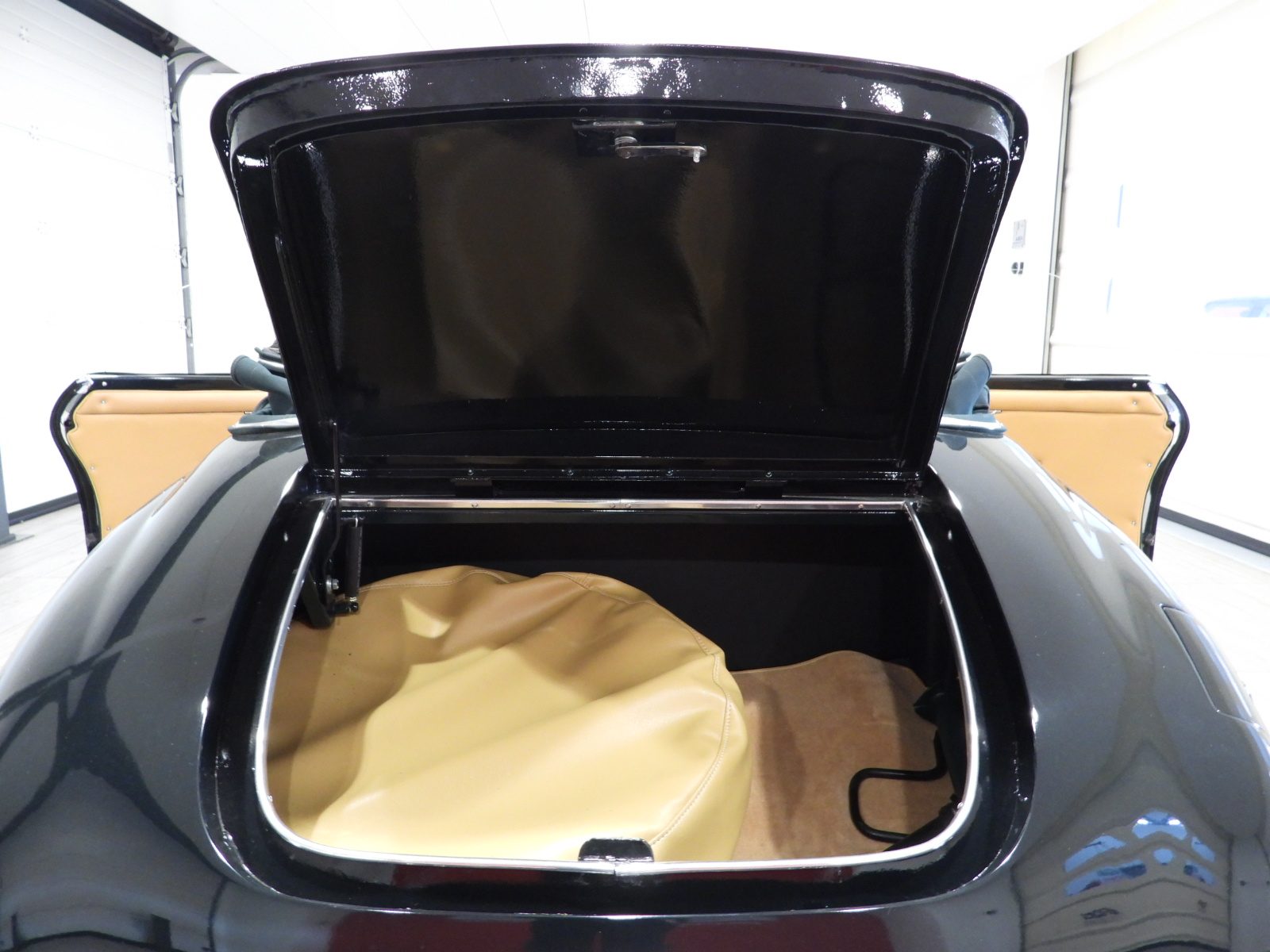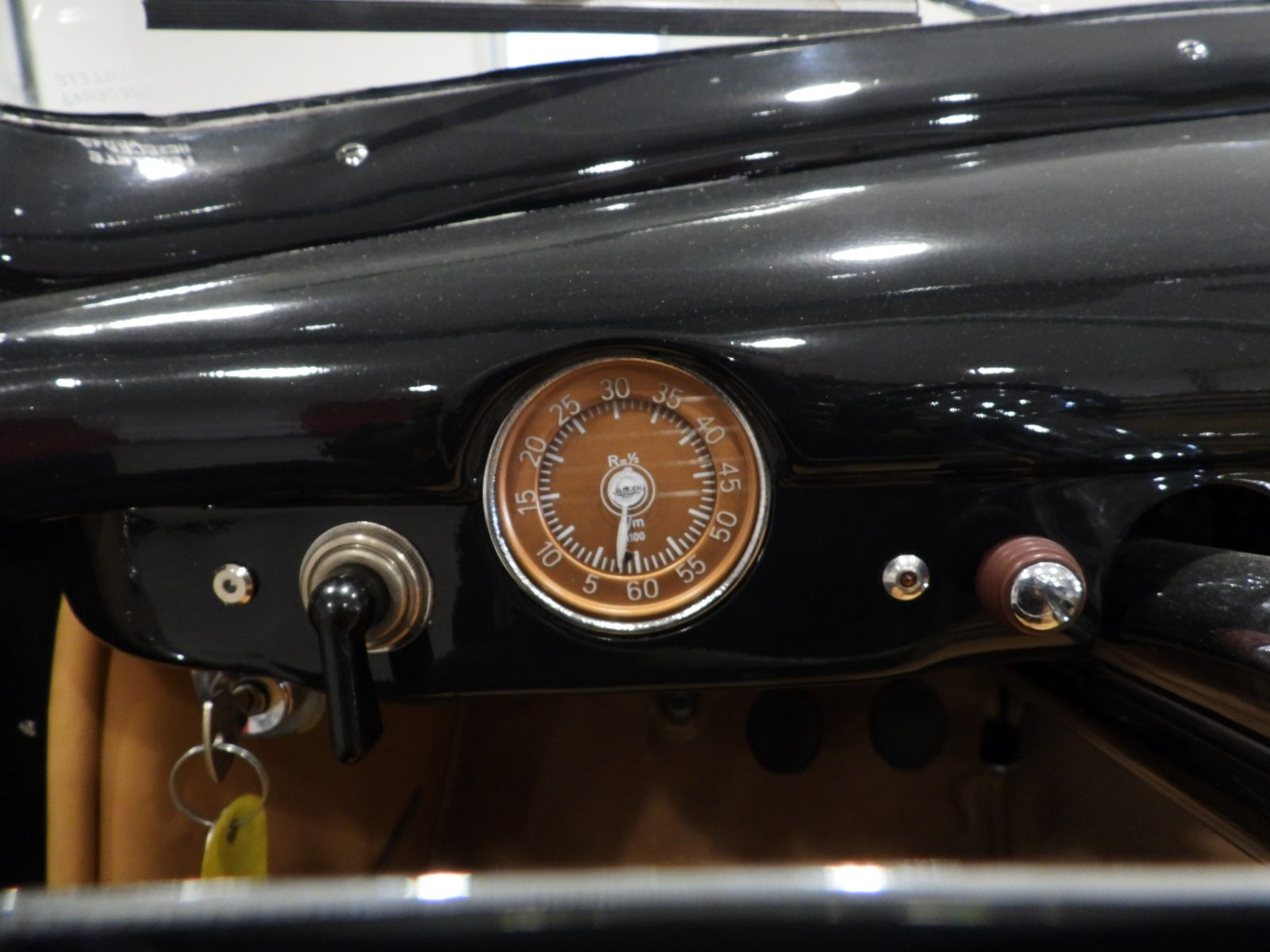 Sedili e pannelli in pelle connoly beige, Moquette in lana beige, Volante a due razze originale dell’epoca, Strumentazione rettangolare in posizione centrale in alluminio, Capotte in tela verde, Cambio al volante (accessorio Giraud)