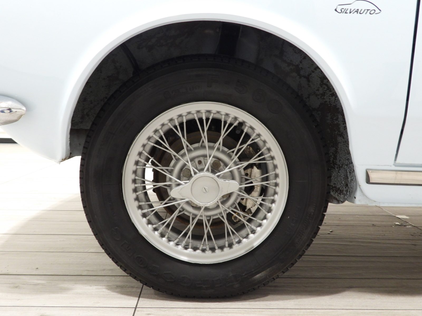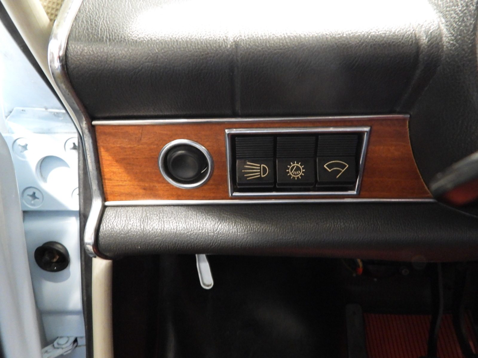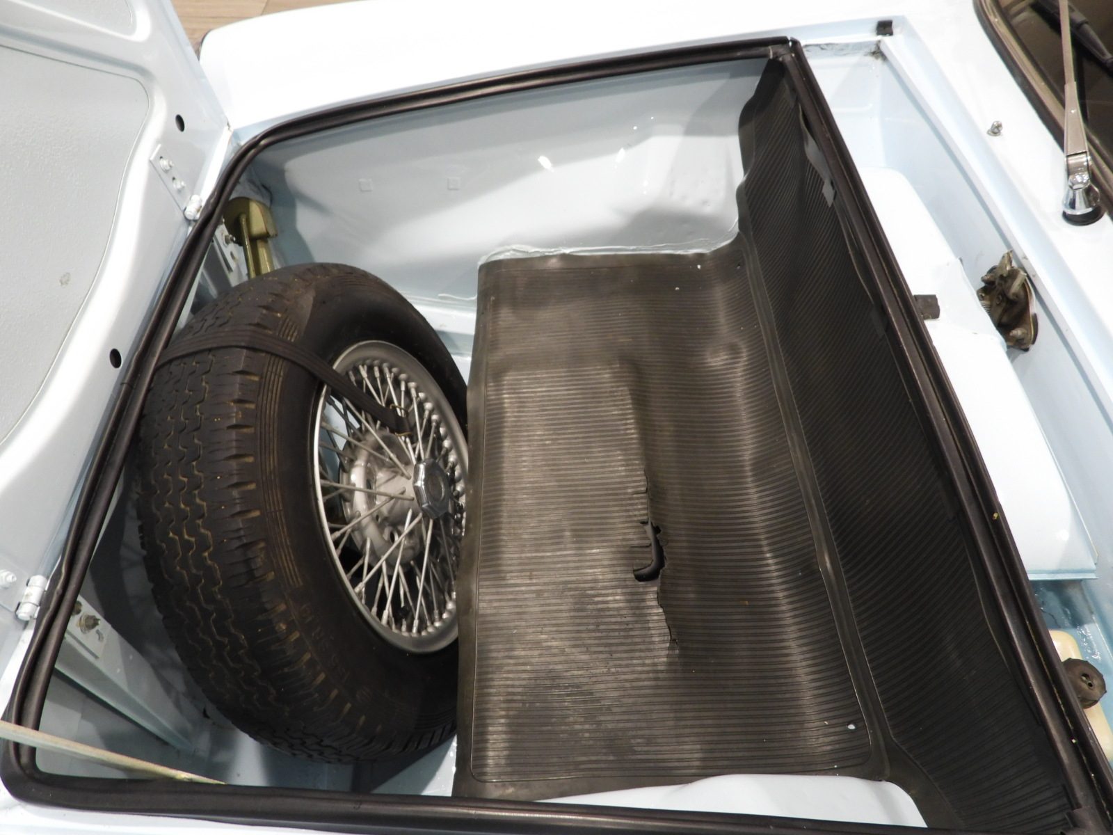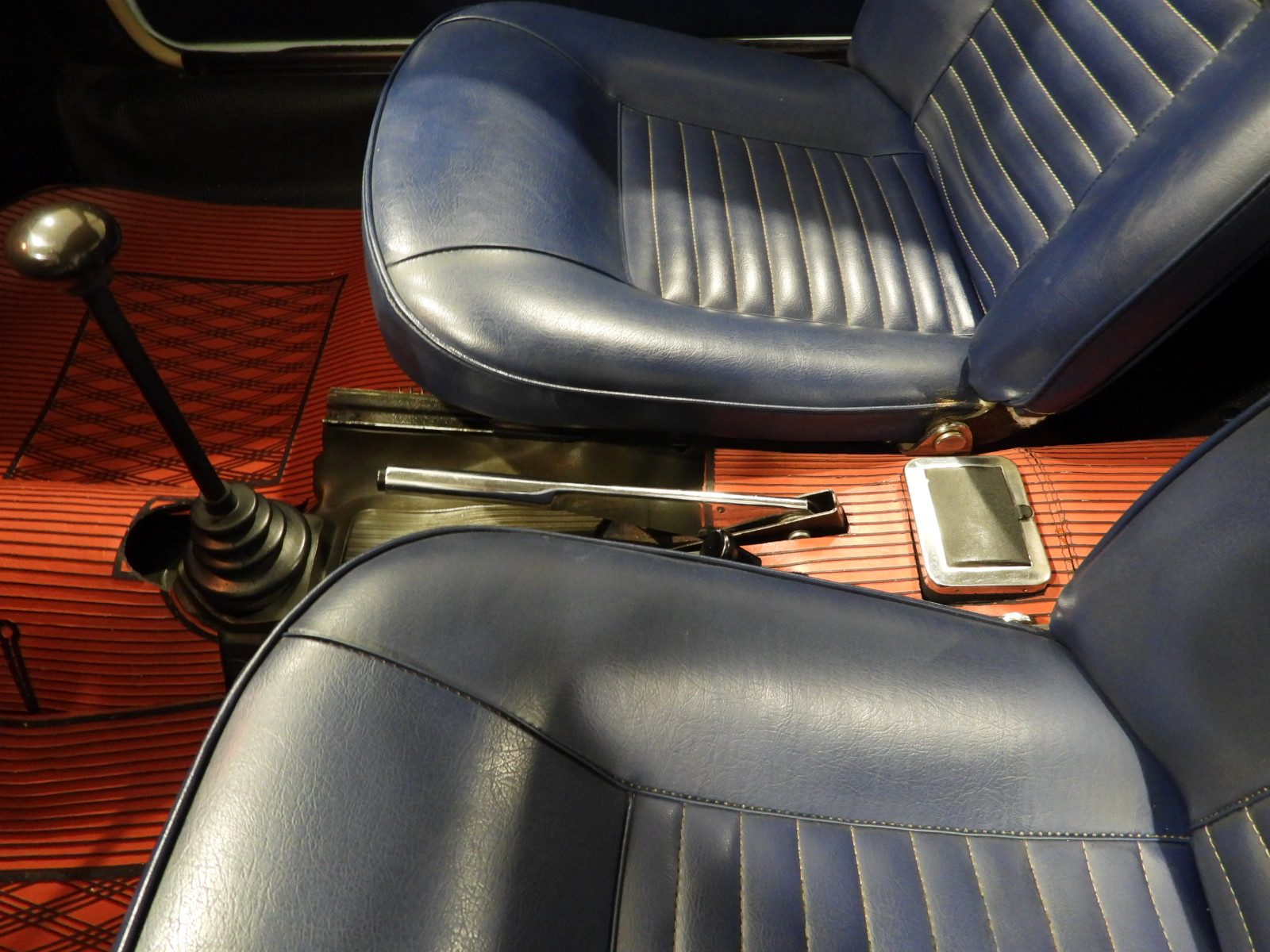 Sitze und Verkleidungen in blauem Himmel, Zwei-Speichen-Lenkrad, Holz-Armaturenbrett, Original Gummimatten der Epoche, Außenspiegel Vitaloni Fahrerseite verchromt, 5 Speichenfelgen mit Gummireifen lackiert Pirelli Gürtel P3 155 SR13
