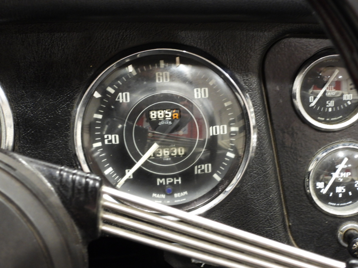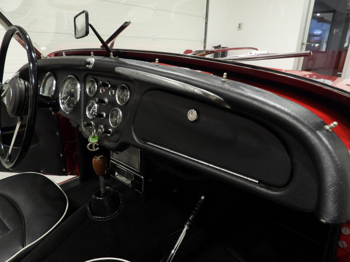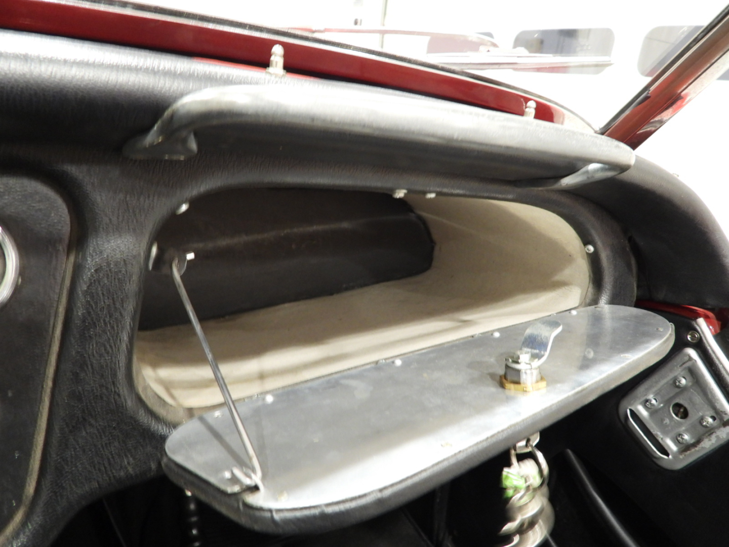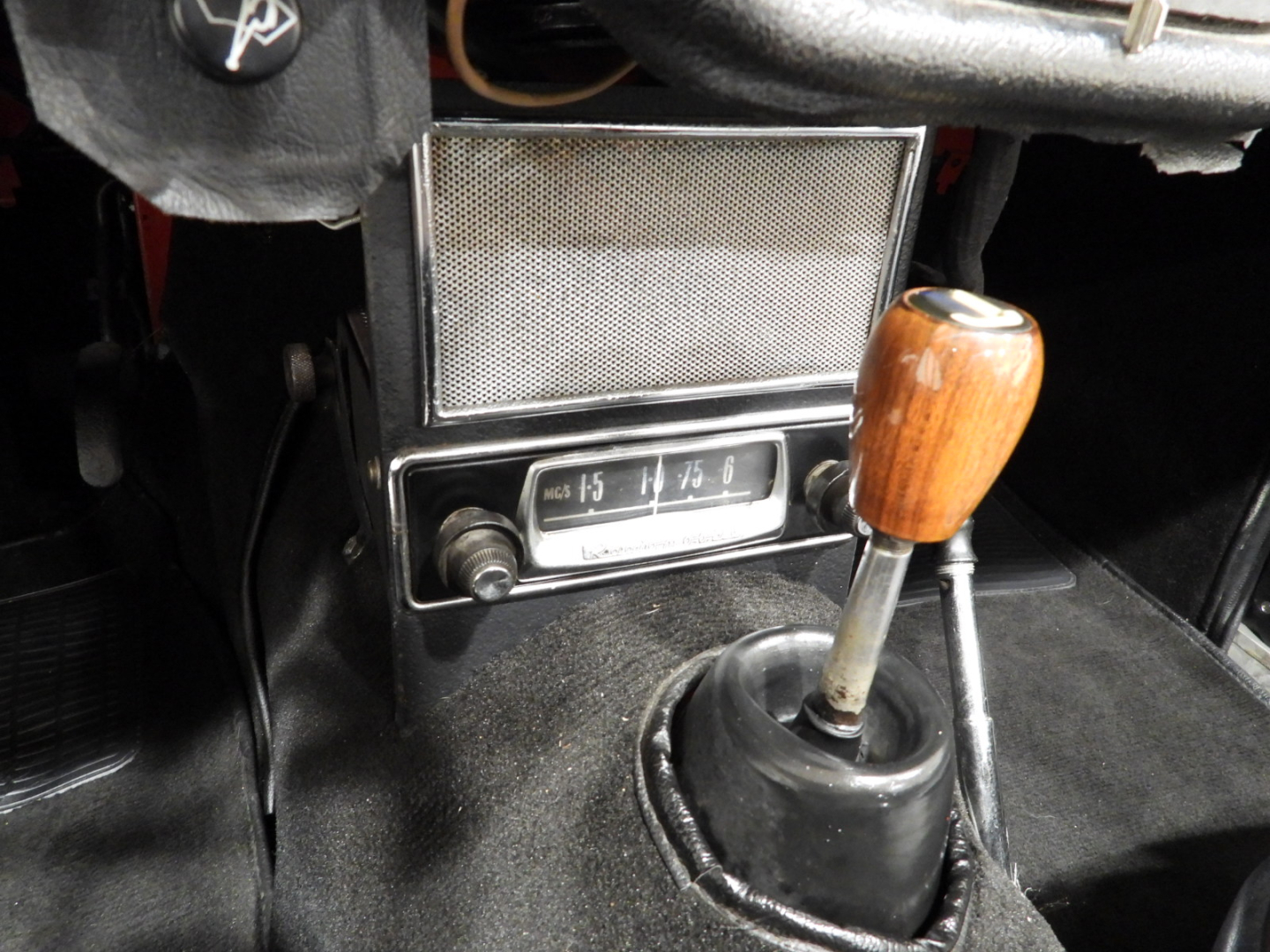 Sitze und Verkleidungen in schwarzem Himmel mit elfenbeinfarbener Paspelierung, originales Dreispeichenlenkrad, Holzschaltknauf, originales AM-Radio der damaligen Zeit, doppelte verchromte Außenspiegel an den vorderen Kotflügeln …