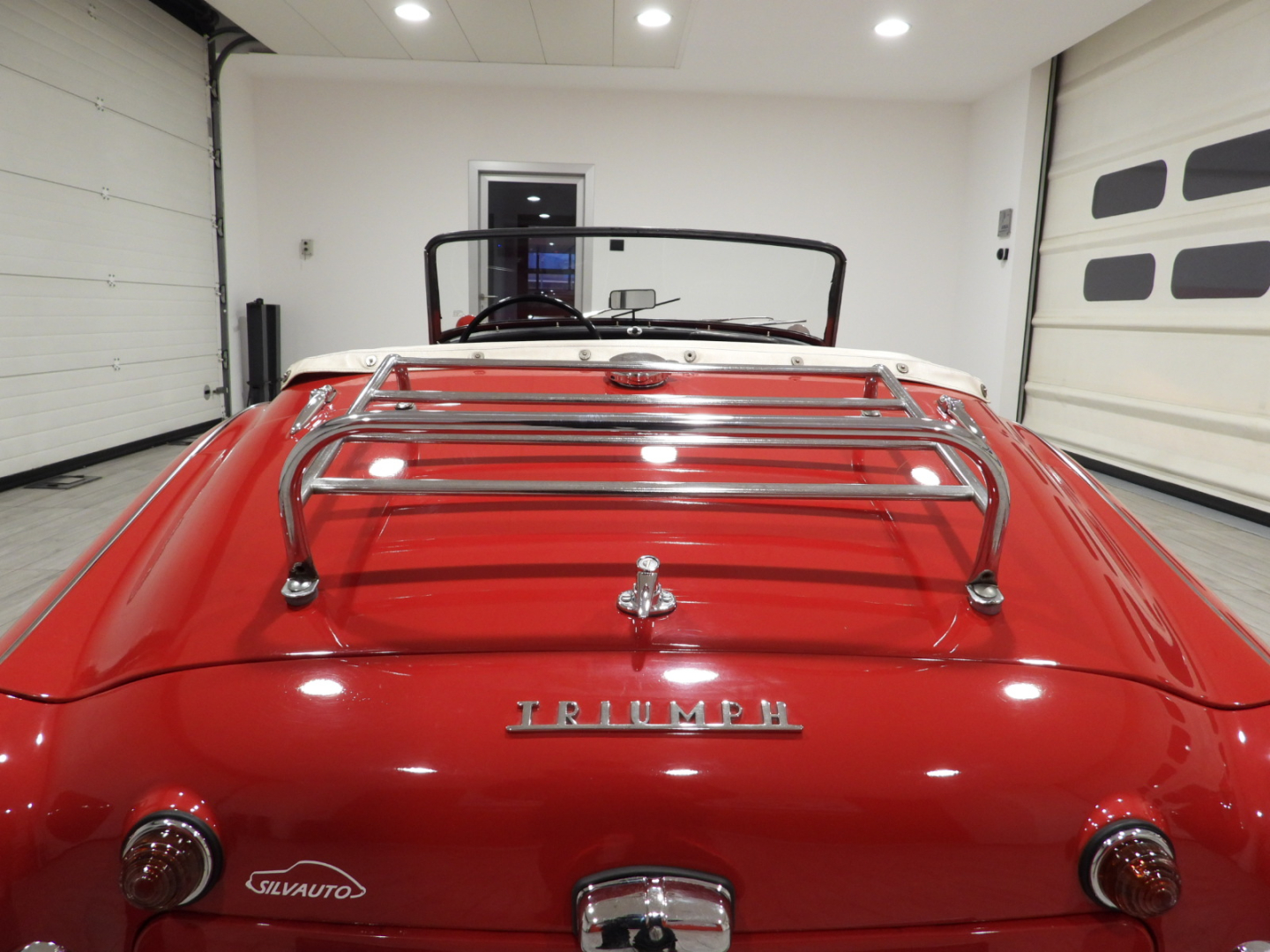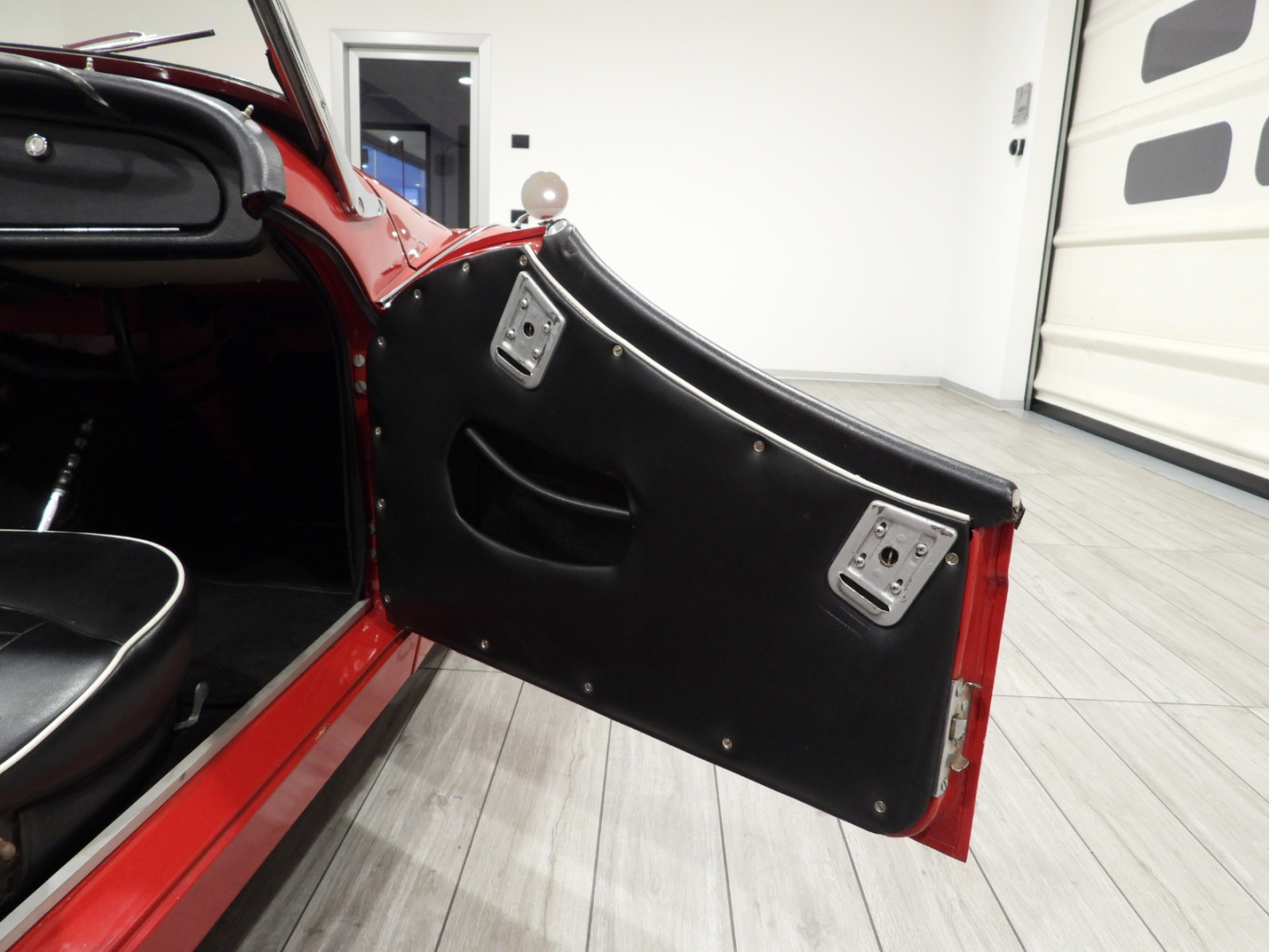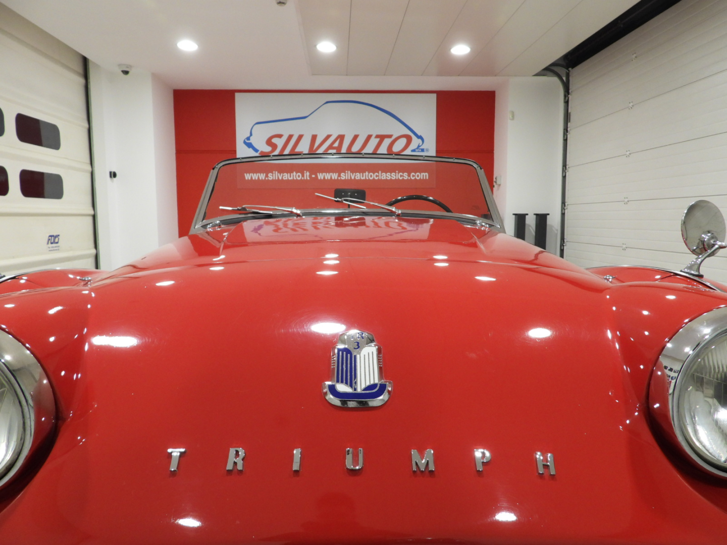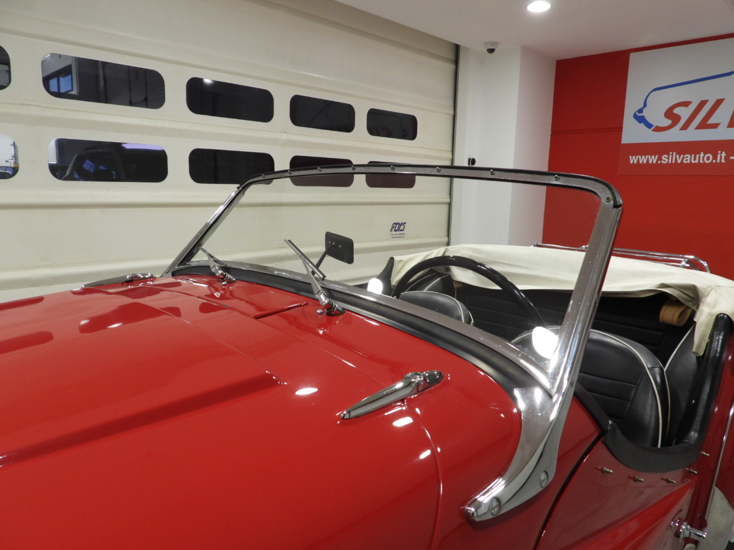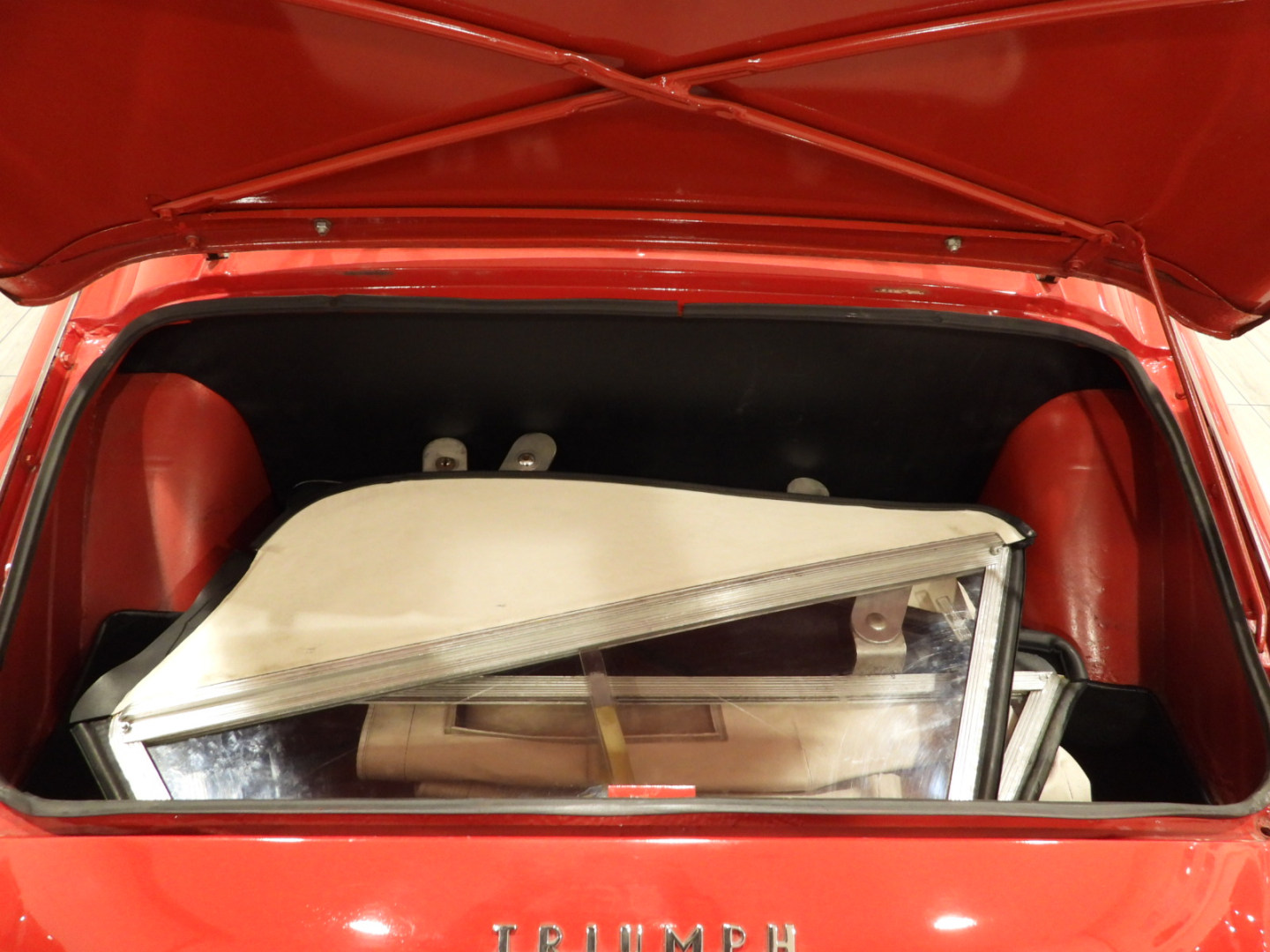 Sedili e pannelli in sky nero con pipeline avorio, Volante a tre razze originale, Pomello del cambio in legno, Autoradio AM originale dell’epoca, Doppio specchio esterno cromato ai parafanghi anteriori, Portapacchi posteriore cromato, Cerchi in ferro con calotta cromata Triumph, Capotte in Pvc avorio, Copri capotte in pvc avorio, Voletti asportabili