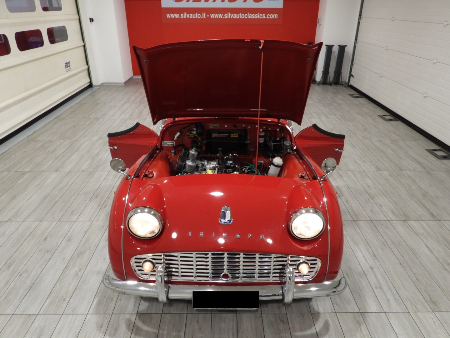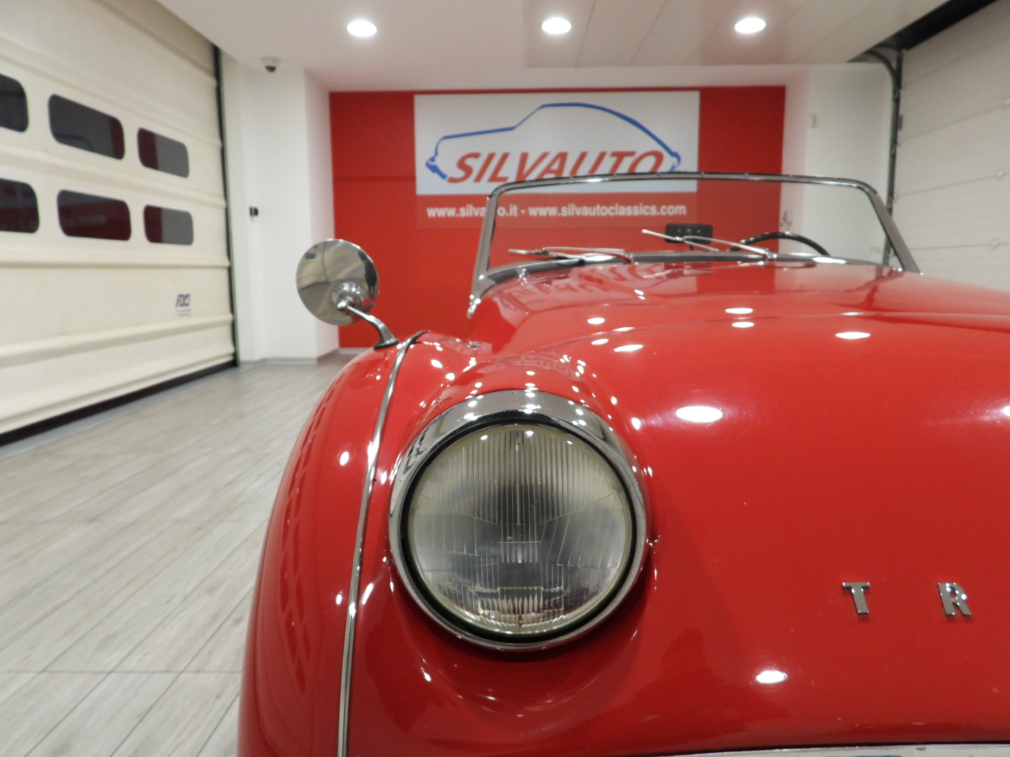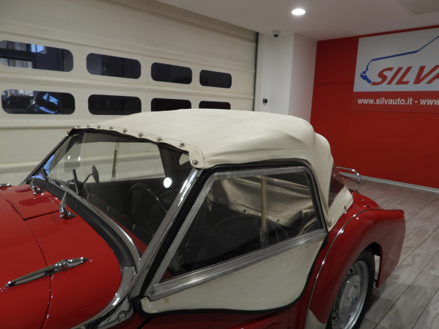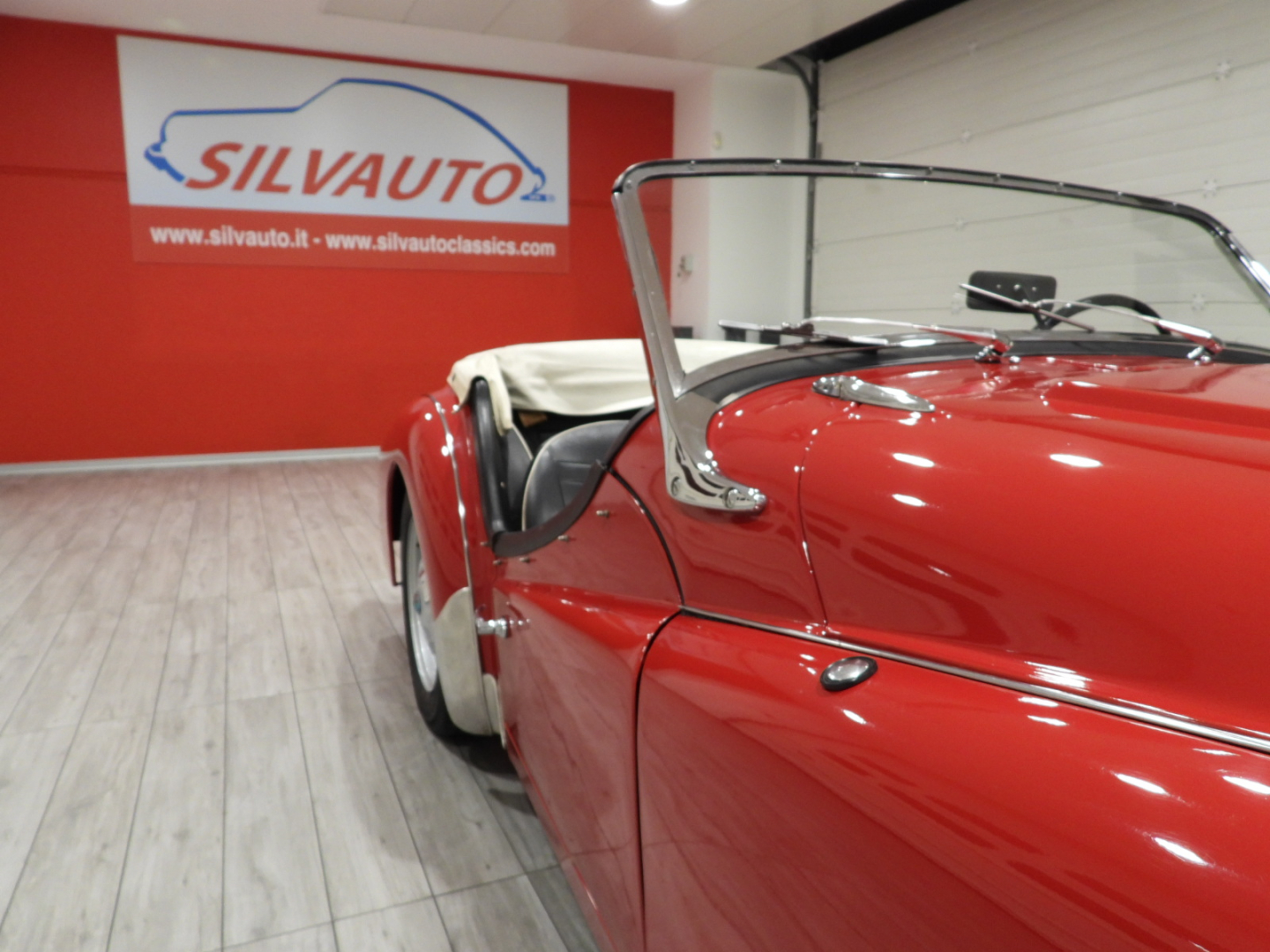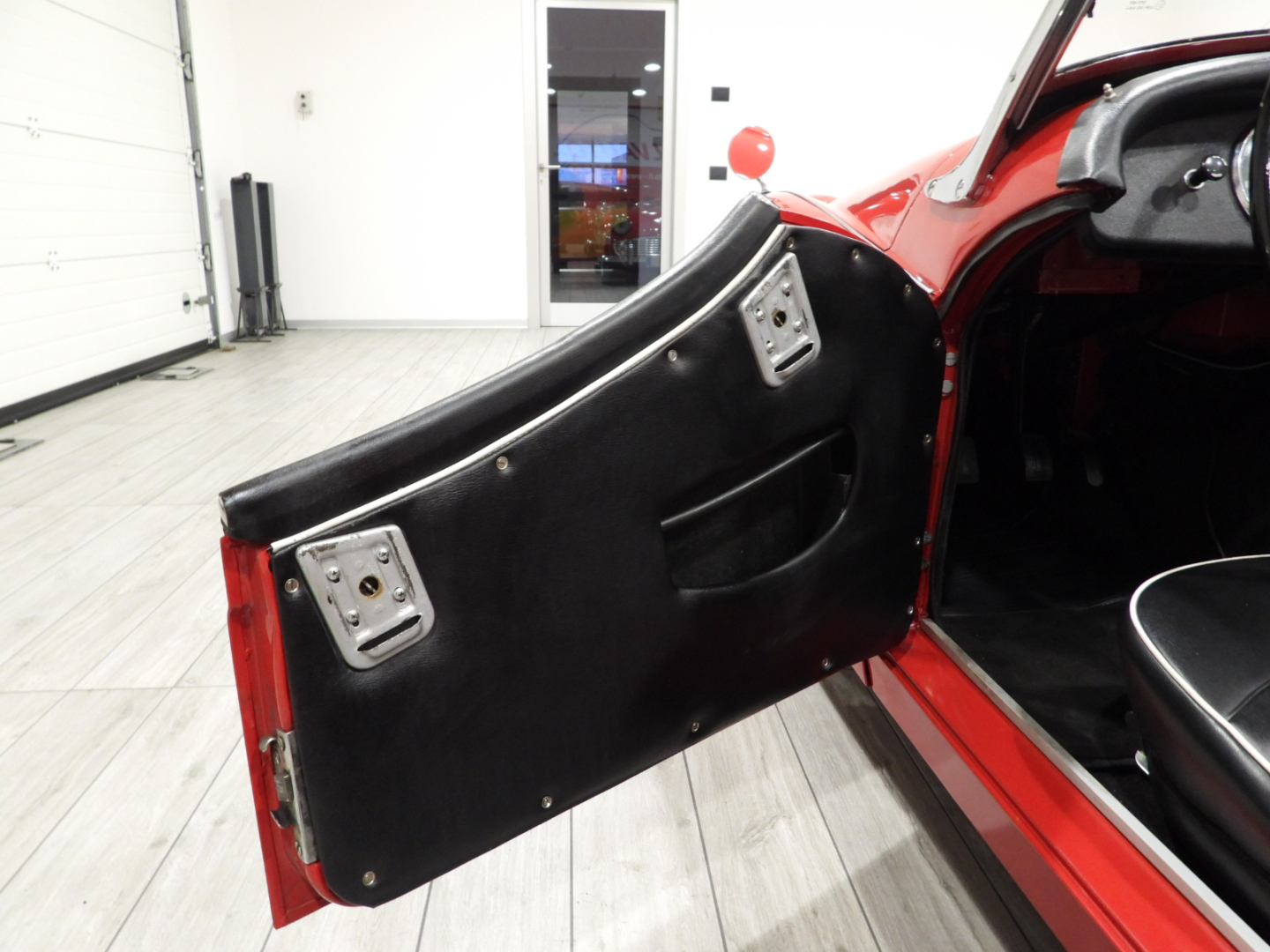 Sedili e pannelli in sky nero con pipeline avorio, Volante a tre razze originale, Pomello del cambio in legno, Autoradio AM originale dell’epoca, Doppio specchio esterno cromato ai parafanghi anteriori, Portapacchi posteriore cromato, Cerchi in ferro con calotta cromata Triumph, Capotte in Pvc avorio, Copri capotte in pvc avorio, Voletti asportabili