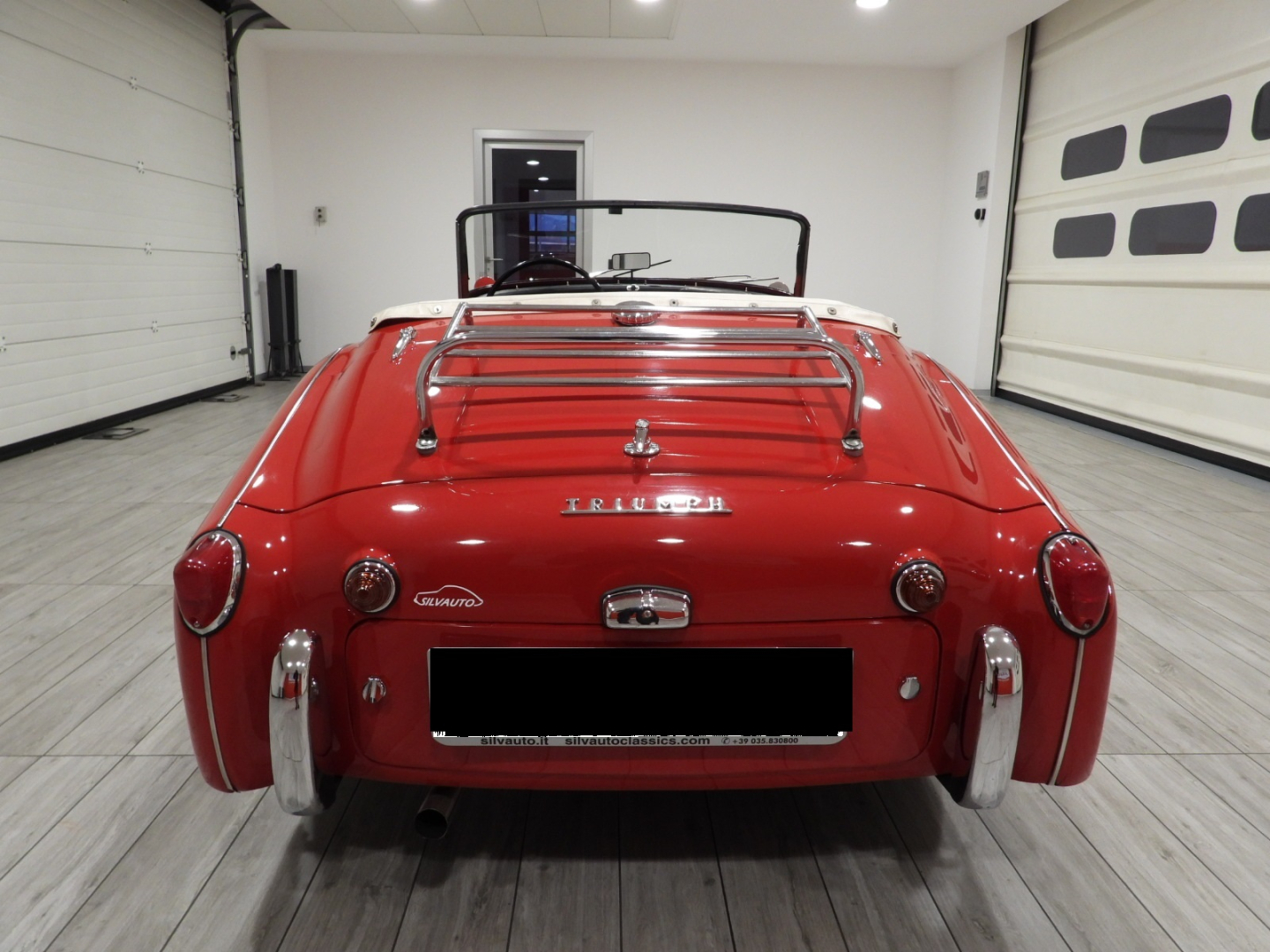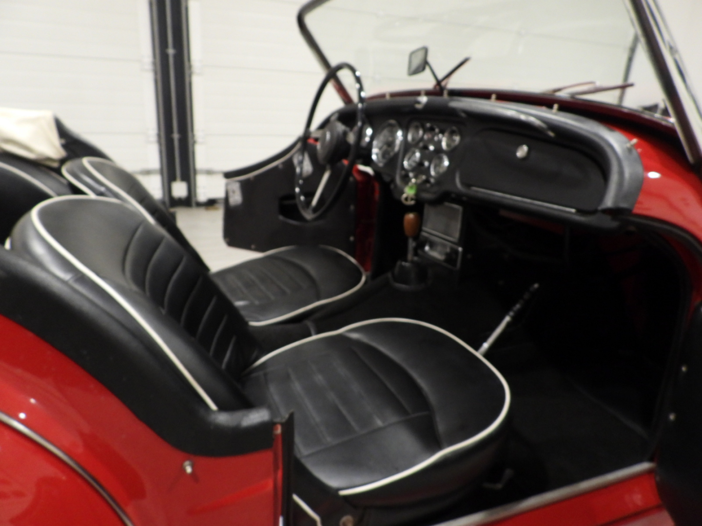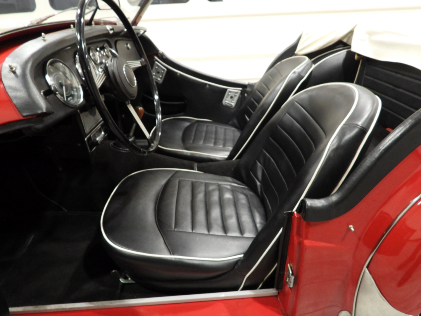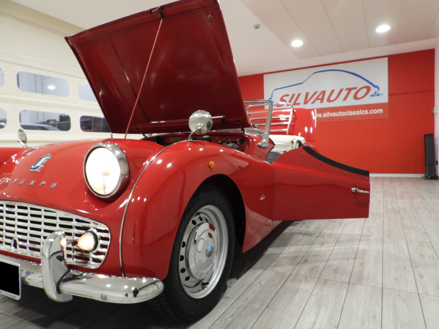 Sedili e pannelli in sky nero con pipeline avorio, Volante a tre razze originale, Pomello del cambio in legno, Autoradio AM originale dell’epoca, Doppio specchio esterno cromato ai parafanghi anteriori, Portapacchi posteriore cromato, Cerchi in ferro con calotta cromata Triumph, Capotte in Pvc avorio, Copri capotte in pvc avorio, Voletti asportabili