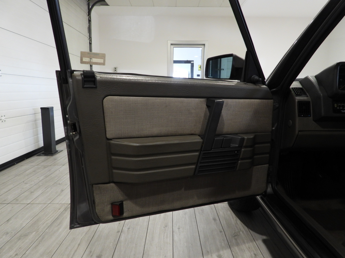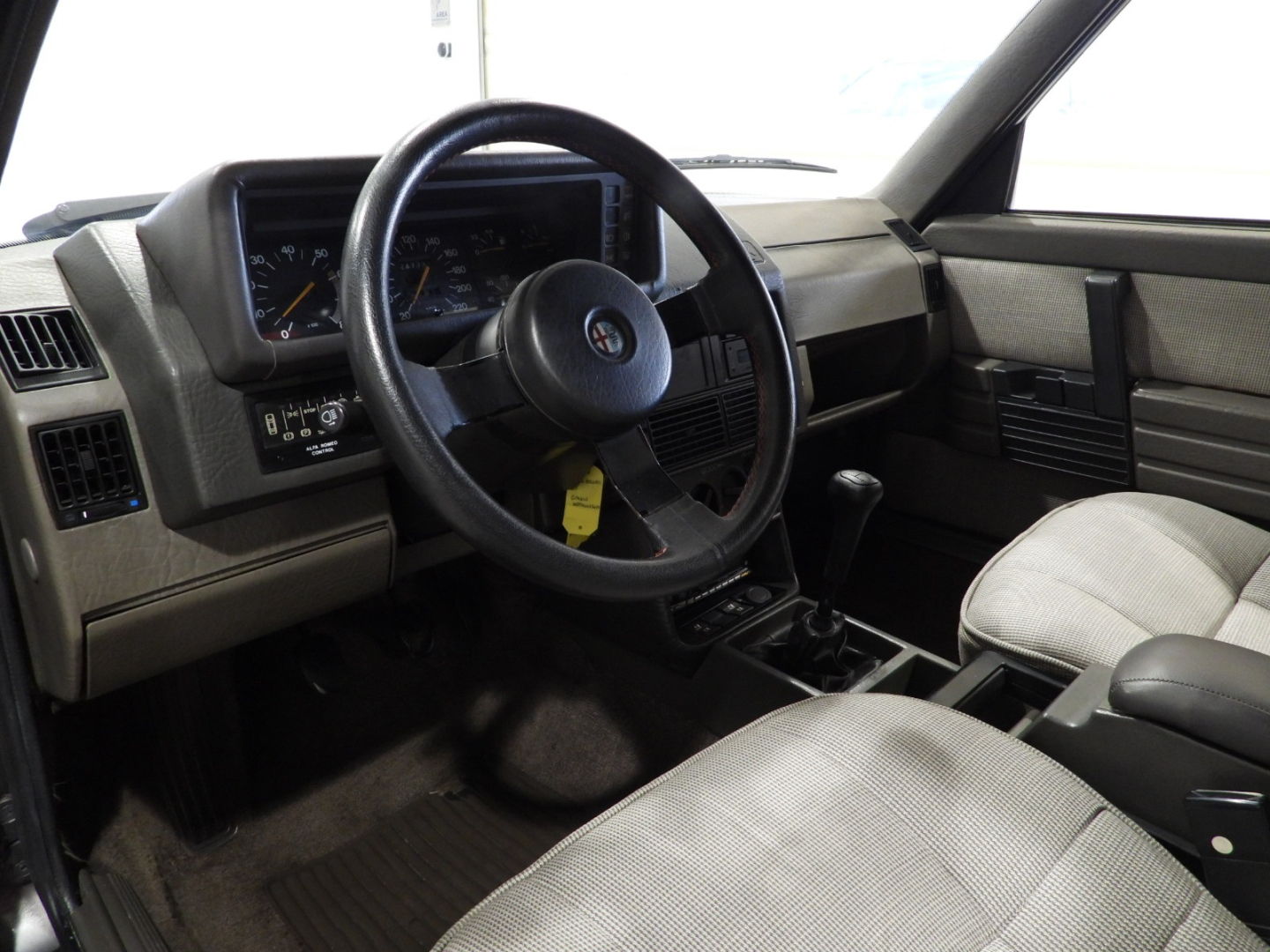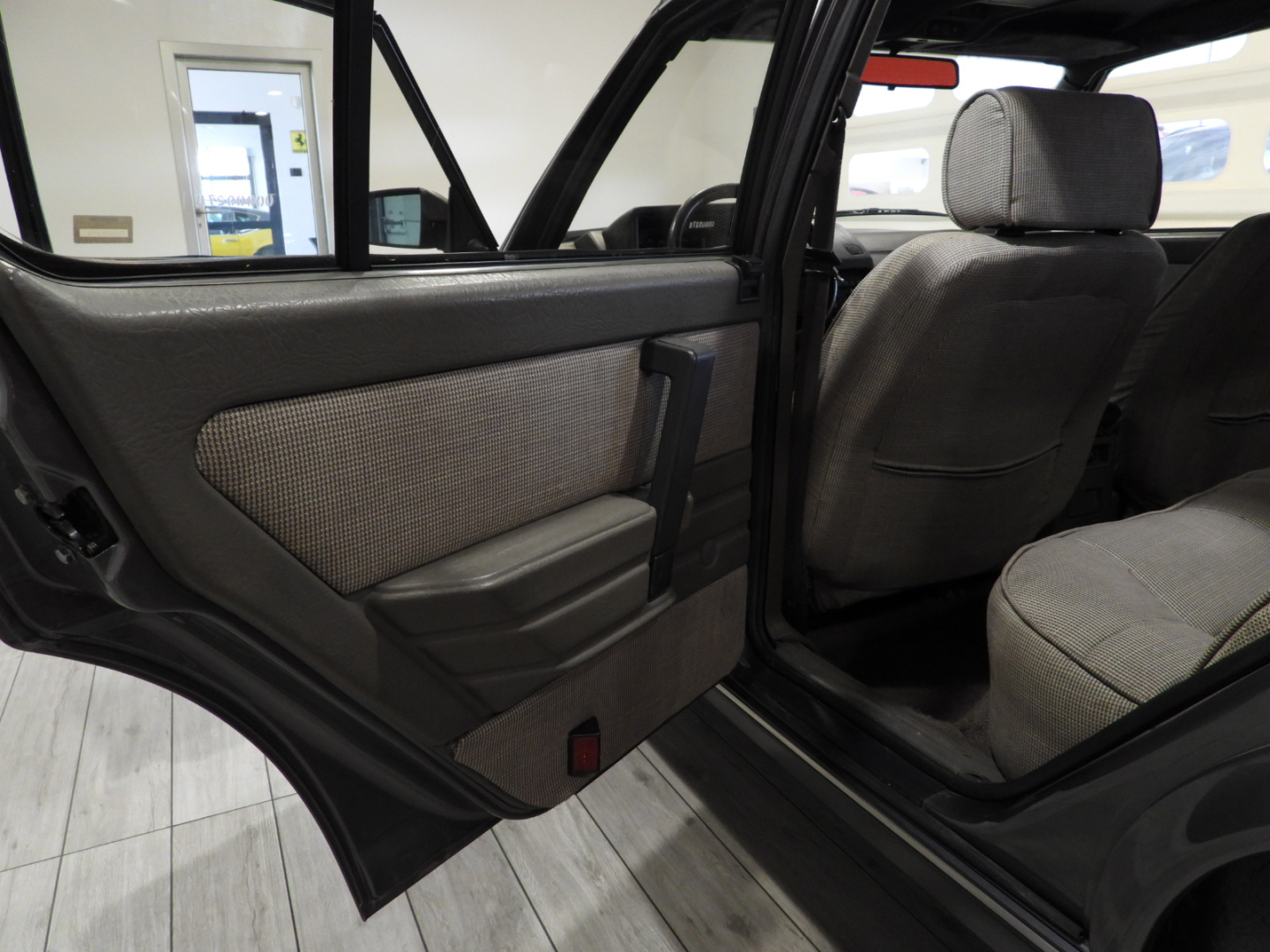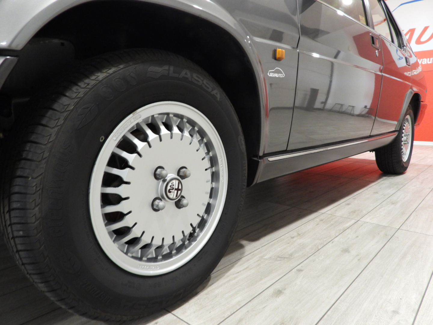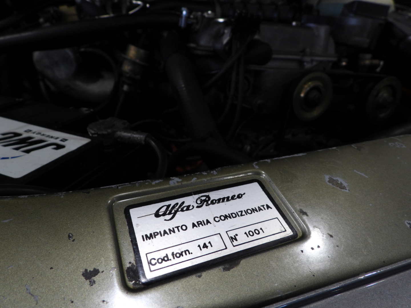 Sièges et panneaux en tissu gris à chevrons, Dossiers avant à réglage électrique, Ceintures de sécurité avant, Accoudoir avant, Vitres électriques avant et arrière, Volant sport à trois branches, Autoradio Alpine avec antenne électrique sur l’aile arrière gauche, Climatisation d’époque d’origine, Accoudoir arrière, Store pare-soleil arrière, Rétroviseur extérieur côté conducteur d’origine à réglage manuel, Éclairage de courtoisie intérieur, Feux de brouillard rectangulaires à lumière blanche, Jantes alliage Alfa Romeo 5 1/2 Jx14 H2/45 avec pneus 185/70 R14, Antivol IDENTICAR avec marquage sur vitre