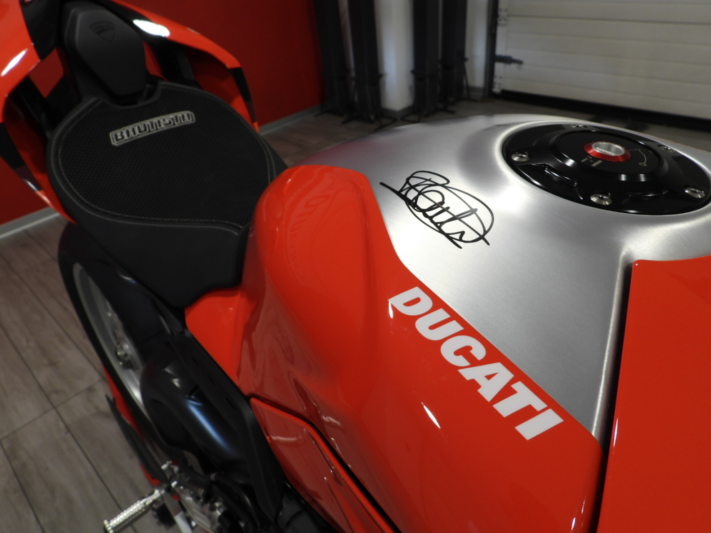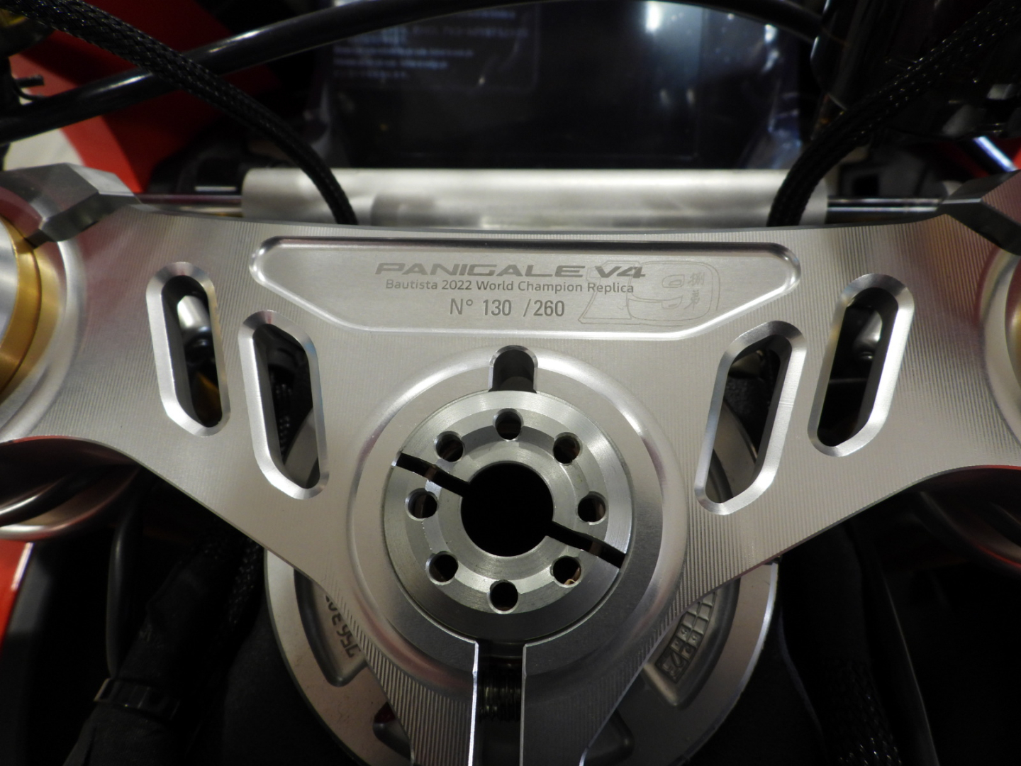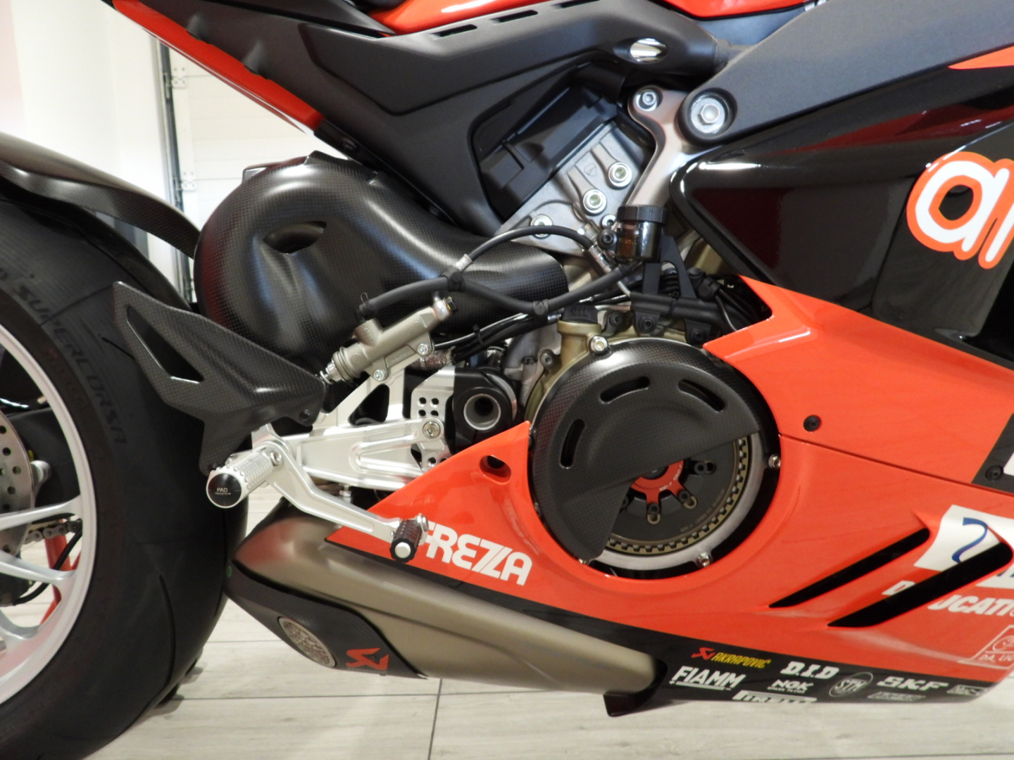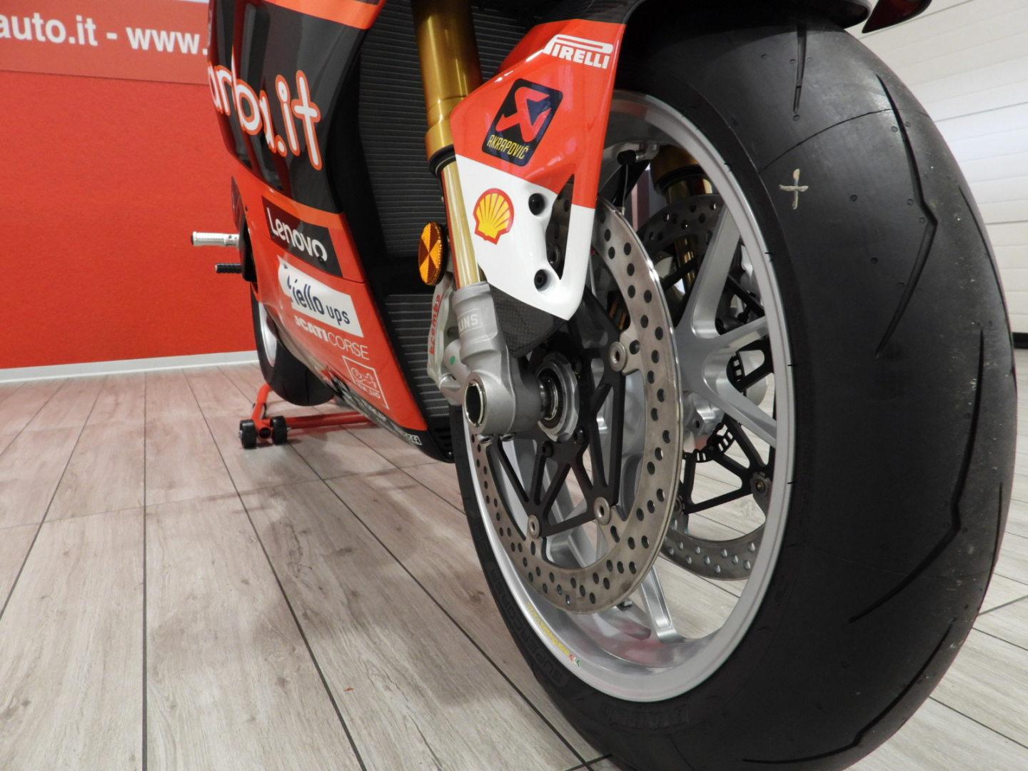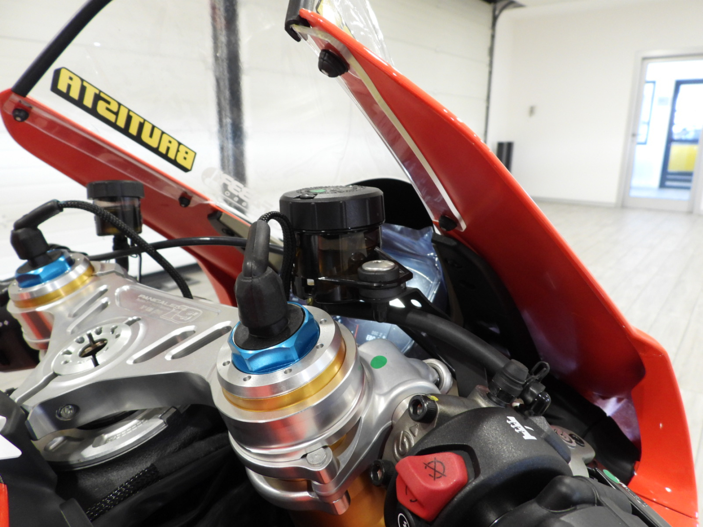 Tête de direction en aluminium usiné avec nom et numéro progressif de la moto, Réservoir de carburant en aluminium brossé (livrée de course Bautista #19 uniquement), Réservoir dédicacé à l’origine par Alvaro Bautista (#19), Plexiglas de course, Silencieux homologué Akrapovič, Bouclier thermique en fibre de carbone pour collecteurs d’échappement arrière, embrayage à sec STM-EVO SBK 9 disques, repose-pieds pilote réglables Rizoma en aluminium billette avec protège-talons en fibre de carbone, étriers Brembo Stylema R, pompe Brembo MCS avec réglage à distance, leviers de frein et embrayage usinés, avant et arrière en fibre de carbone garde-boue, Conduits d’air de refroidissement du frein avant en fibre de carbone, Cache-bras oscillant en fibre de carbone et titane, Cache-alternateur en fibre de carbone