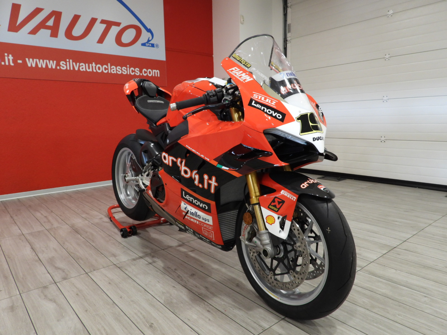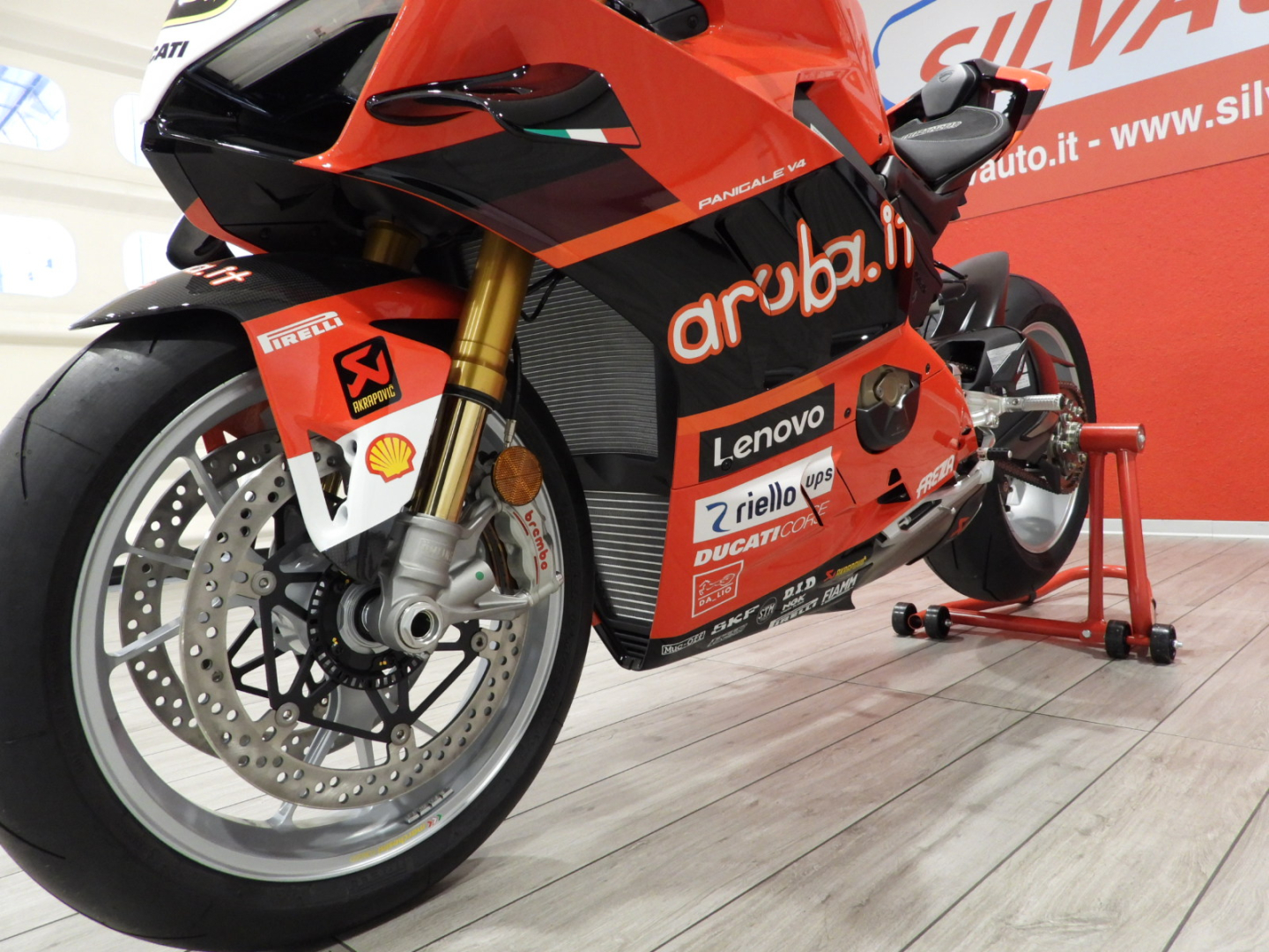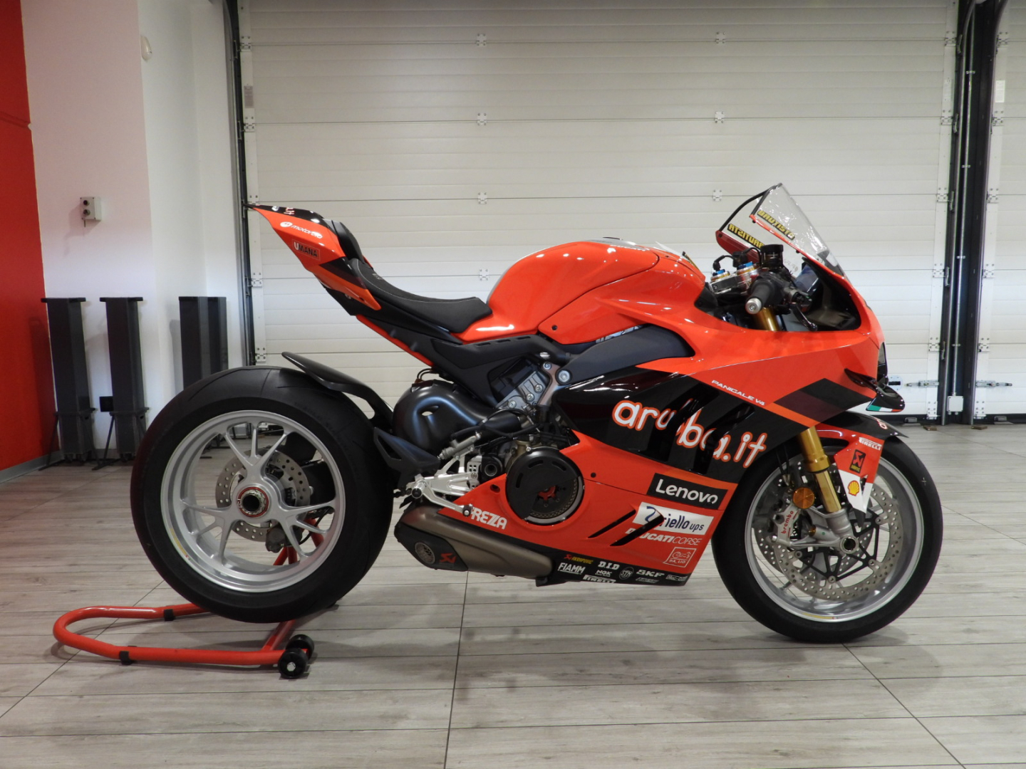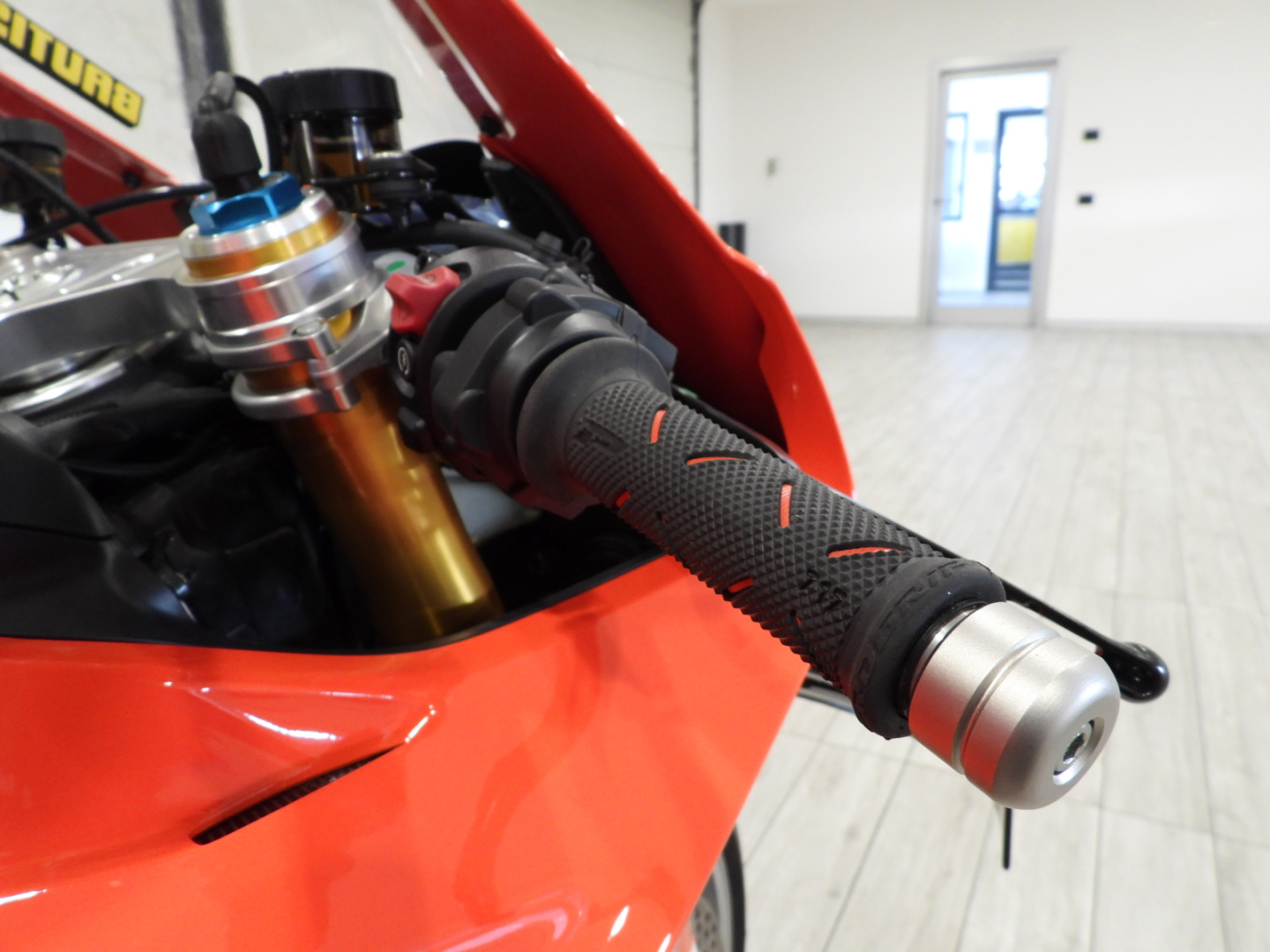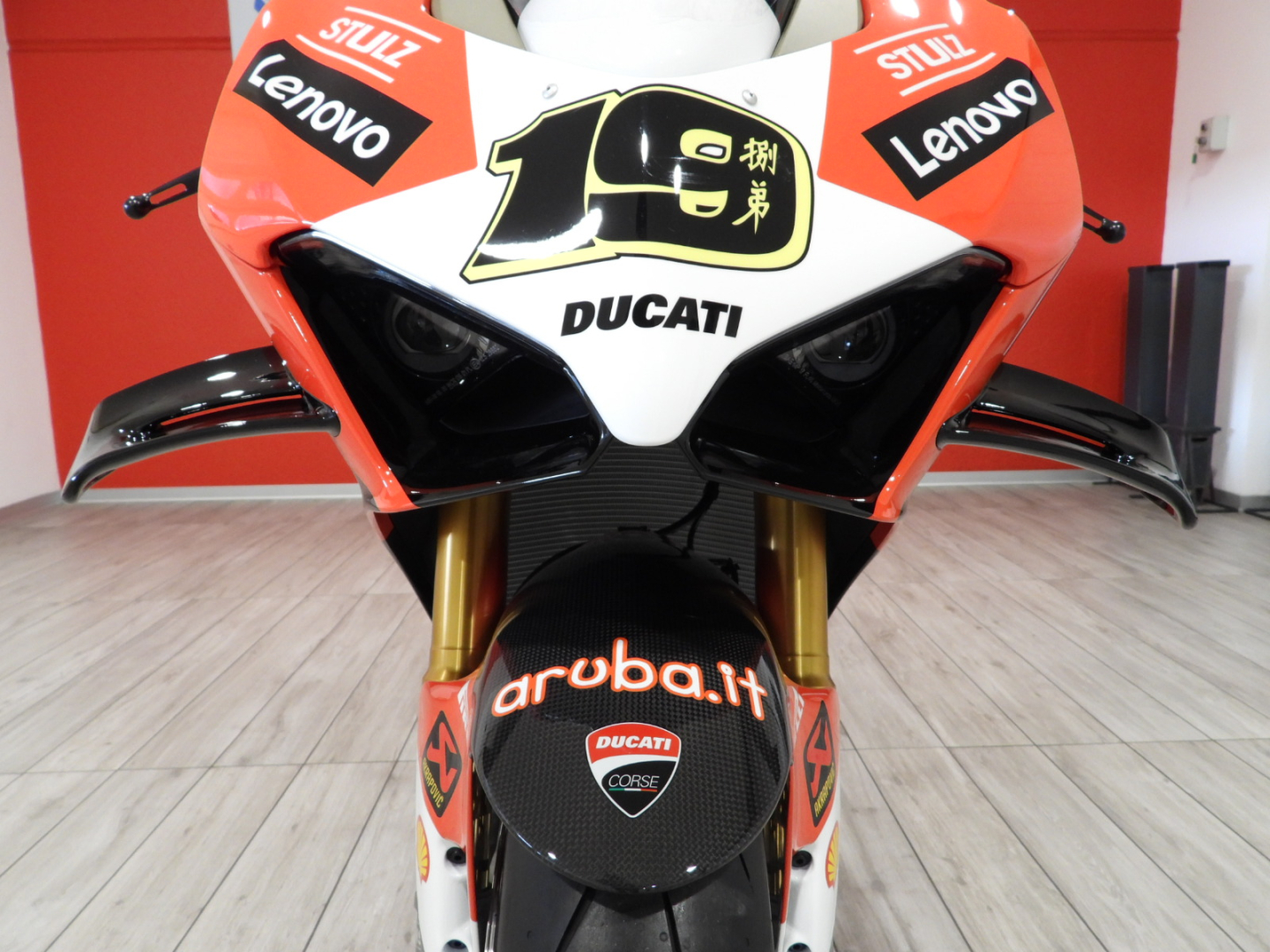 Tête de direction en aluminium usiné avec nom et numéro progressif de la moto, Réservoir de carburant en aluminium brossé (livrée de course Bautista #19 uniquement), Réservoir dédicacé à l’origine par Alvaro Bautista (#19), Plexiglas de course, Silencieux homologué Akrapovič, Bouclier thermique en fibre de carbone pour collecteurs d’échappement arrière, embrayage à sec STM-EVO SBK 9 disques, repose-pieds pilote réglables Rizoma en aluminium billette avec protège-talons en fibre de carbone, étriers Brembo Stylema R, pompe Brembo MCS avec réglage à distance, leviers de frein et embrayage usinés, avant et arrière en fibre de carbone garde-boue, Conduits d’air de refroidissement du frein avant en fibre de carbone, Cache-bras oscillant en fibre de carbone et titane, Cache-alternateur en fibre de carbone