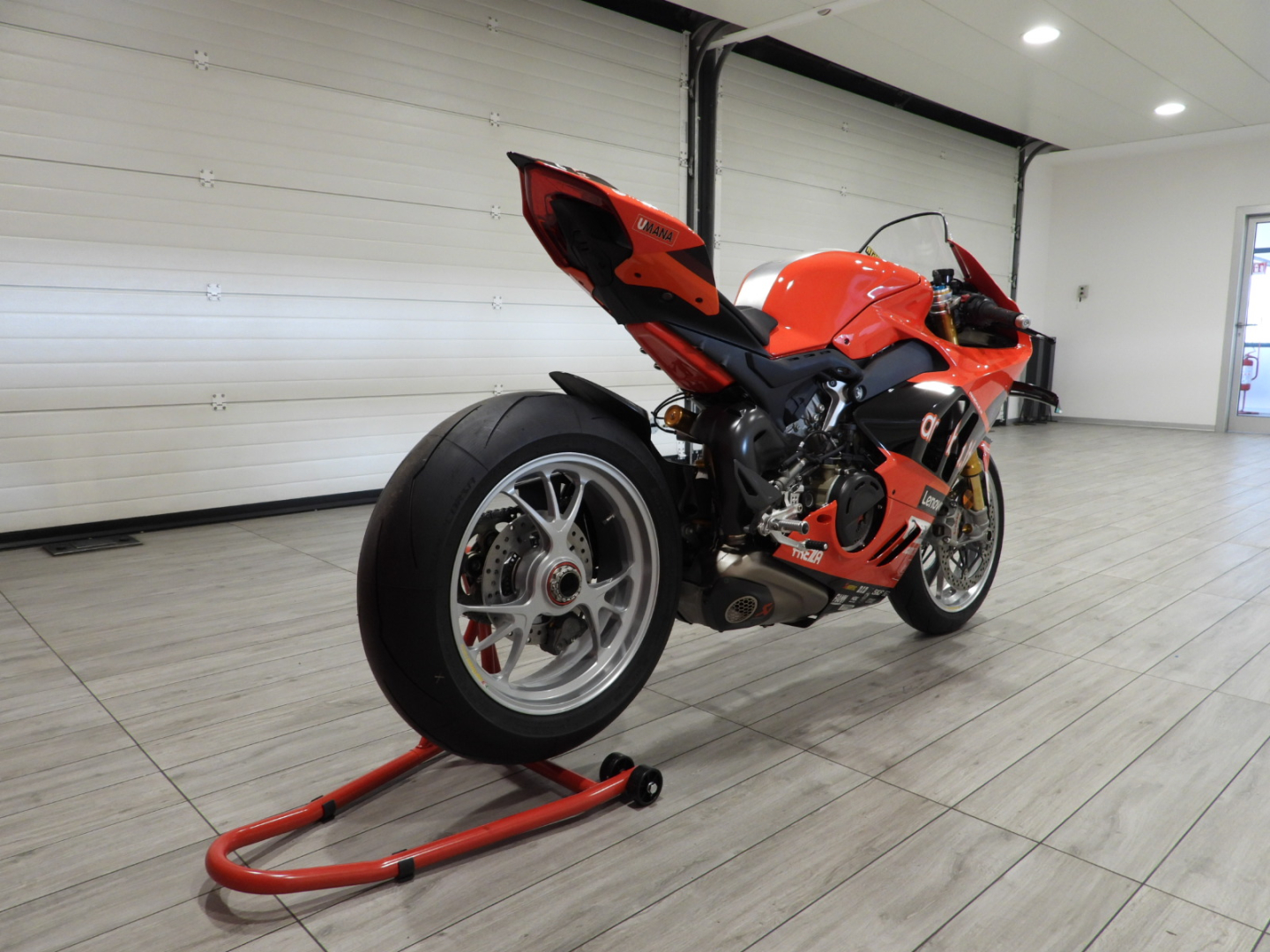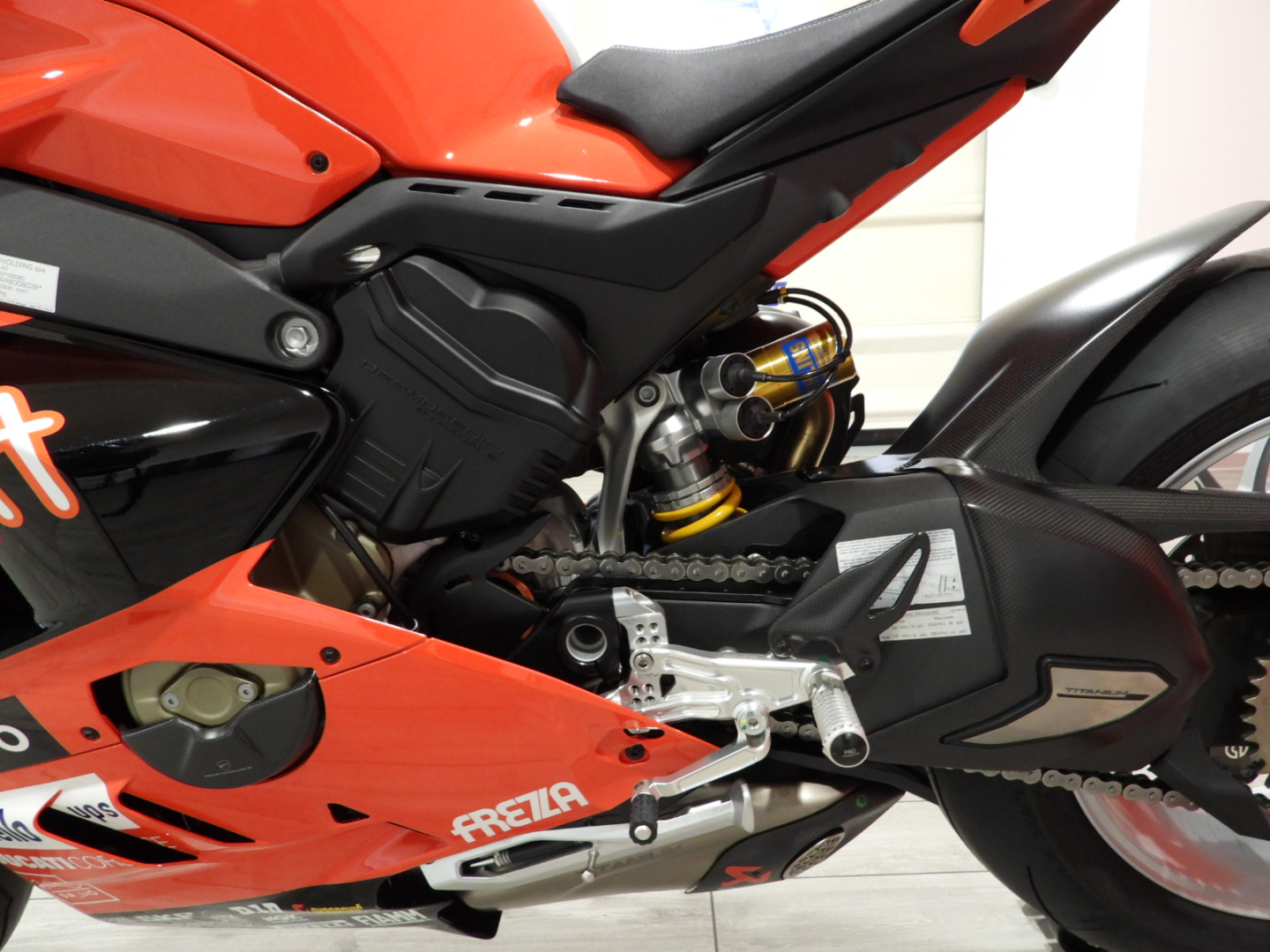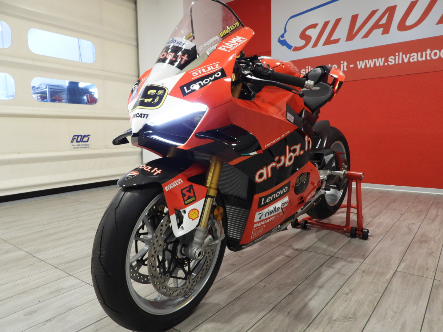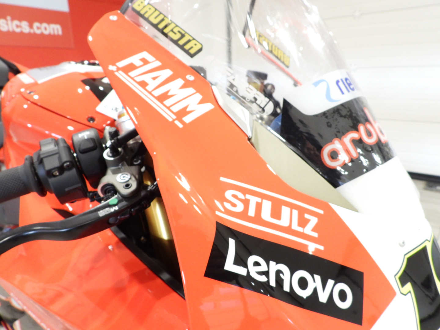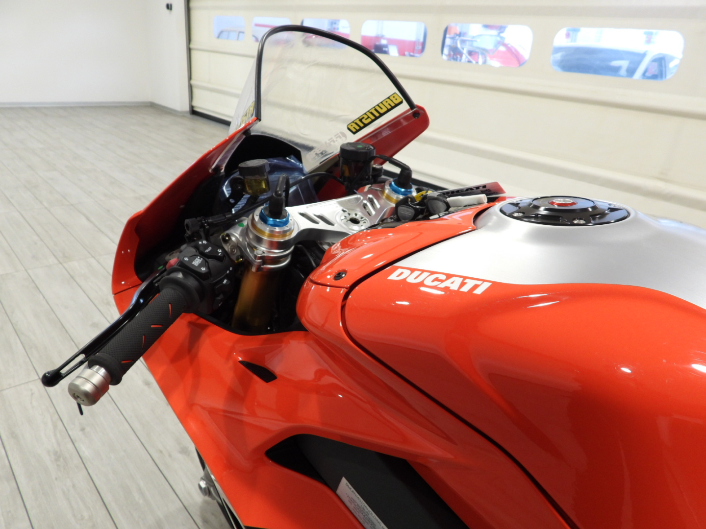 Tête de direction en aluminium usiné avec nom et numéro progressif de la moto, Réservoir de carburant en aluminium brossé (livrée de course Bautista #19 uniquement), Réservoir dédicacé à l’origine par Alvaro Bautista (#19), Plexiglas de course, Silencieux homologué Akrapovič, Bouclier thermique en fibre de carbone pour collecteurs d’échappement arrière, embrayage à sec STM-EVO SBK 9 disques, repose-pieds pilote réglables Rizoma en aluminium billette avec protège-talons en fibre de carbone, étriers Brembo Stylema R, pompe Brembo MCS avec réglage à distance, leviers de frein et embrayage usinés, avant et arrière en fibre de carbone garde-boue, Conduits d’air de refroidissement du frein avant en fibre de carbone, Cache-bras oscillant en fibre de carbone et titane, Cache-alternateur en fibre de carbone