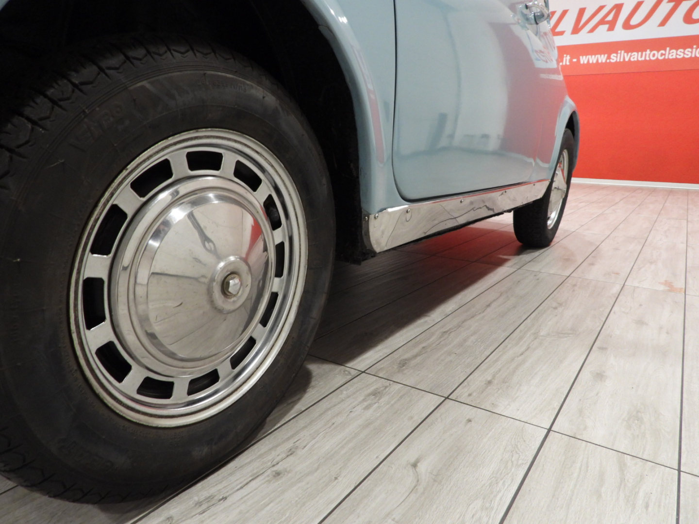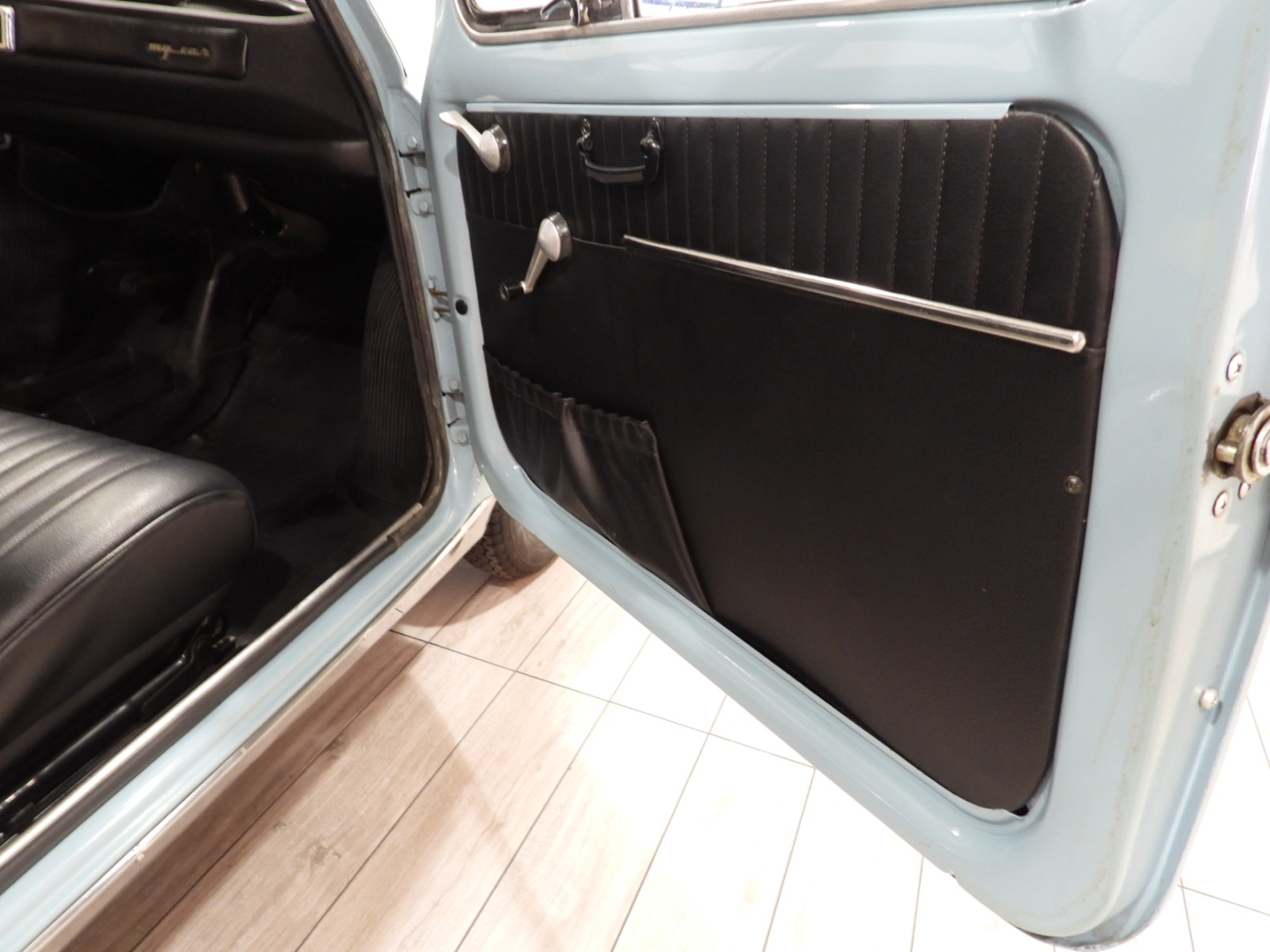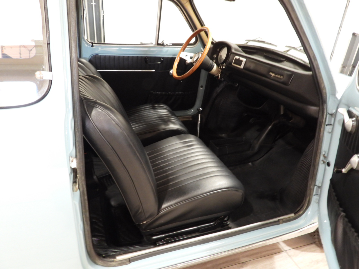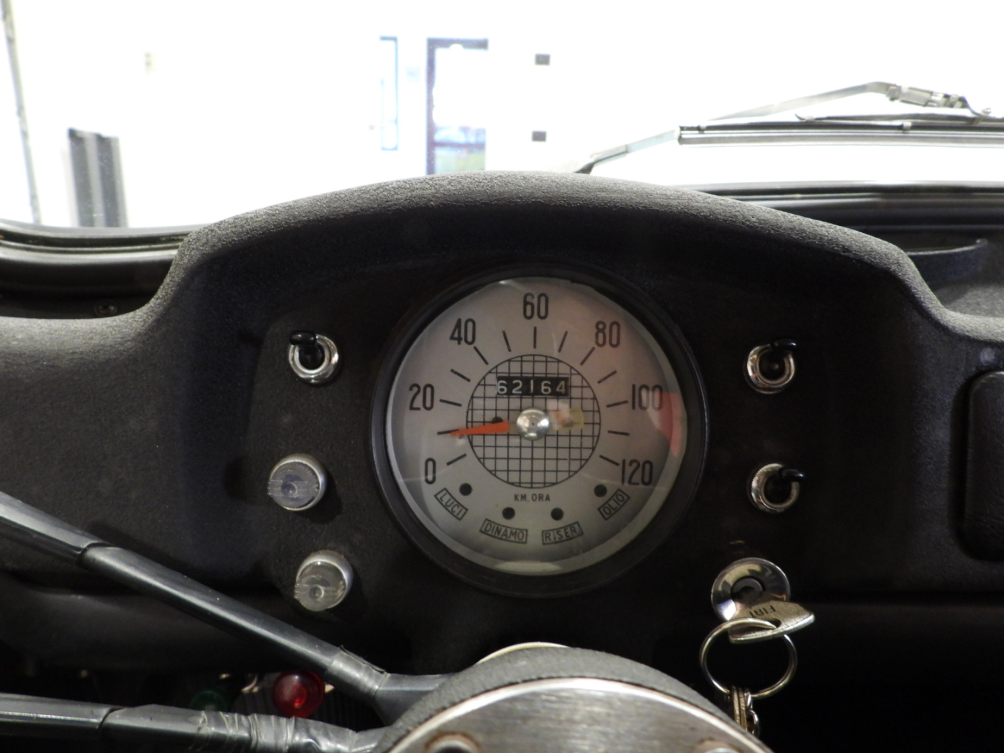CARACTÉRISTIQUES SPÉCIFIQUES AU MODÈLE : Tableau de bord façonné et recouvert de plastique noir, levier de vitesses et poignée de frein à main en acier inoxydable, seuils de porte en acier inoxydable, calandre arrondie avec calandre en zamak chromé et phares encastrés, rampes d’égouttement en acier inoxydable, finitions chromées en les joints du pare-brise avant et de la lunette arrière, les cerclages de roue en acier avec pneus 125 SR 12, la serrure du capot moteur, volant Ferrero avec couronne en bois, vitres arrière qui s’ouvrent comme une boussole, deux nervures longitudinales et un petit becquet (qui créent une image de sportivité et de raffinement)