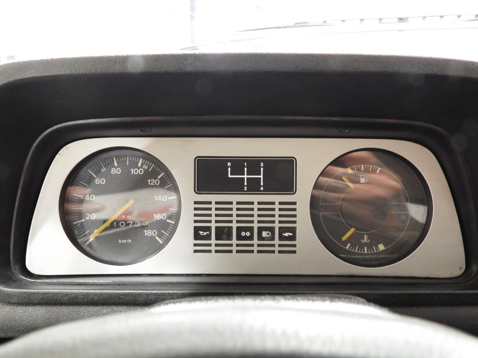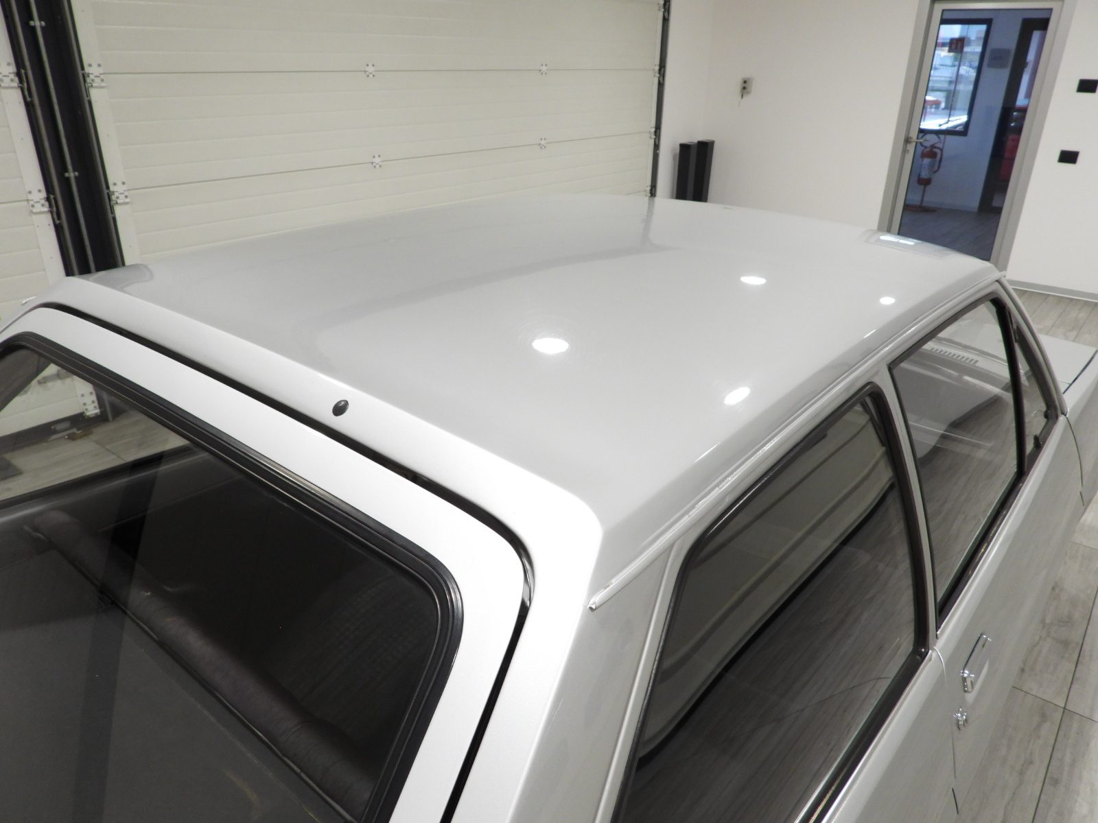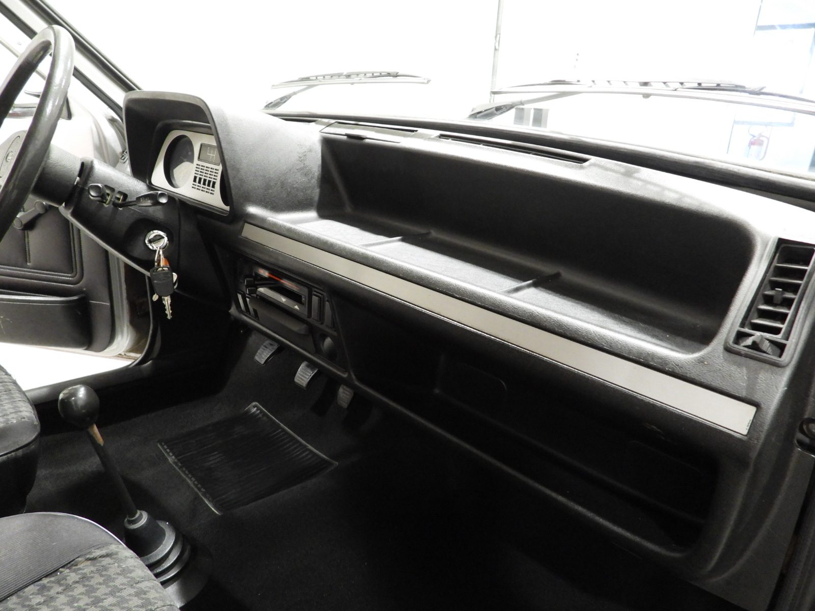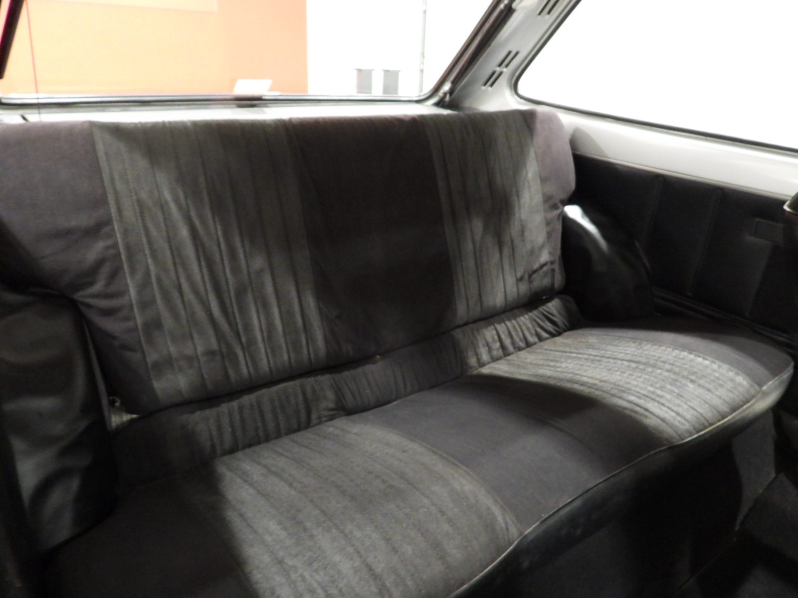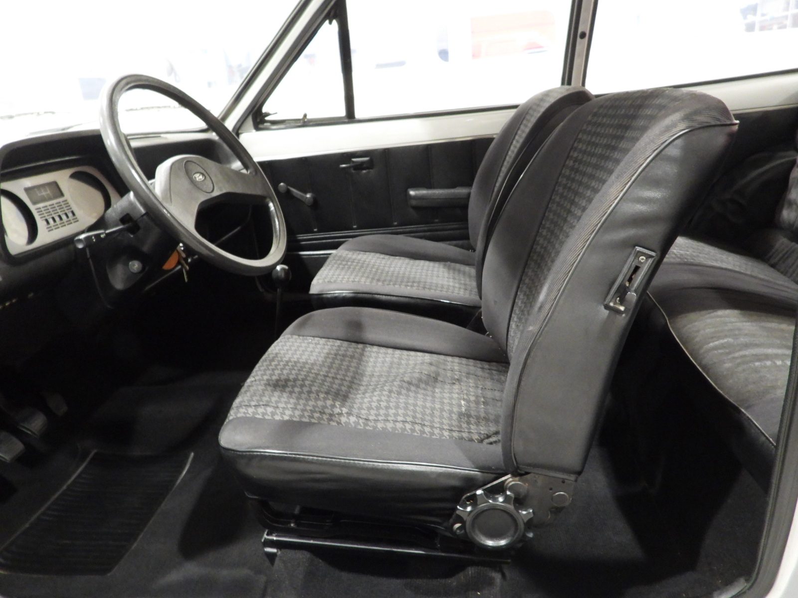 Sièges en tissu gris et noir et panneaux en velours côtelé et ciel noir, Moquette en laine noire au sol, Volant d’origine à deux branches, Rétroviseur extérieur côté conducteur chromé à réglage manuel interne…
