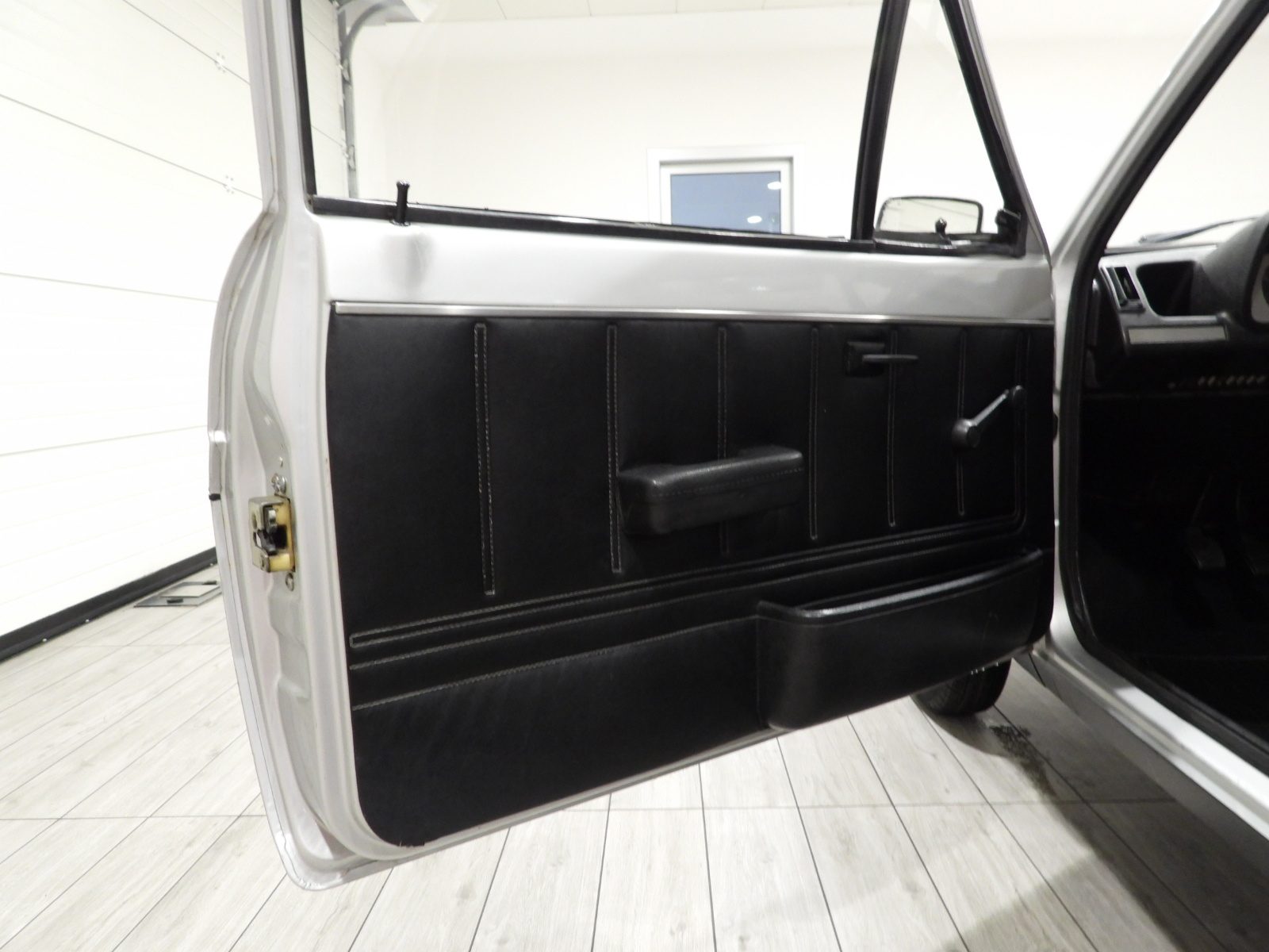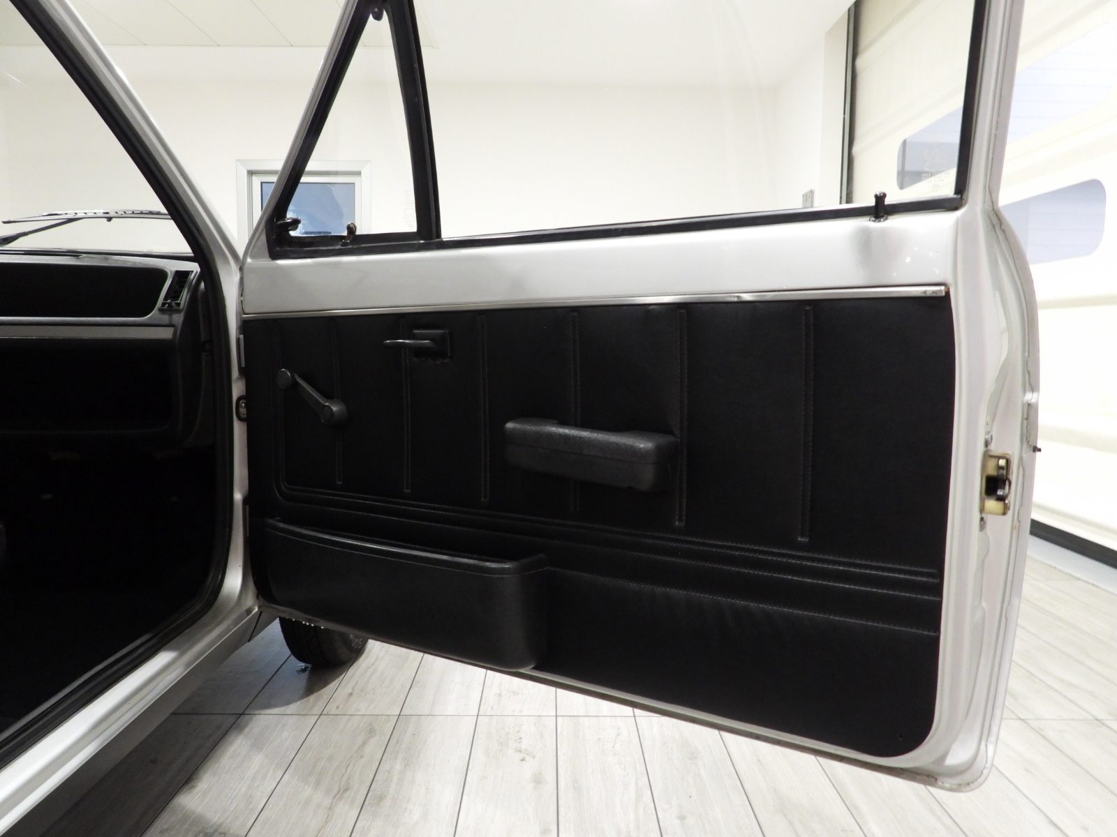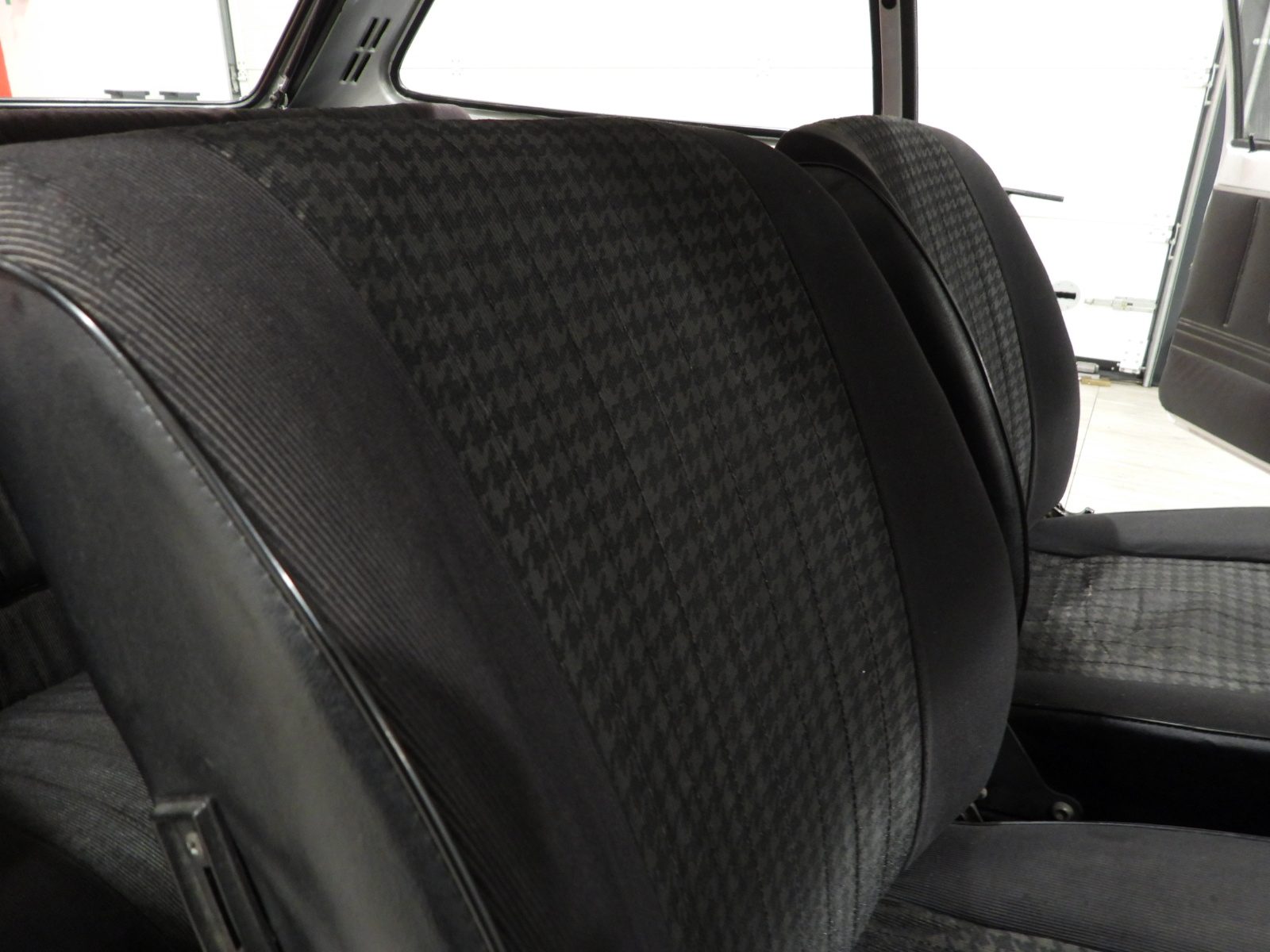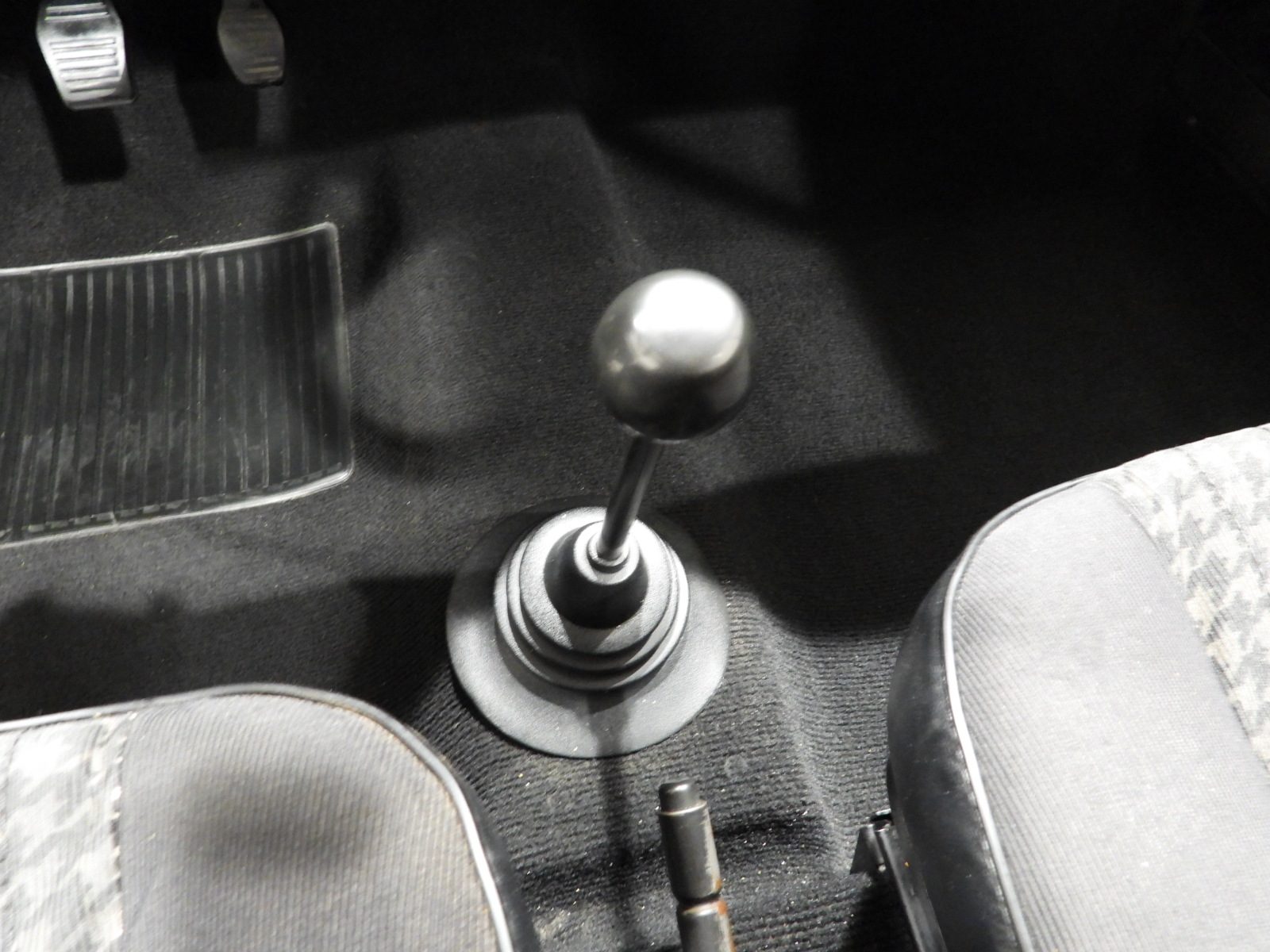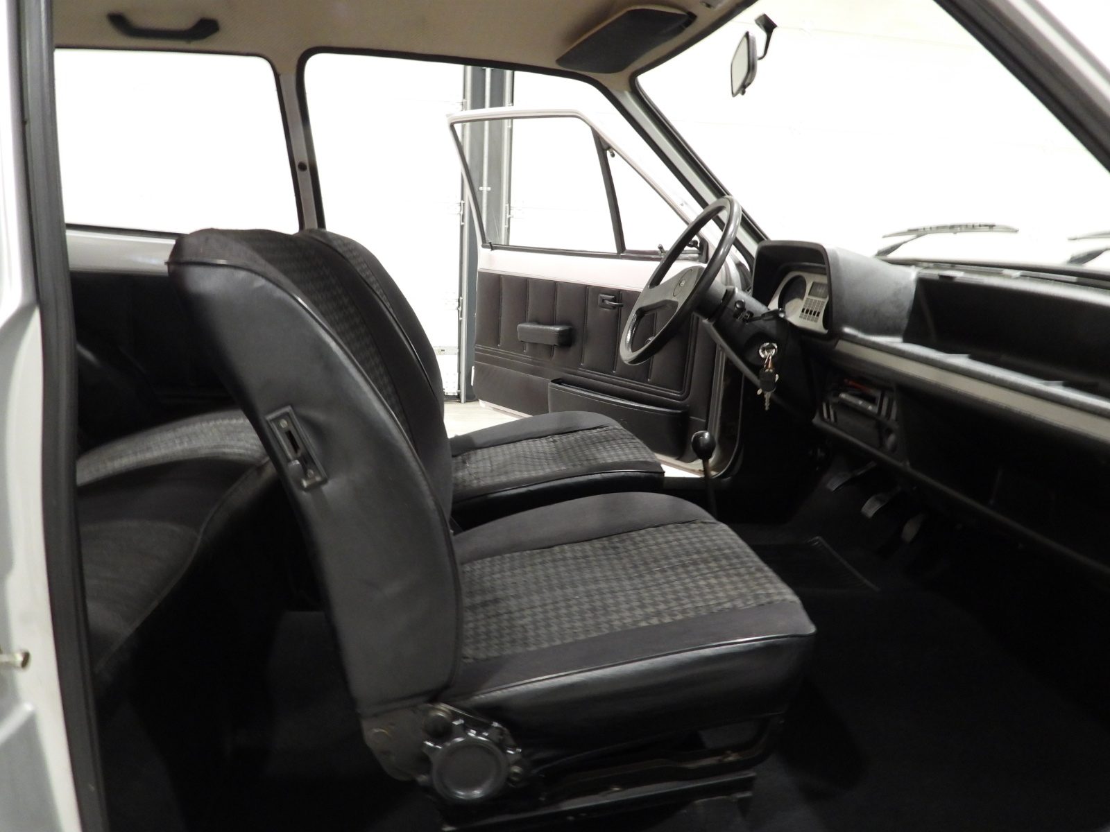 Sièges en tissu gris et noir et panneaux en velours côtelé et ciel noir, Moquette en laine noire au sol, Volant d’origine à deux branches, Rétroviseur extérieur côté conducteur chromé avec réglage manuel interne