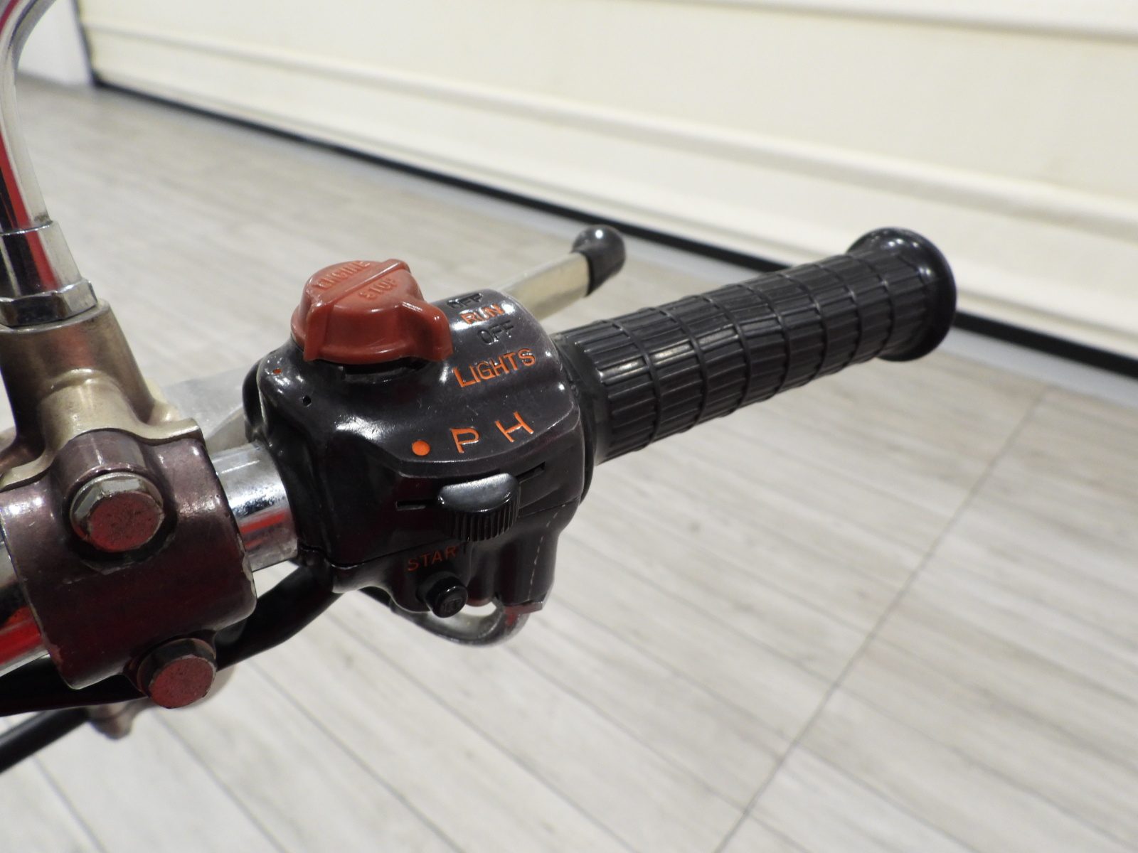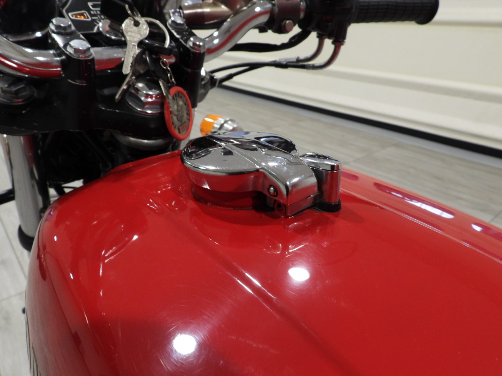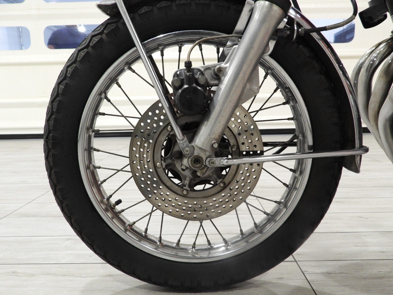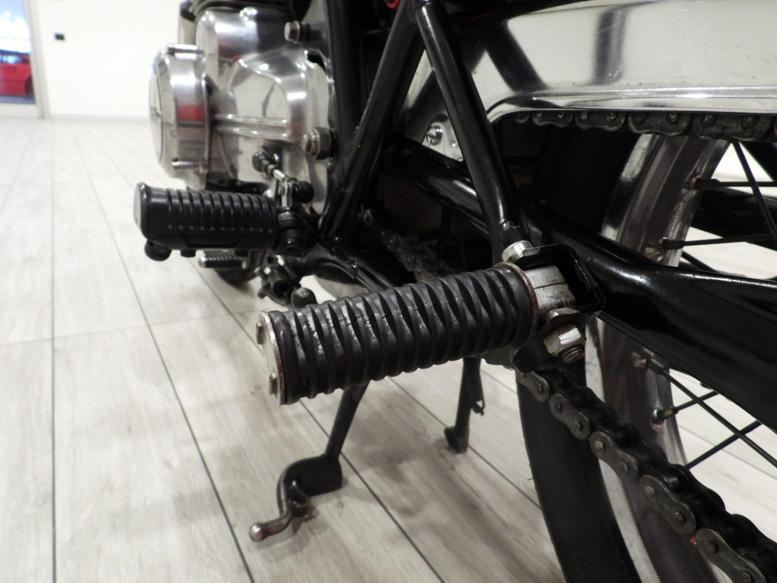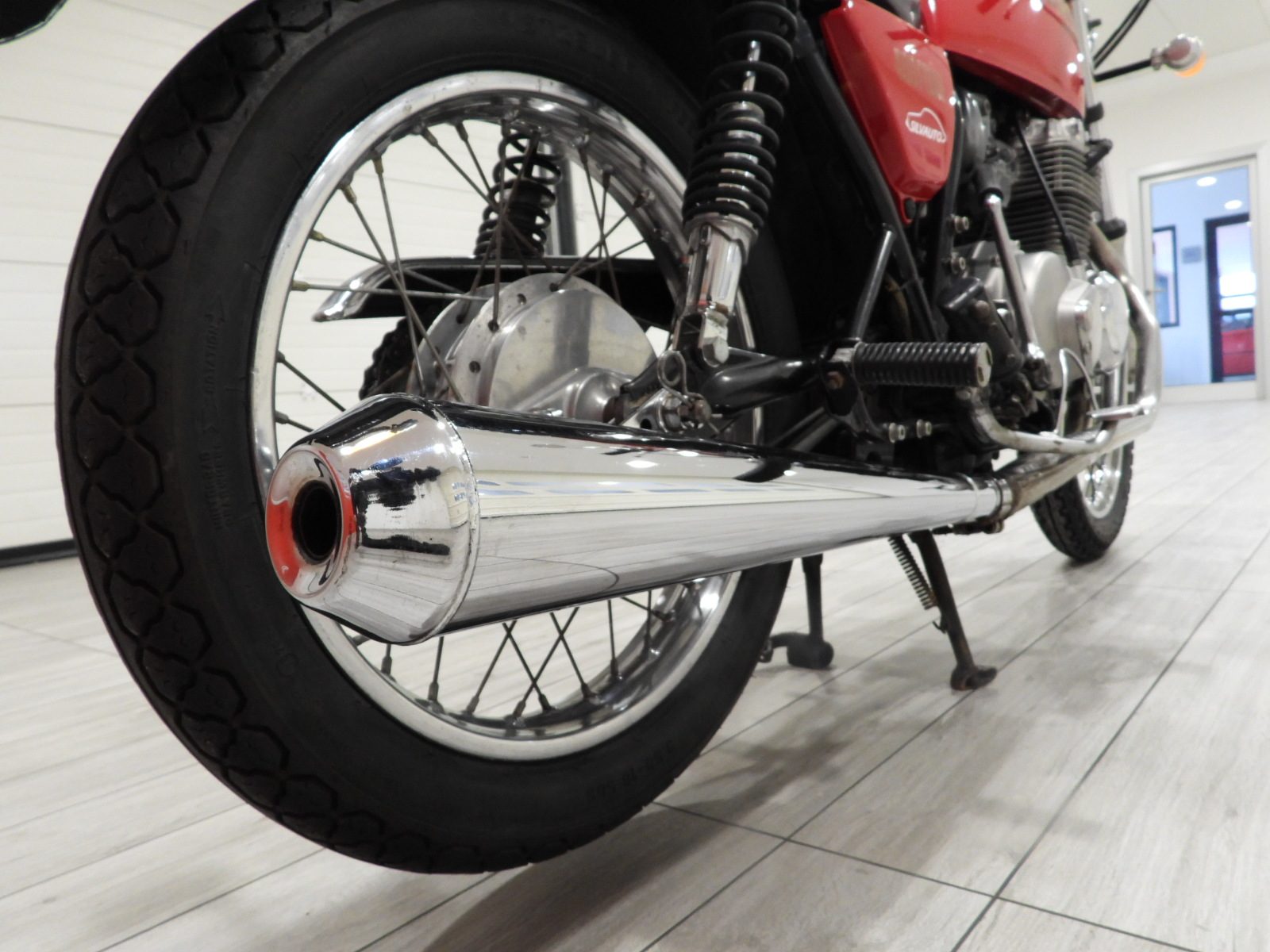 Siège en cuir noir, double rétroviseur chromé, roues à rayons chromées, ailes chromées