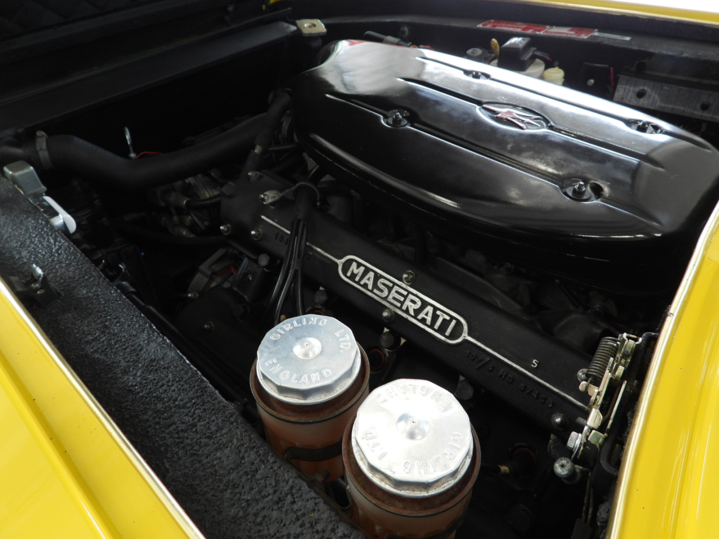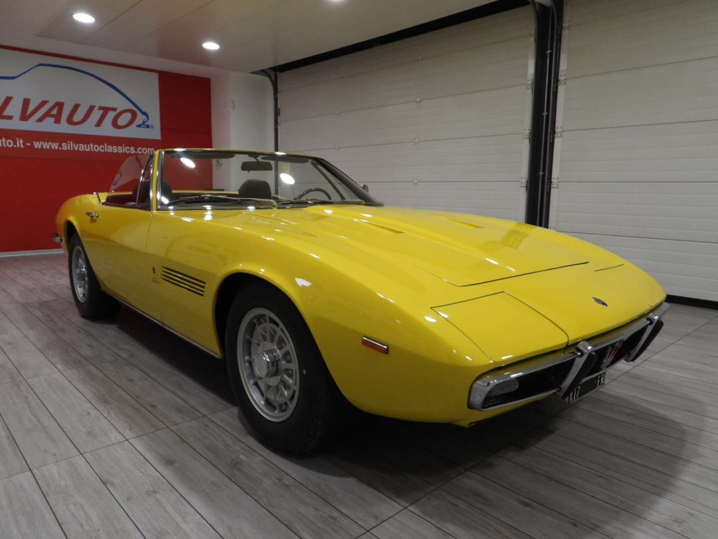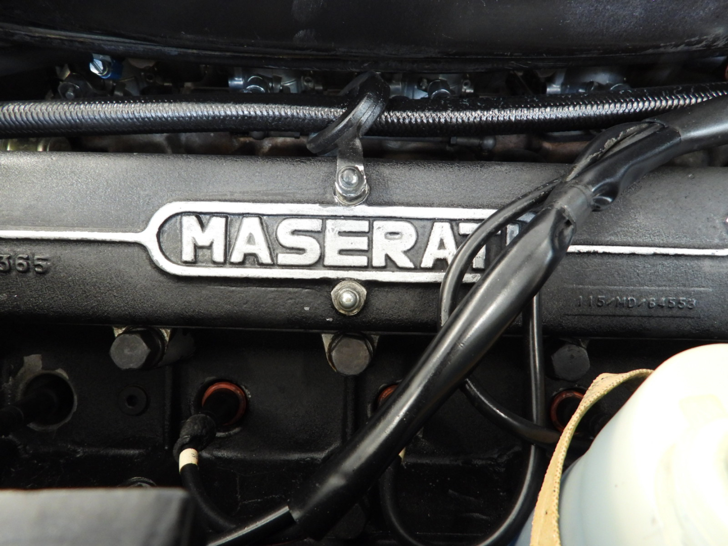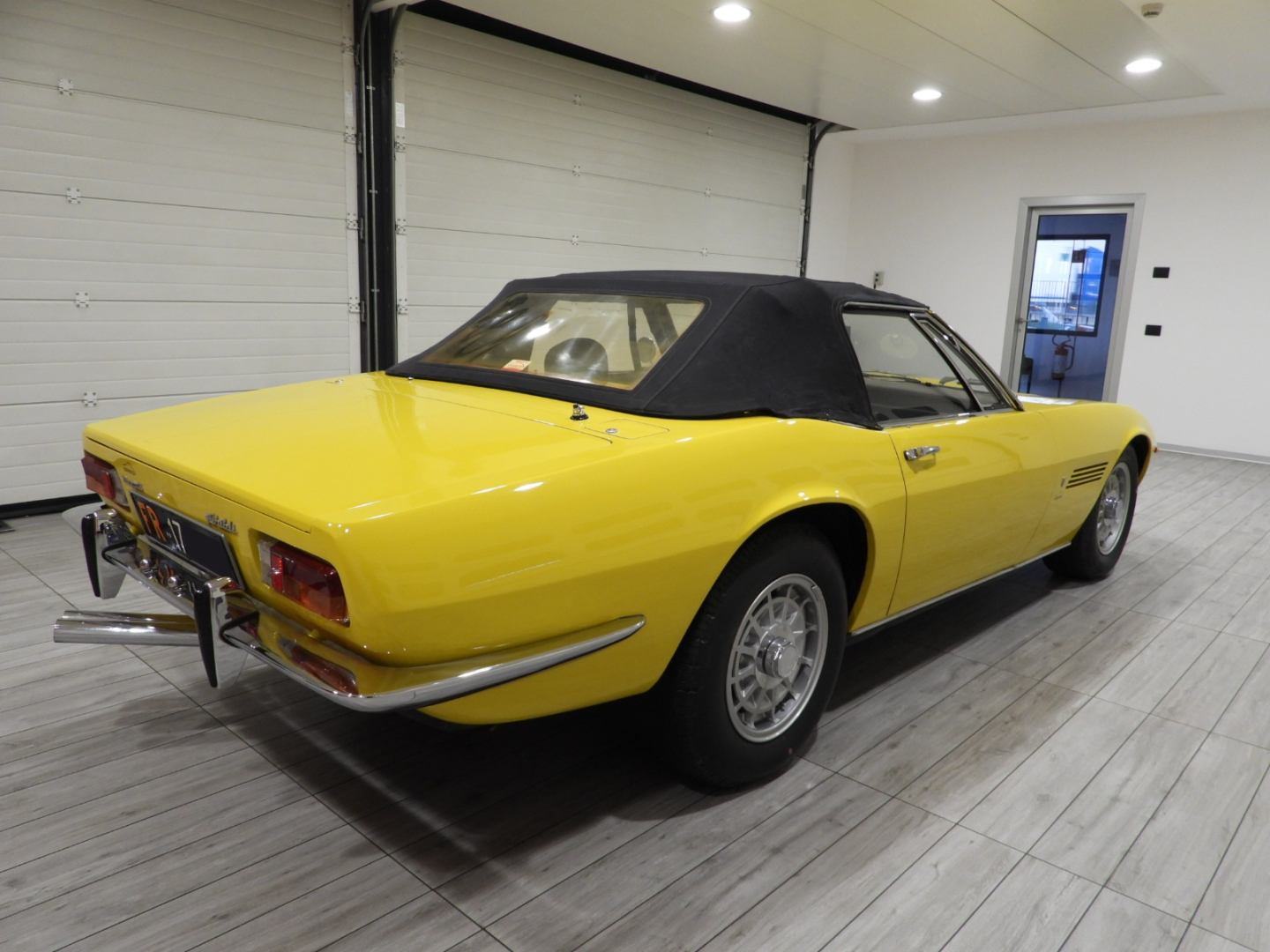 Sièges et panneaux en cuir Connoly noir intégral, volant Maserati à trois branches avec couronne en bois, vitres électriques, 5 jantes en alliage avec écrou à oreilles chromé avec pneus Pirelli GR70VR15, rétroviseur extérieur chromé côté conducteur, capotes en toile noire, toit rigide couleur carrosserie