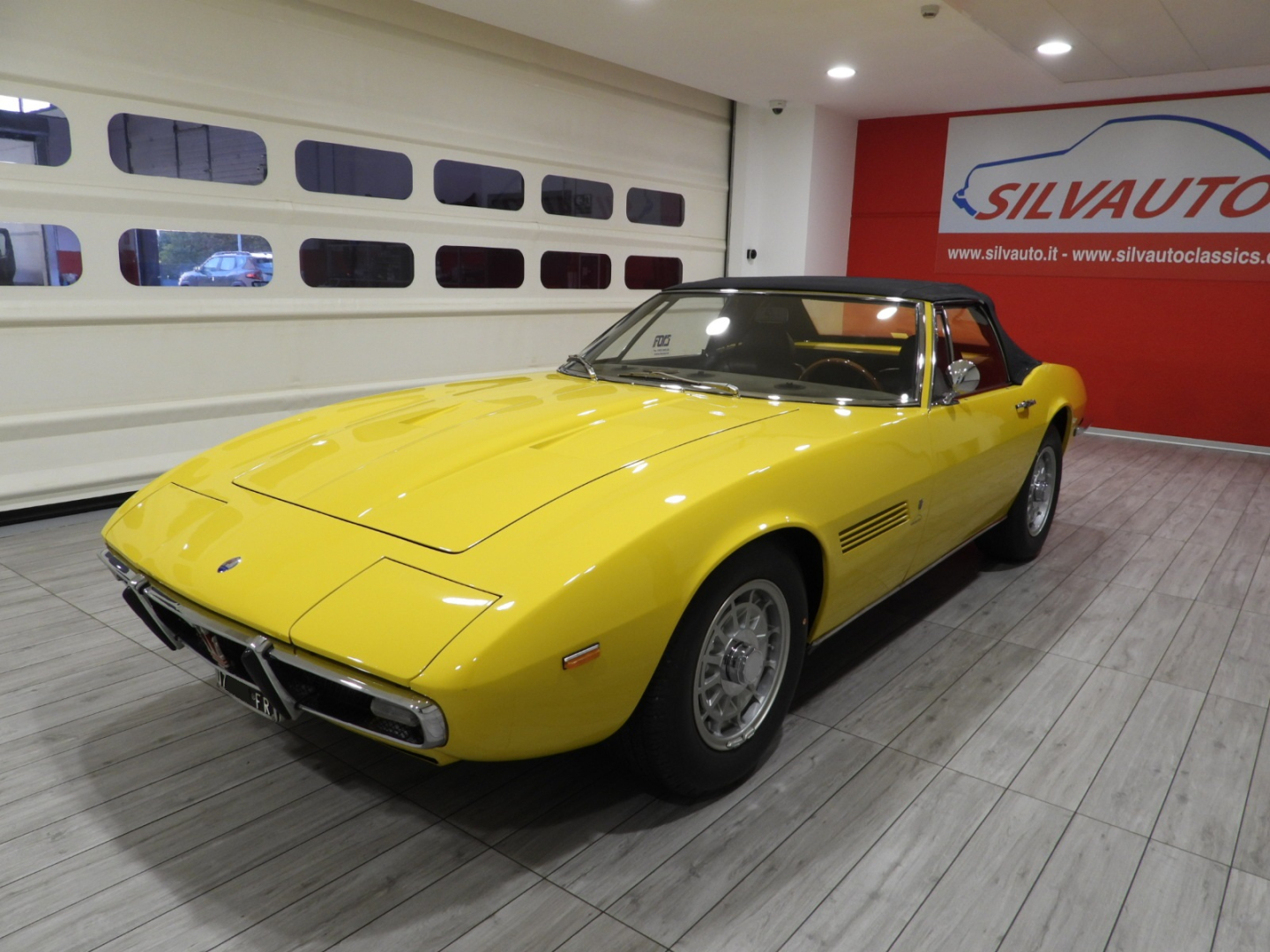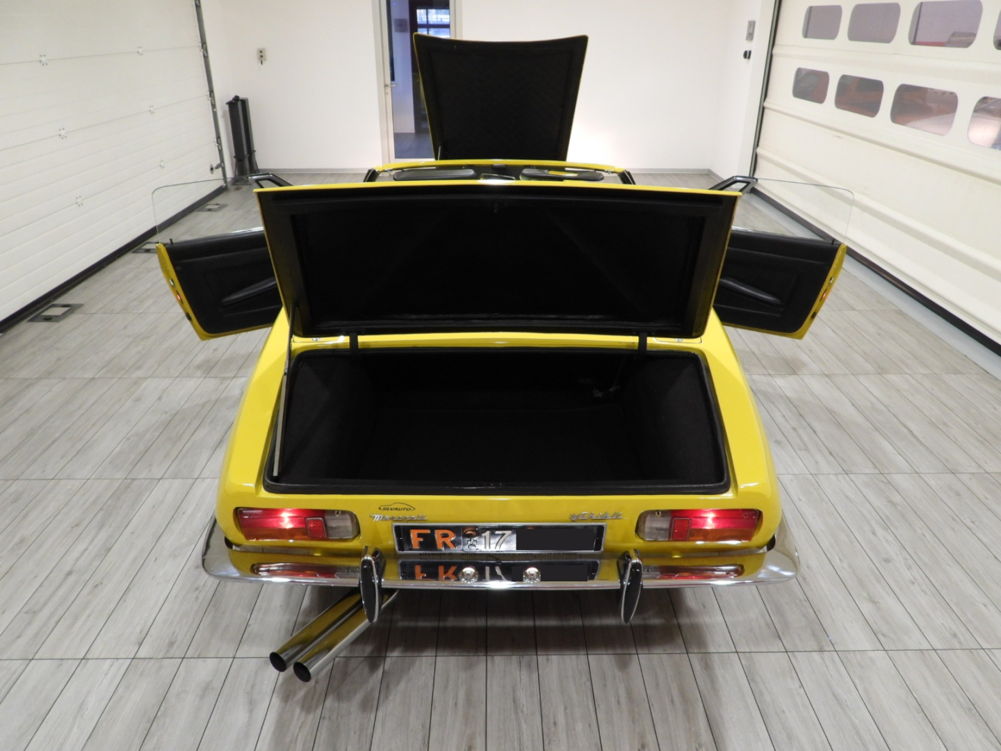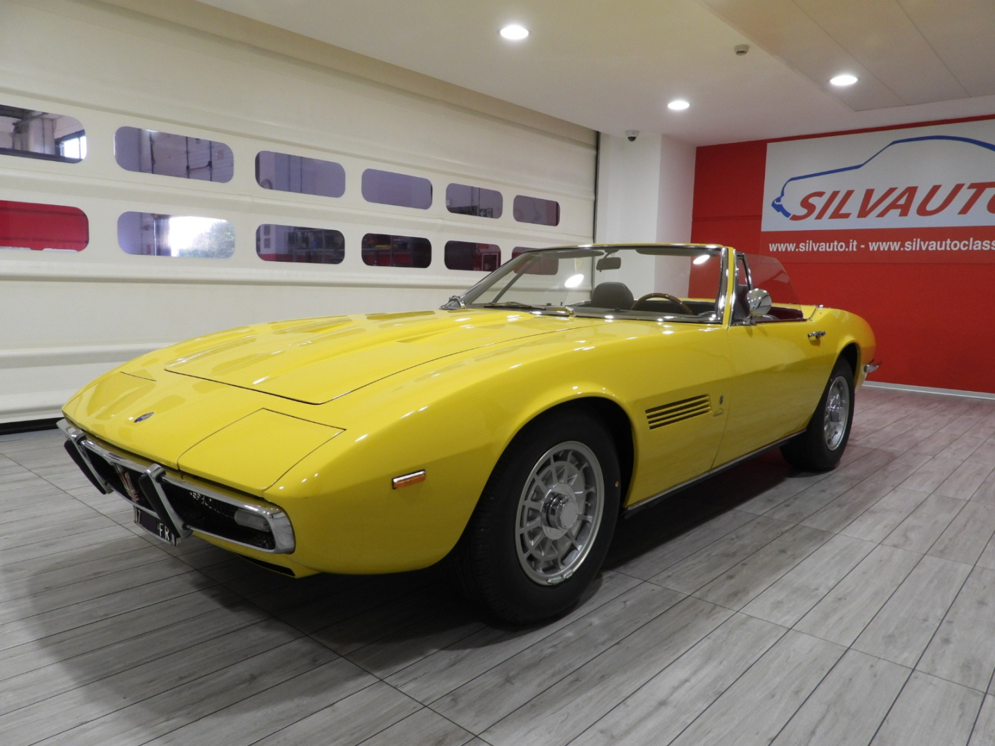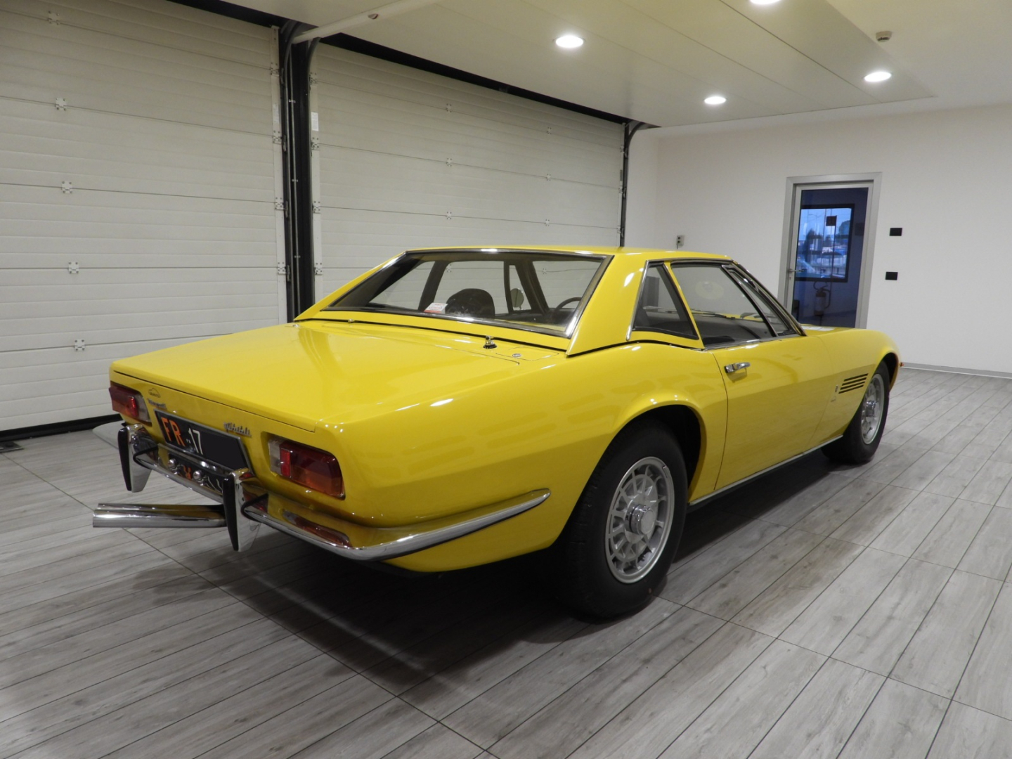 Sièges et panneaux en cuir Connoly noir intégral, volant Maserati à trois branches avec couronne en bois, vitres électriques, 5 jantes en alliage avec écrou à oreilles chromé avec pneus Pirelli GR70VR15, rétroviseur extérieur chromé côté conducteur, capotes en toile noire, toit rigide couleur carrosserie