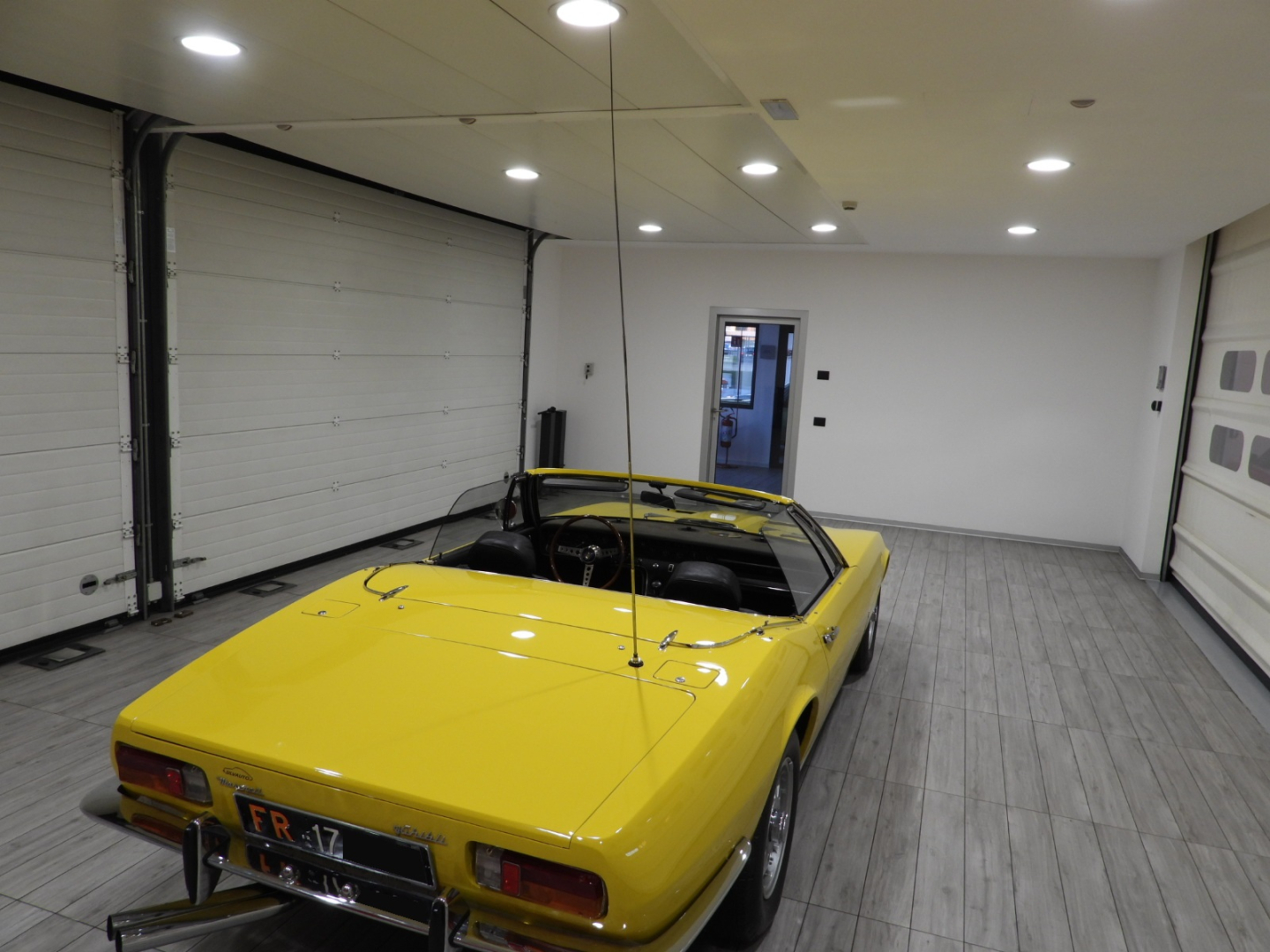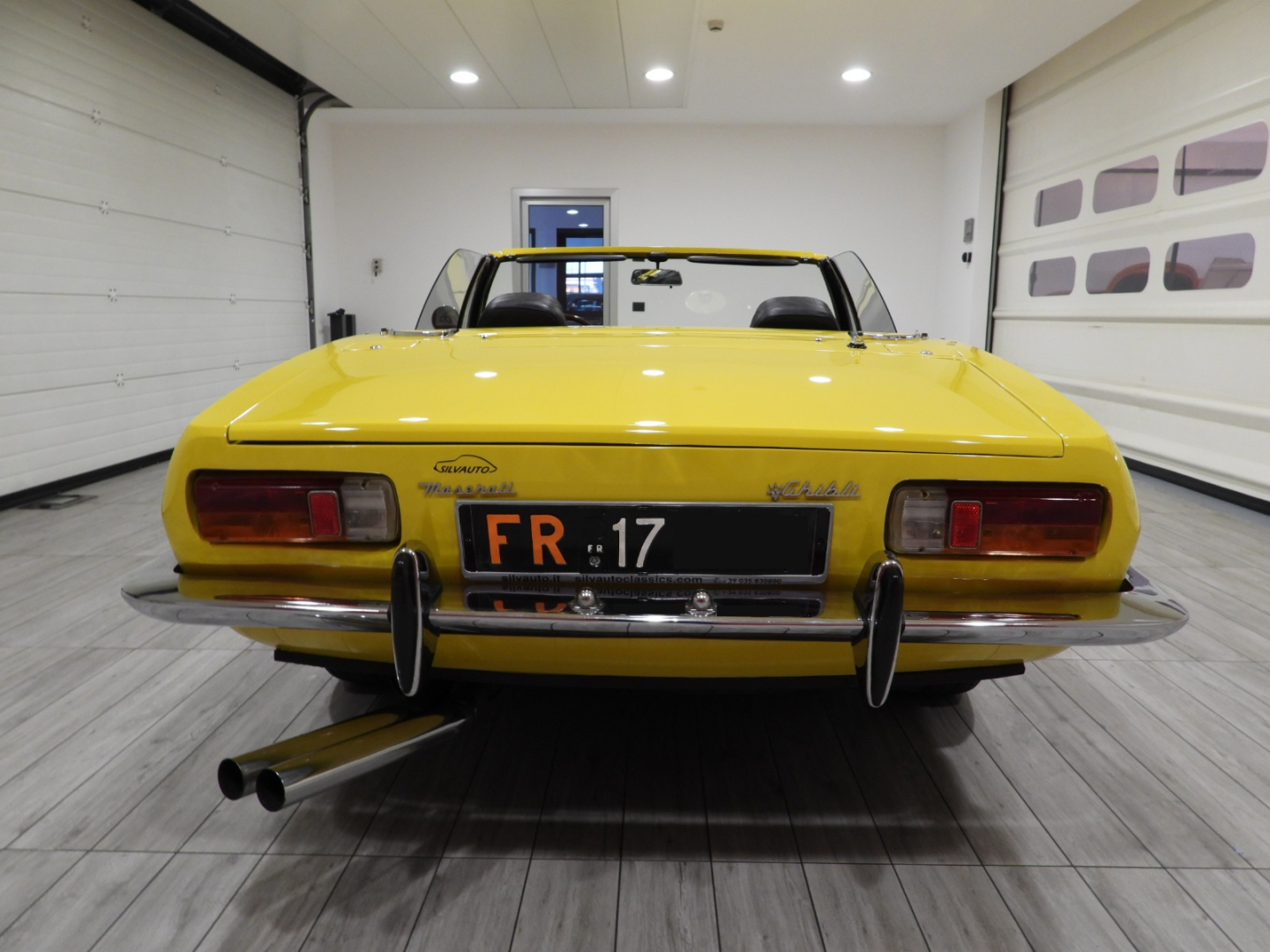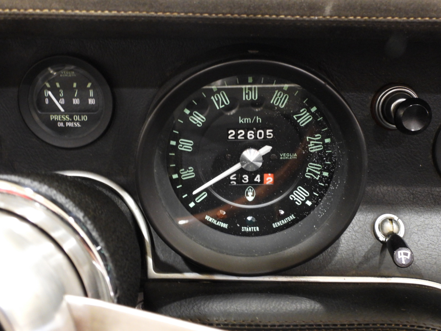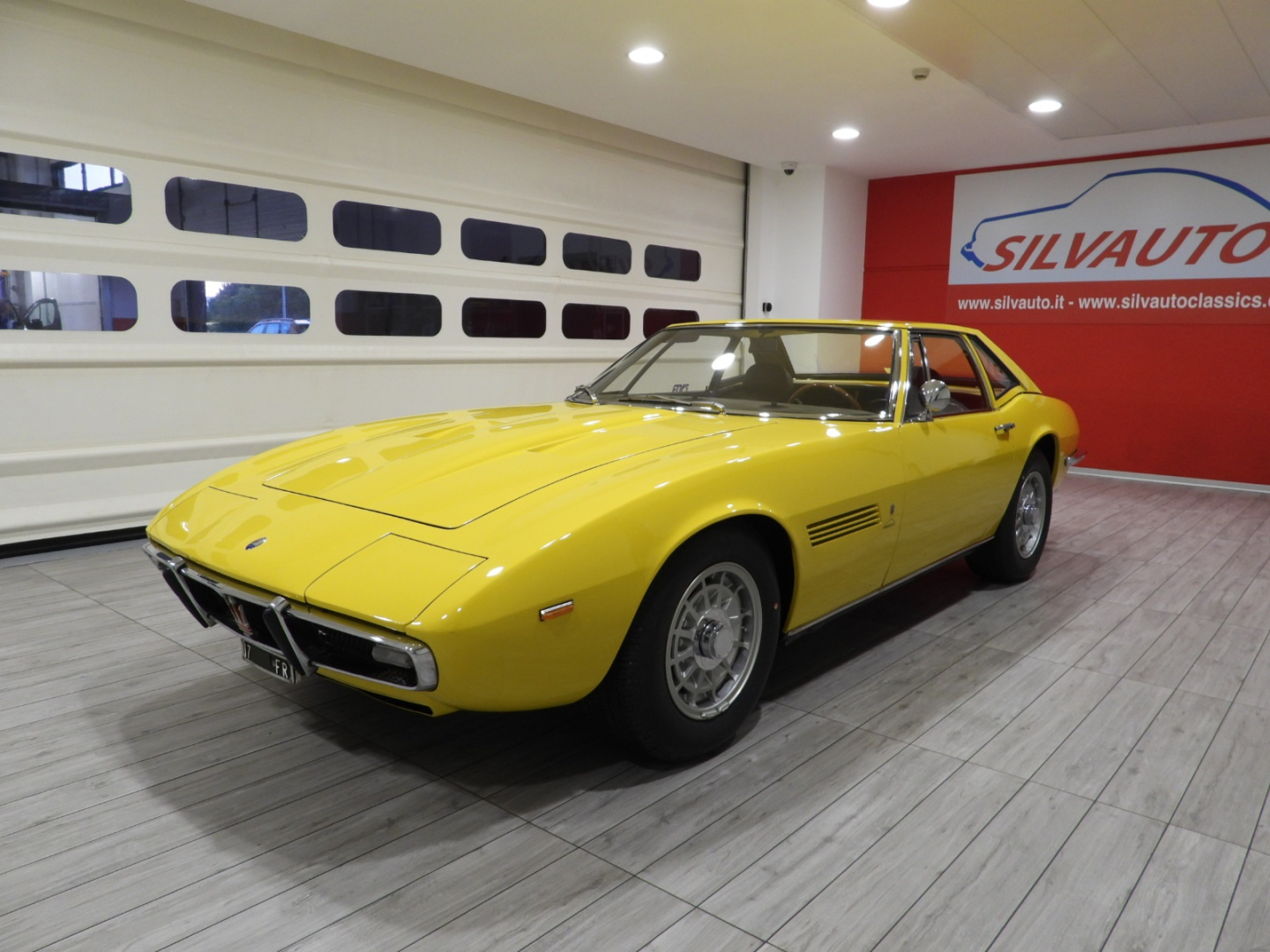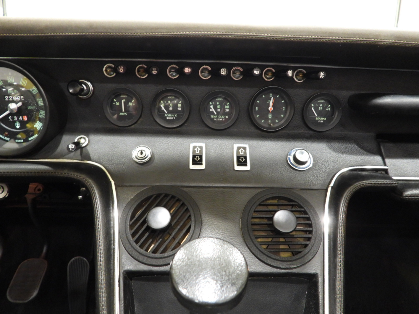 Sièges et panneaux en cuir Connoly noir intégral, volant Maserati à trois branches avec couronne en bois, vitres électriques, 5 jantes en alliage avec écrou à oreilles chromé avec pneus Pirelli GR70VR15, rétroviseur extérieur chromé côté conducteur, capotes en toile noire, toit rigide couleur carrosserie