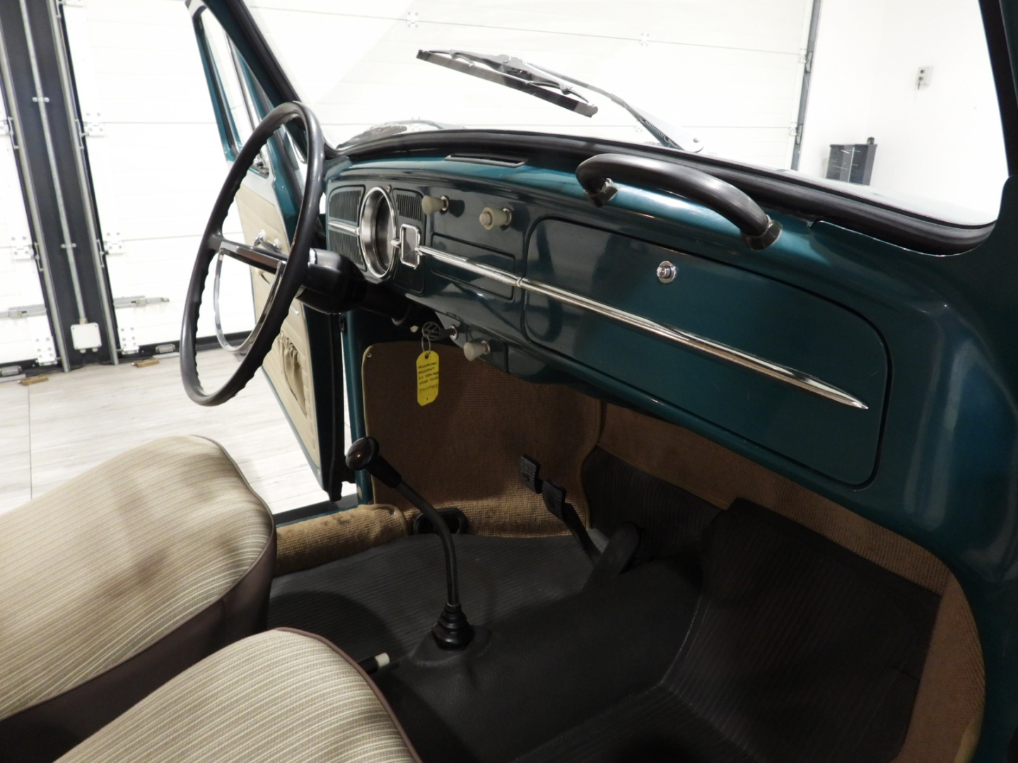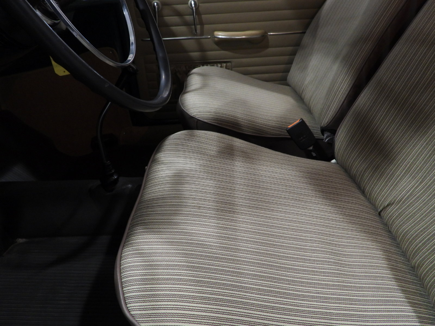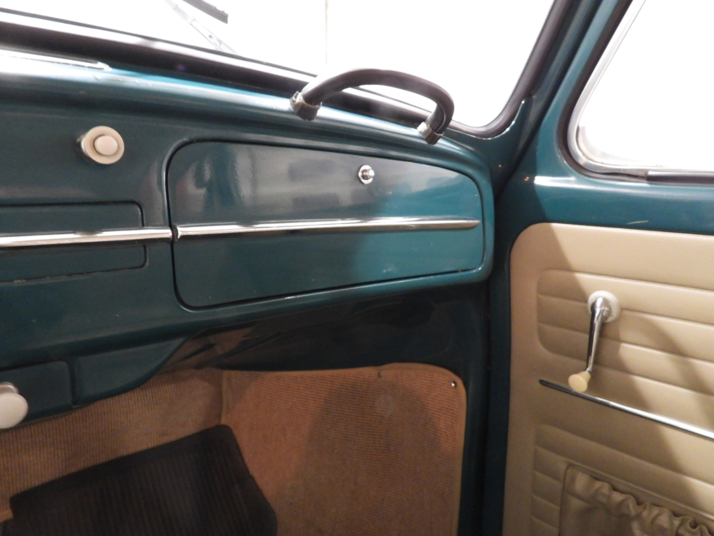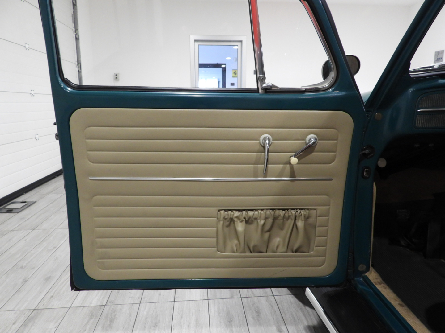 Sièges en tissu beige, Panneaux de ciel beiges, Moquette bouclet beige au sol, Rétroviseur extérieur chromé côté conducteur, Jantes en fer avec capuchons chromés VW, Pare-chocs avec enjoliveurs chromés, Tableau de bord en fer de la couleur de la carrosserie