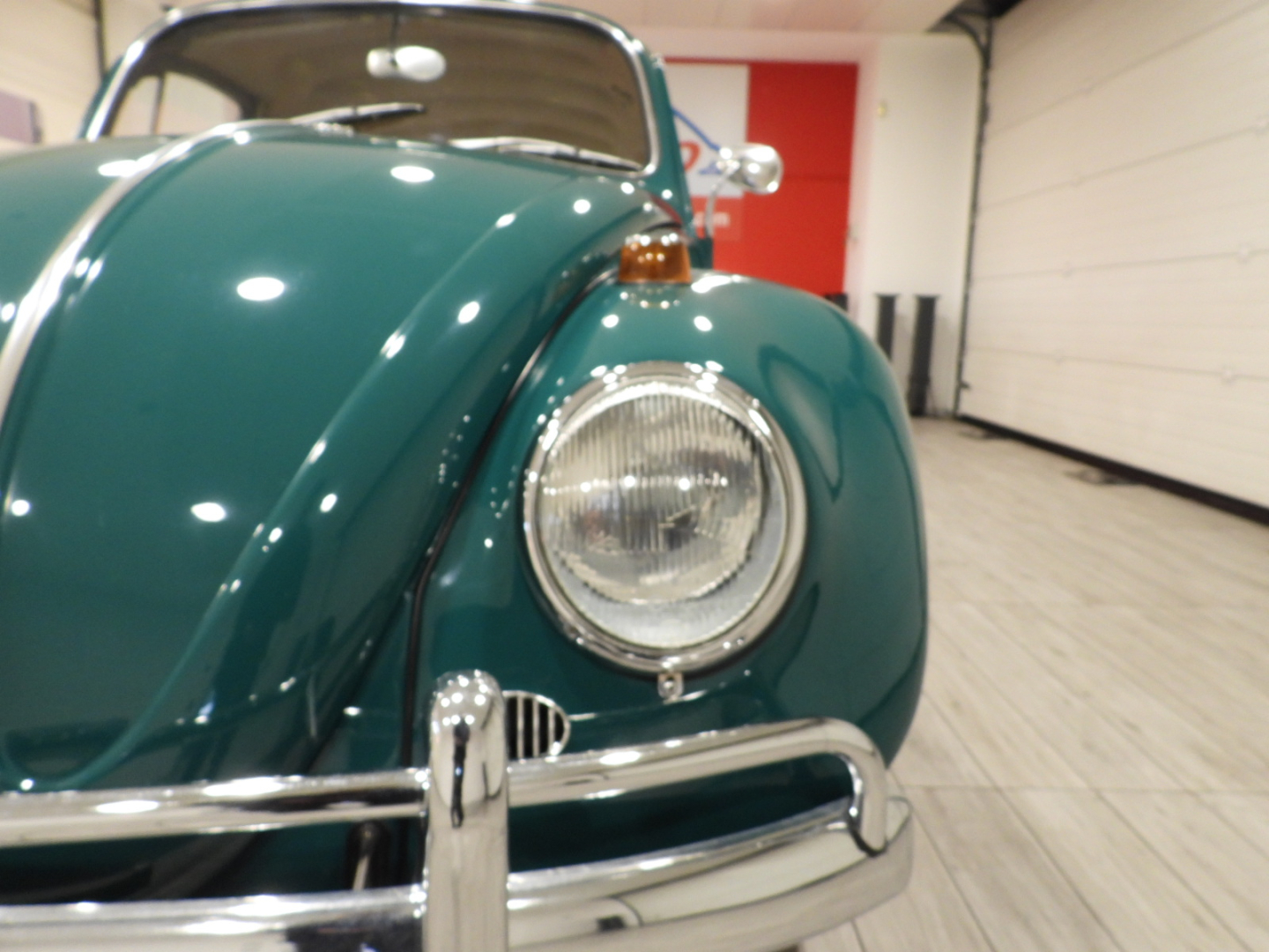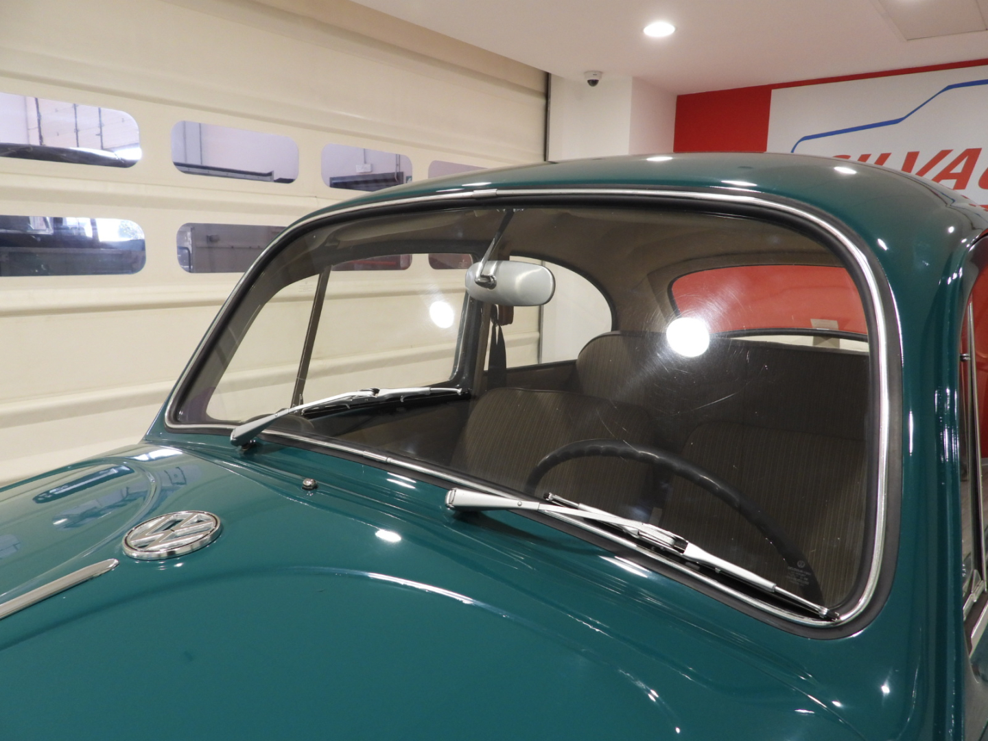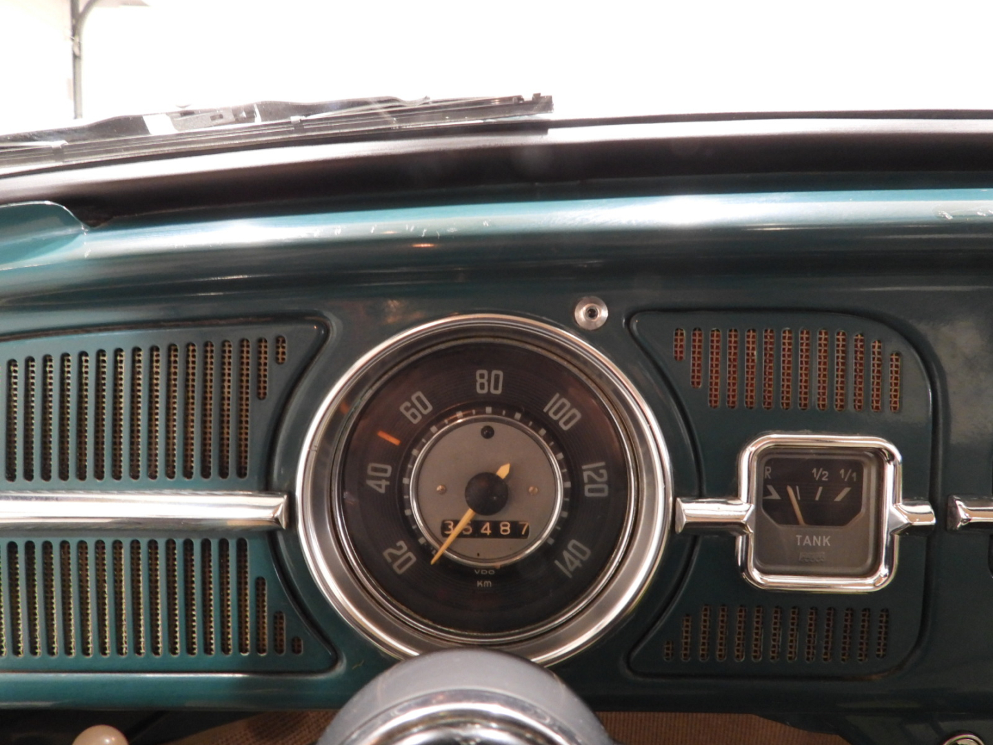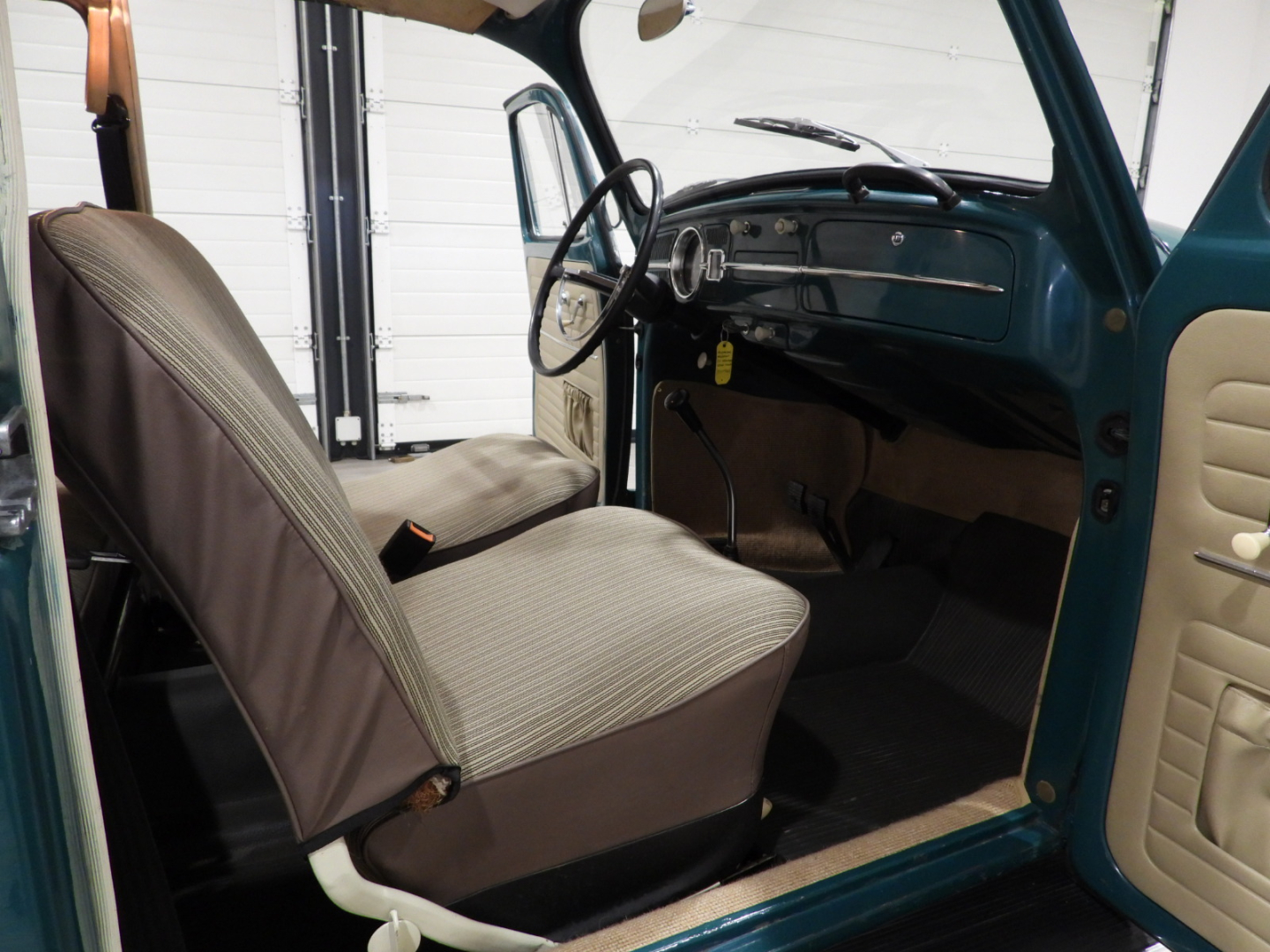 Sièges en tissu beige, Panneaux de ciel beiges, Moquette bouclet beige au sol, Rétroviseur extérieur chromé côté conducteur, Jantes en fer avec capuchons chromés VW, Pare-chocs avec enjoliveurs chromés, Tableau de bord en fer de la couleur de la carrosserie
