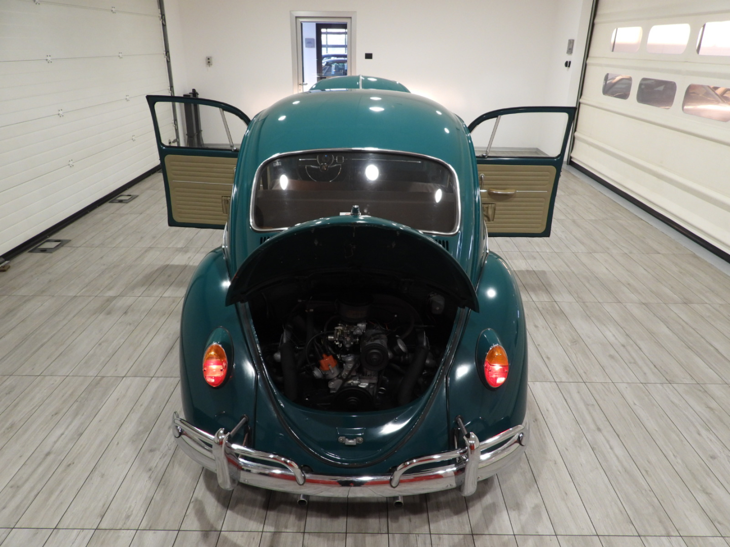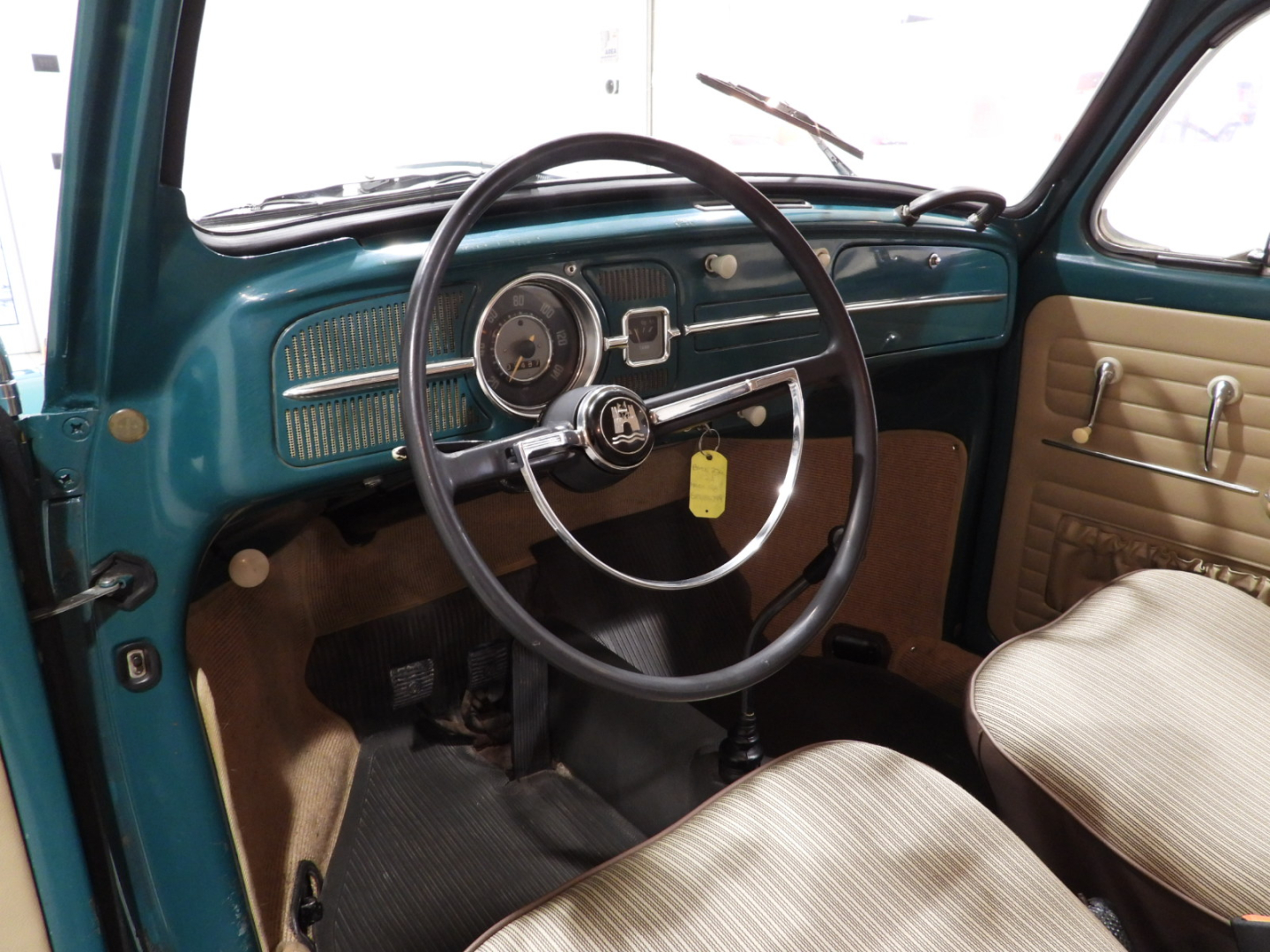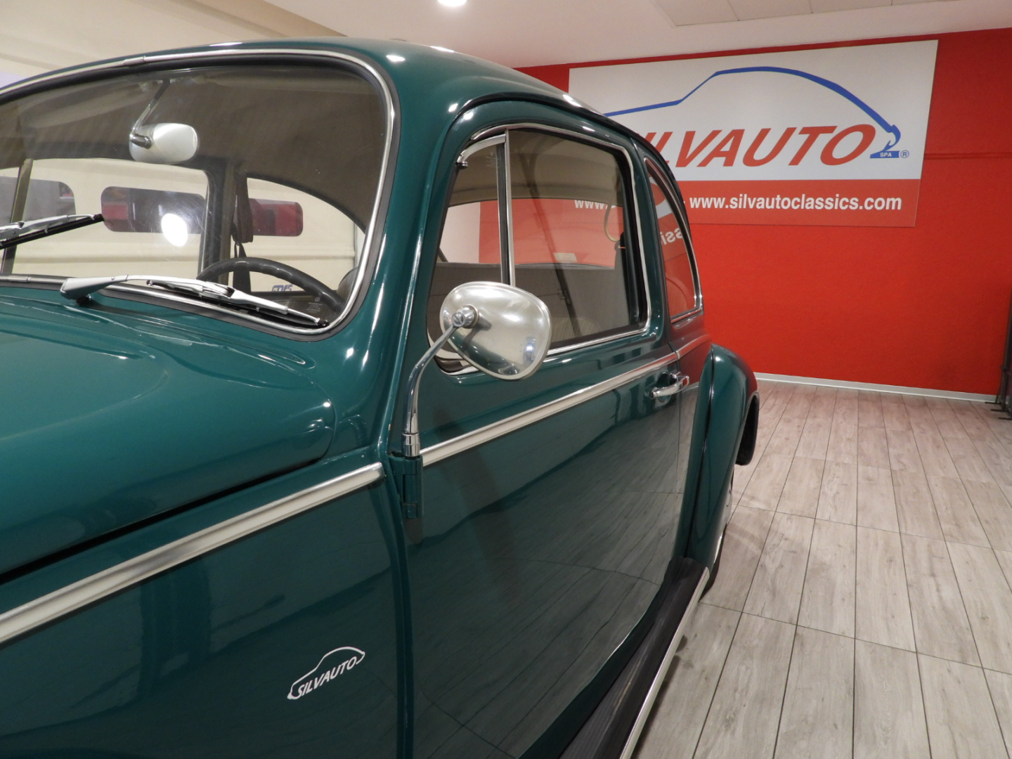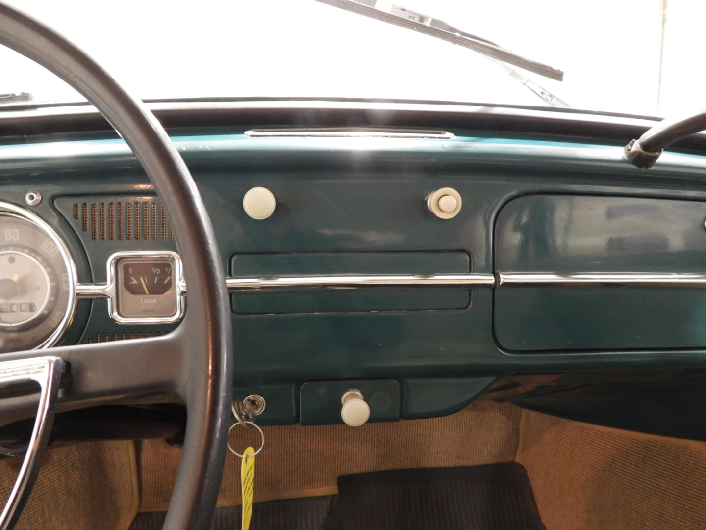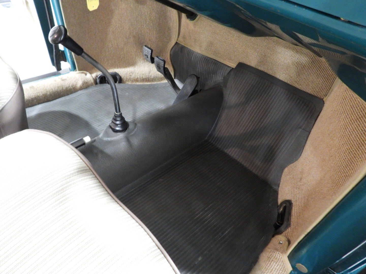 Sièges en tissu beige, Panneaux de ciel beiges, Moquette bouclet beige au sol, Rétroviseur extérieur chromé côté conducteur, Jantes en fer avec capuchons chromés VW, Pare-chocs avec enjoliveurs chromés, Tableau de bord en fer de la couleur de la carrosserie