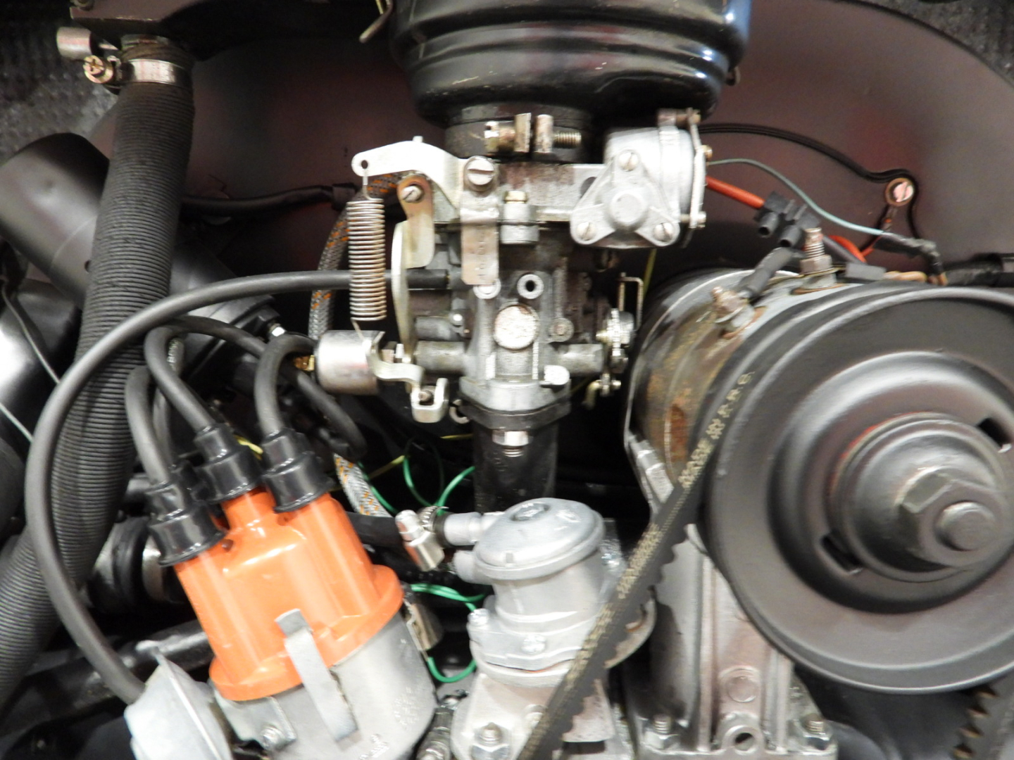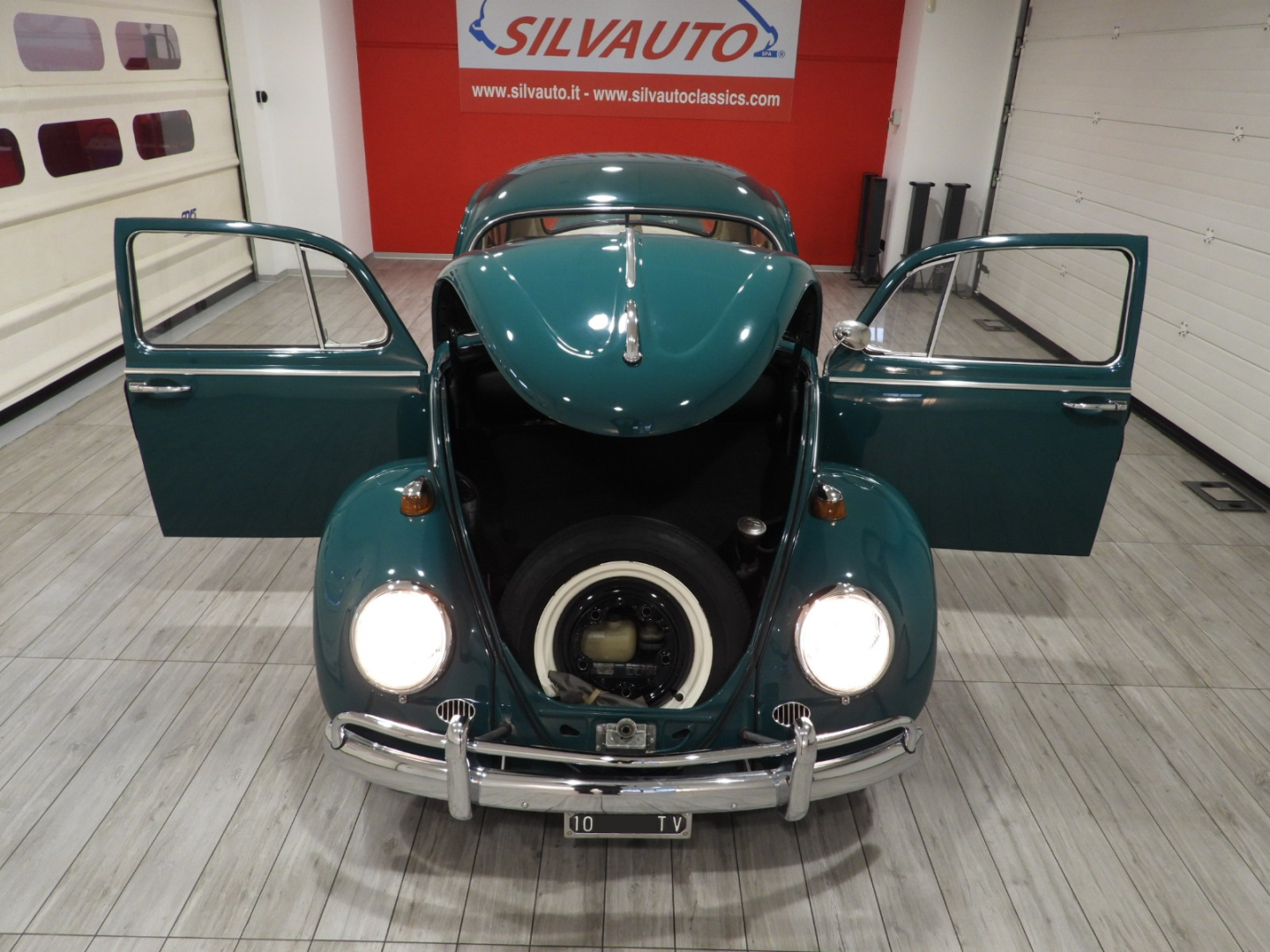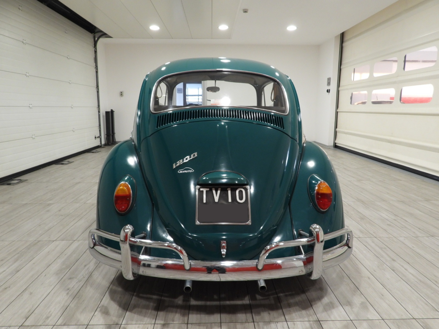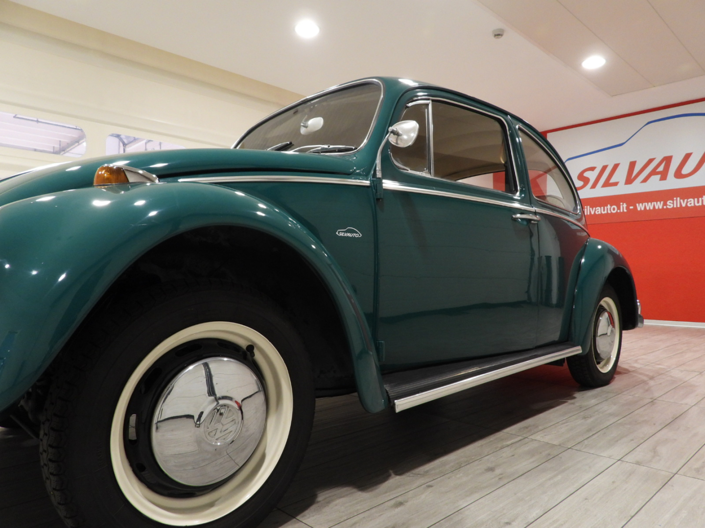 Sièges en tissu beige, Panneaux de ciel beiges, Moquette bouclet beige au sol, Rétroviseur extérieur chromé côté conducteur, Jantes en fer avec capuchons chromés VW, Pare-chocs avec enjoliveurs chromés, Tableau de bord en fer de la couleur de la carrosserie